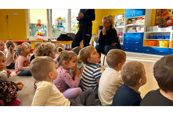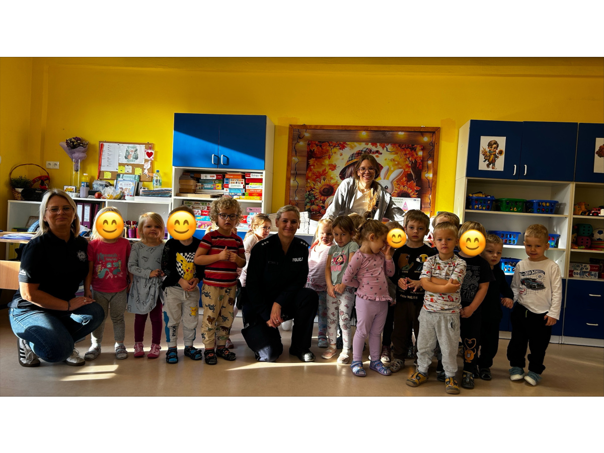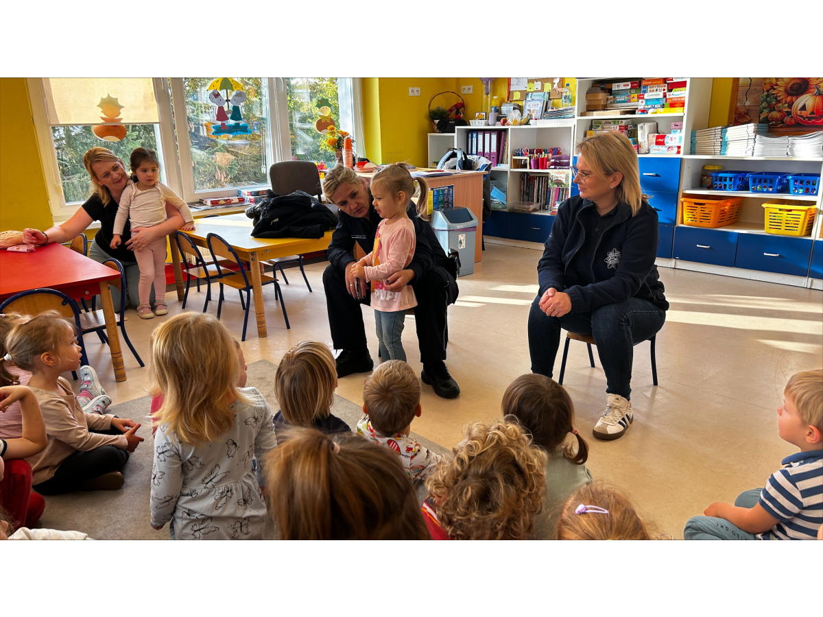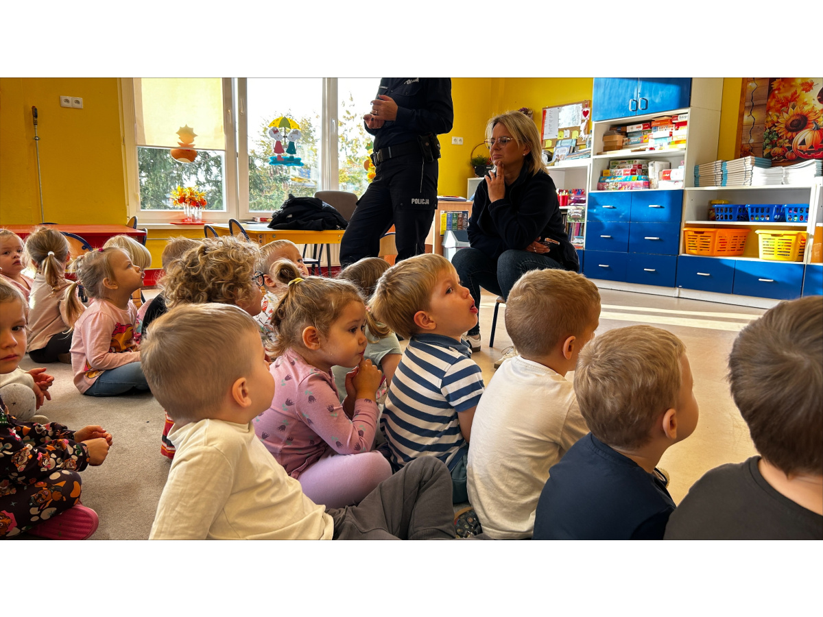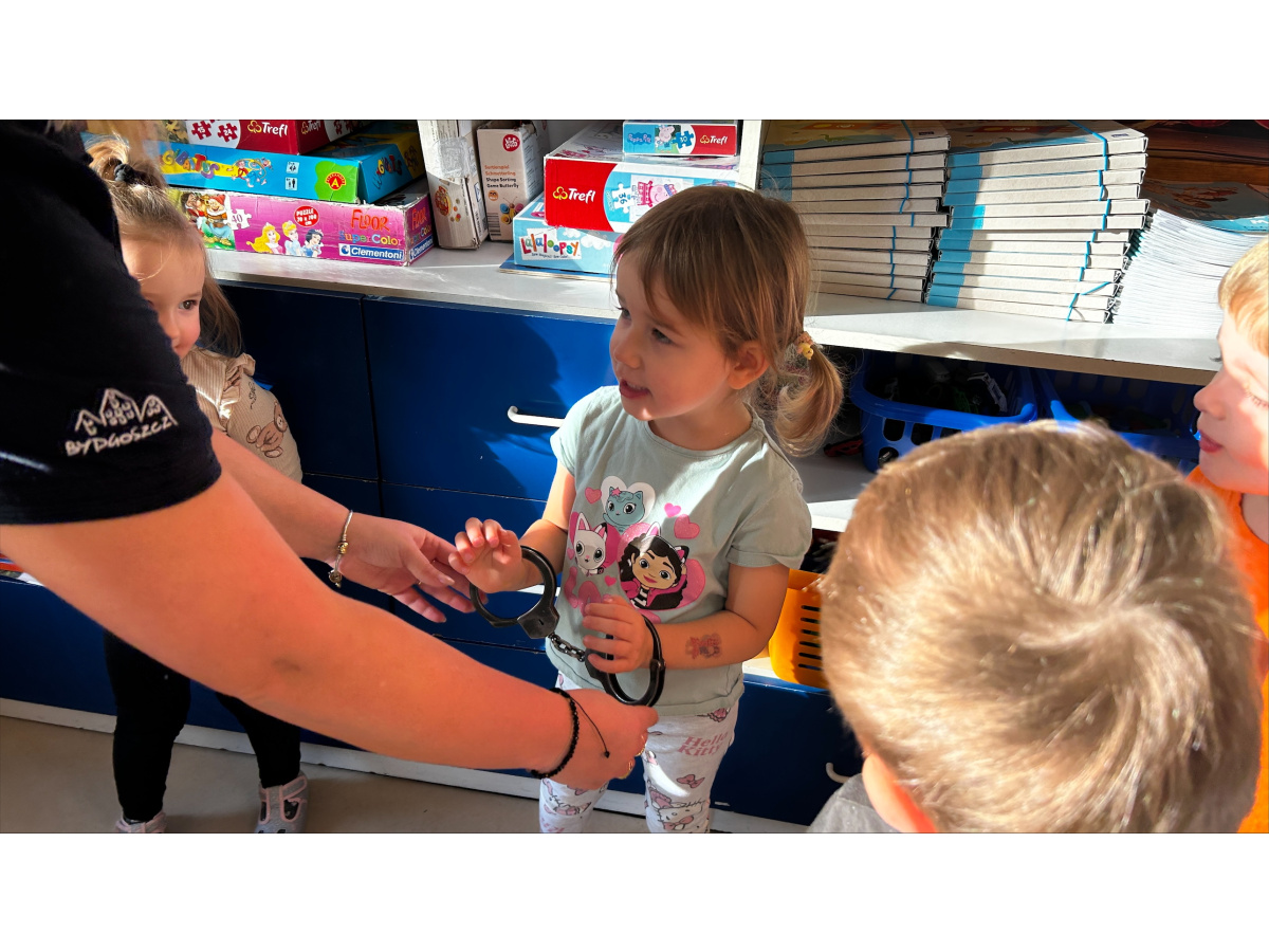 Przedszkolaki dowiedziały się, jak bezpiecznie poruszać się po drodze- przechodzić przez pasy, patrząc lewo, prawo, lewo, i dlaczego warto zawsze być zapiętym w foteliku. Na zakończenie spotkania chętne dzieci mogły założyć policyjne kajdanki, co wzbudziło wiele emocji i ciekawości!