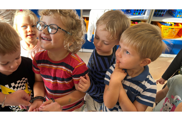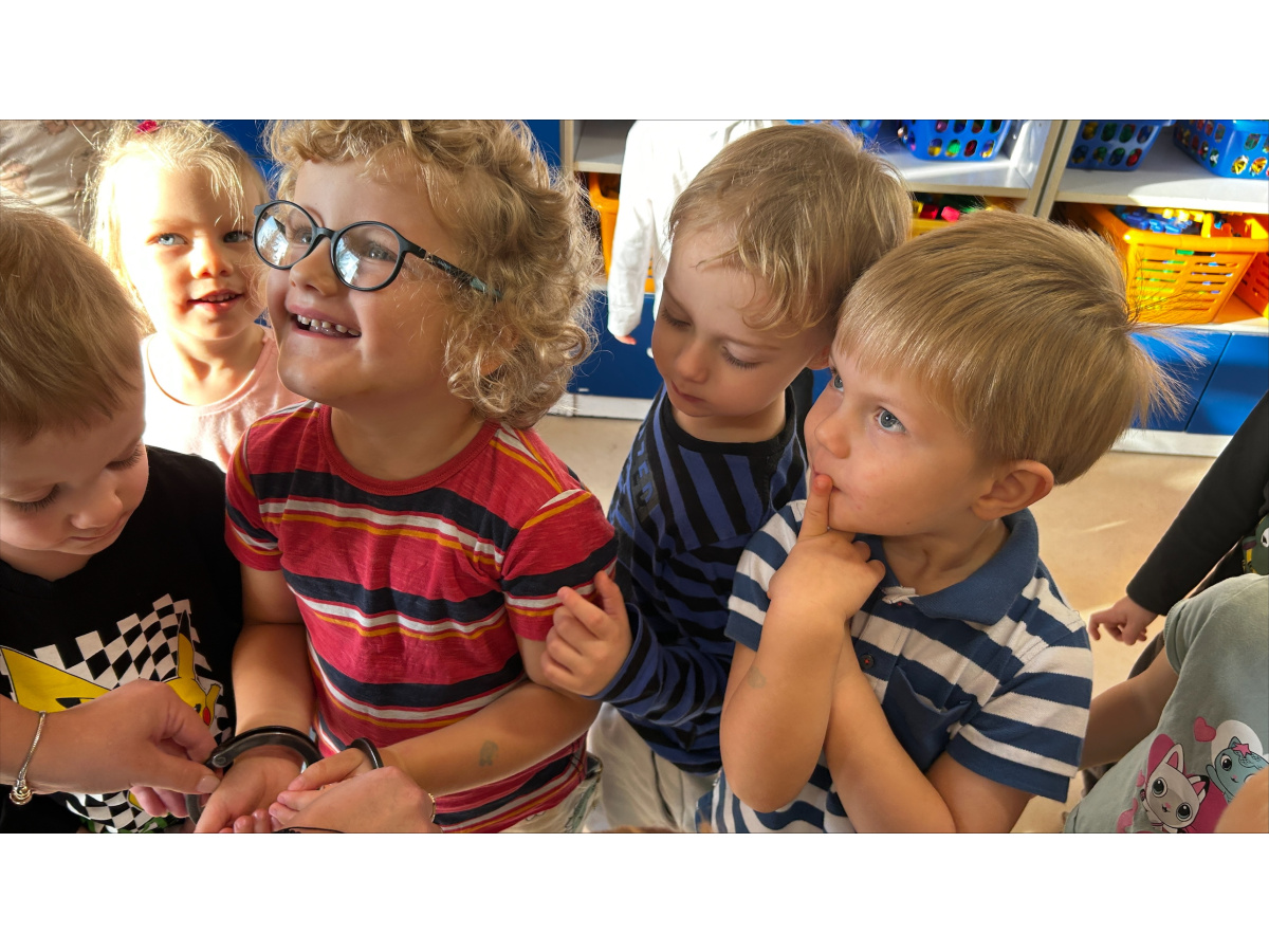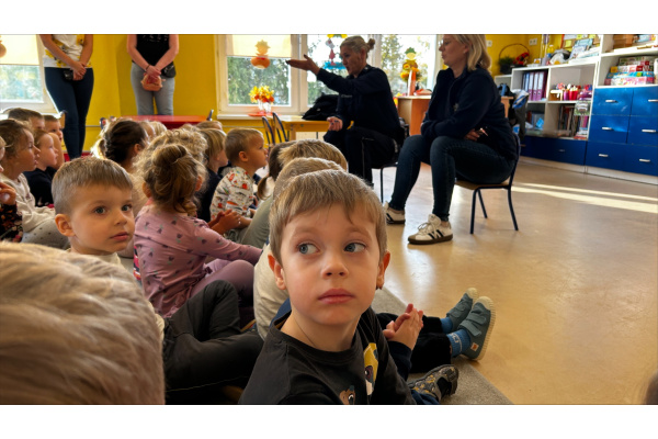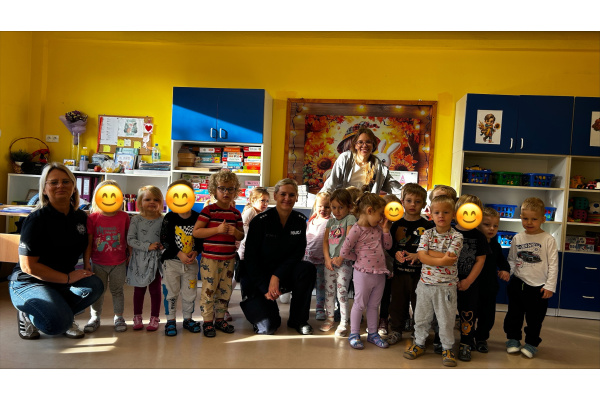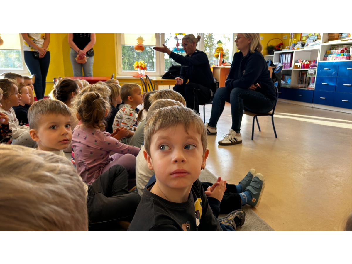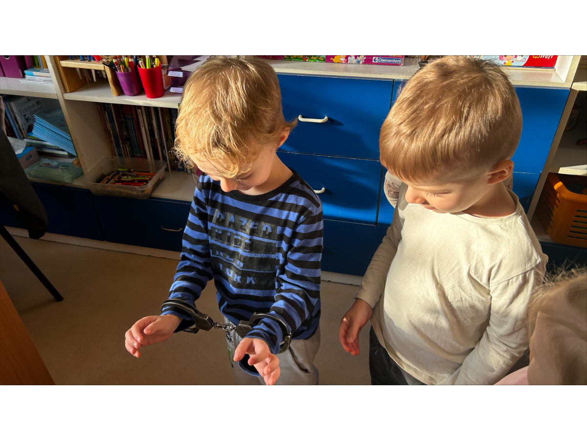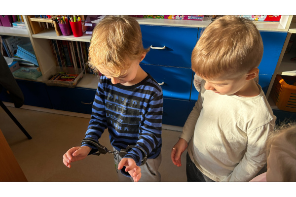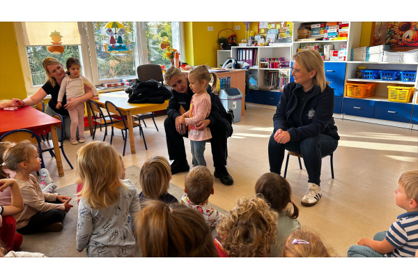 Przedszkolaki dowiedziały się, jak bezpiecznie poruszać się po drodze- przechodzić przez pasy, patrząc lewo, prawo, lewo, i dlaczego warto zawsze być zapiętym w foteliku. Na zakończenie spotkania chętne dzieci mogły założyć policyjne kajdanki, co wzbudziło wiele emocji i ciekawości!