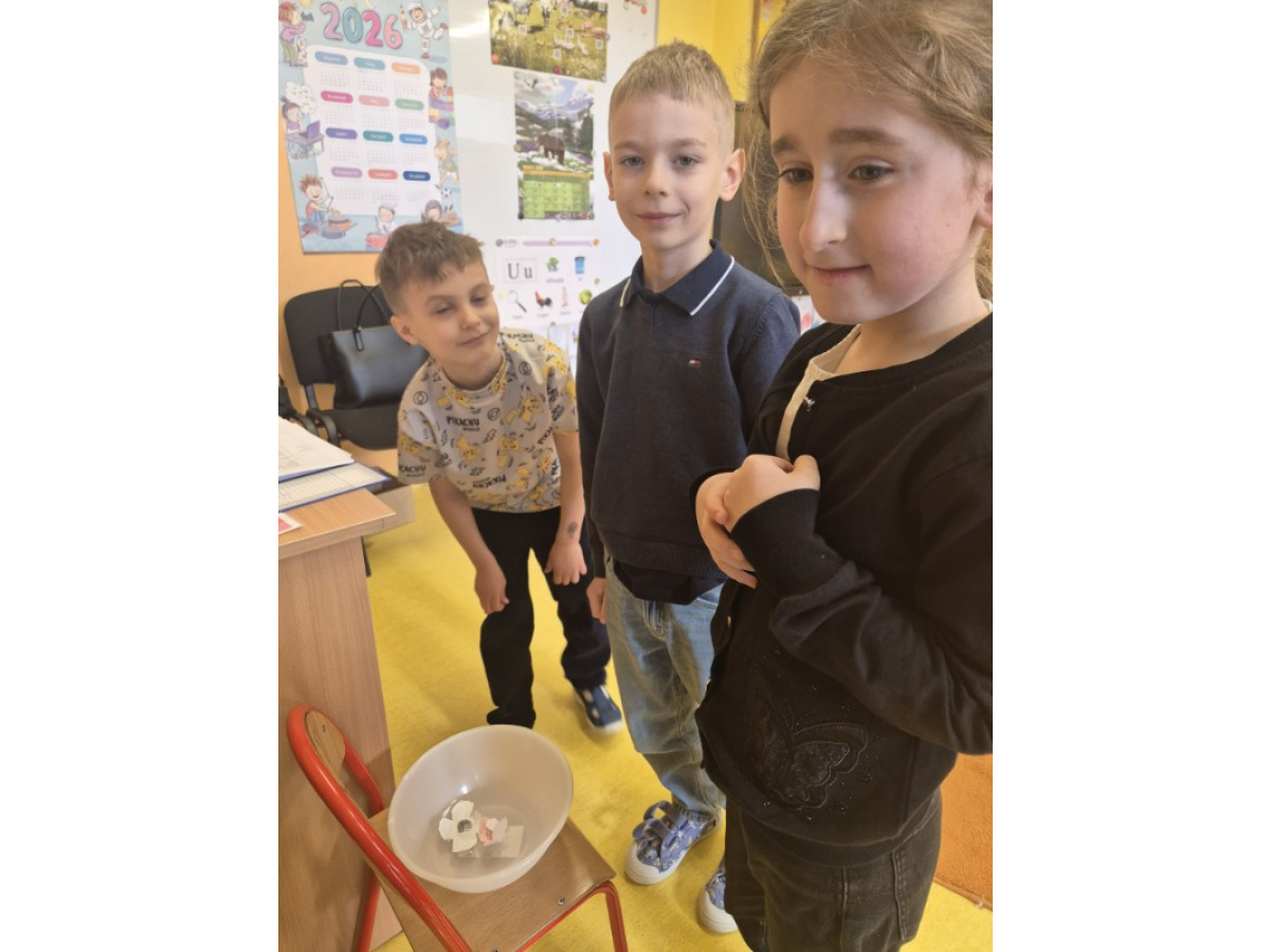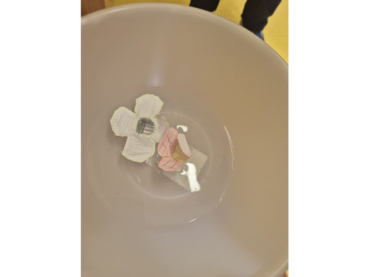 Dzieci z papieru wykonały kwiatki, których płatki były zagięte do środka. Następnie położyliśmy je na powierzchni wody i obserwowaliśmy, co się wydarzy. Po chwili płatki zaczęły się powoli rozchylać, tworząc piękne, „rozkwitające” kwiaty. Dzieci z zaciekawieniem śledziły przebieg doświadczenia i wspólnie wyciągnęły wnioski, że papier pod wpływem wody się rozprostowuje. Była to doskonała okazja do rozwijania ciekawości poznawczej i nauki poprzez zabawę.