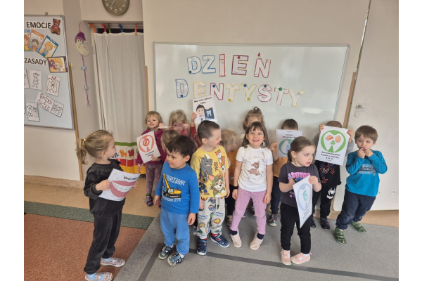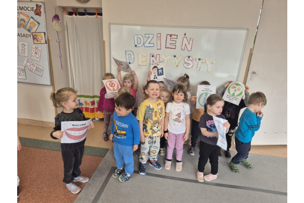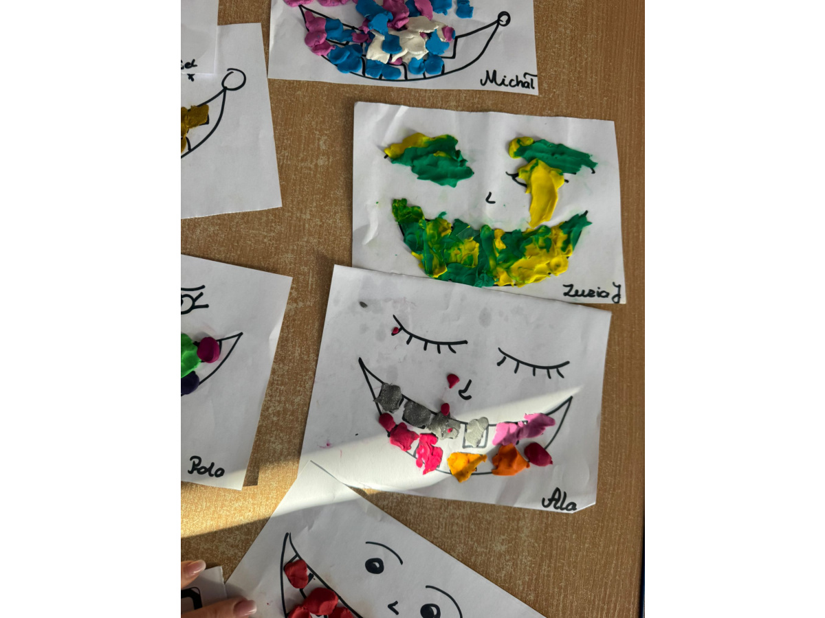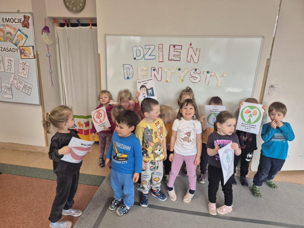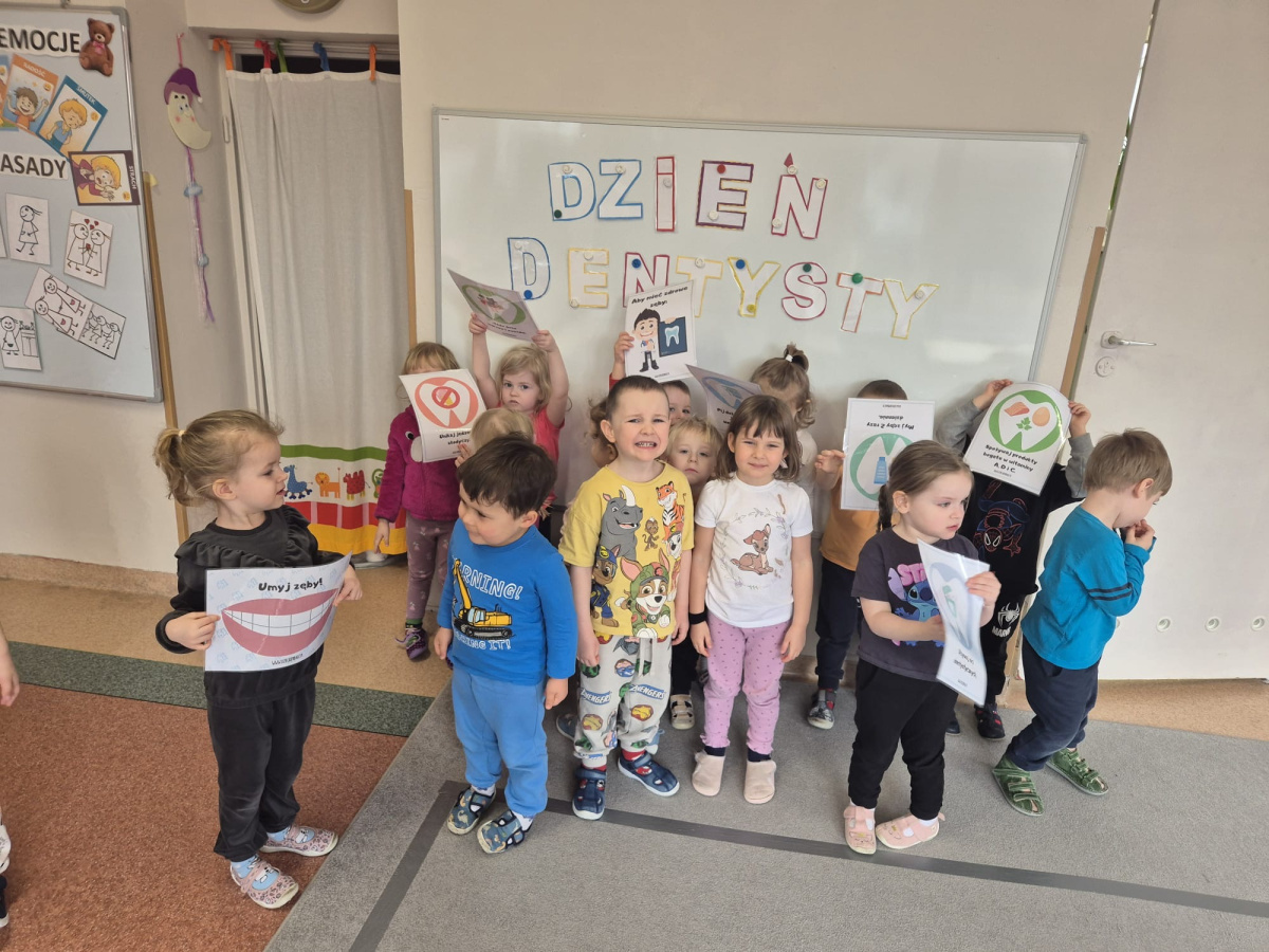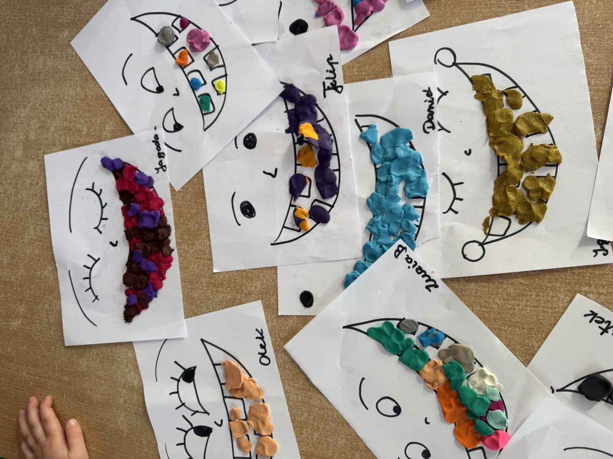 Dzień Dentysty w grupie „Misie” był pełen ciekawych i radosnych aktywności. Dzieci poznały zawód stomatologa oraz dowiedziały się, jak ważna jest codzienna higiena jamy ustnej i dbanie o zęby. Rozmawialiśmy o tym, jak prawidłowo myć zęby i dlaczego warto odwiedzać dentystę. Maluszki rozwijały także swoje zdolności manualne – z plasteliny tworzyły uśmiechy z ząbkami, co sprawiło im wiele radości. Nie zabrakło również elementów matematycznych – dzieci przeliczały zęby w dostępnym dla siebie zakresie. To był bardzo wartościowy dzień, który w przyjazny sposób przybliżył dzieciom temat dbania o zdrowy uśmiech.