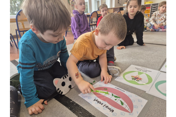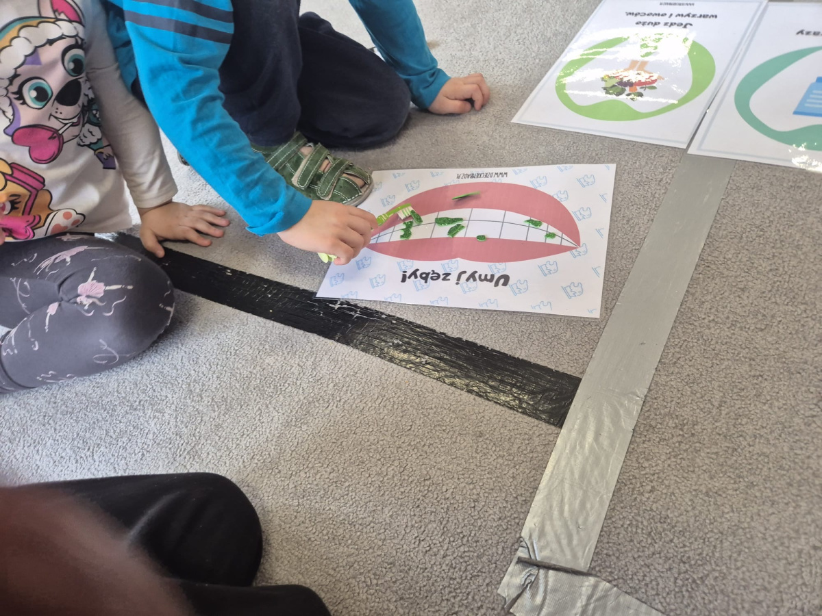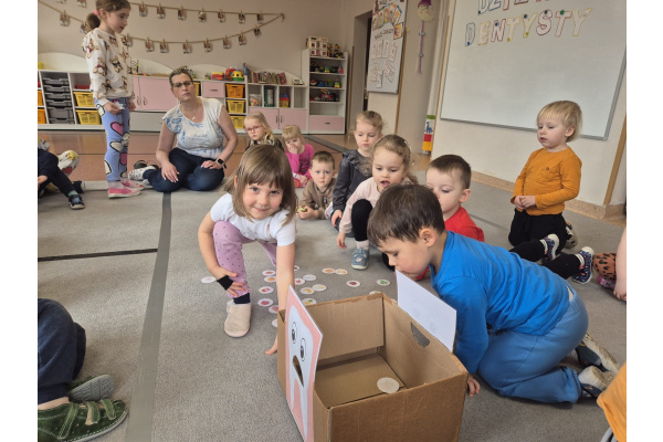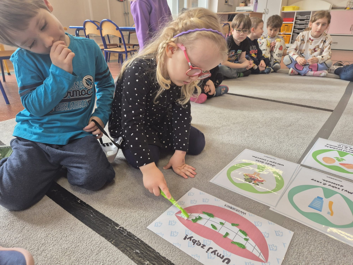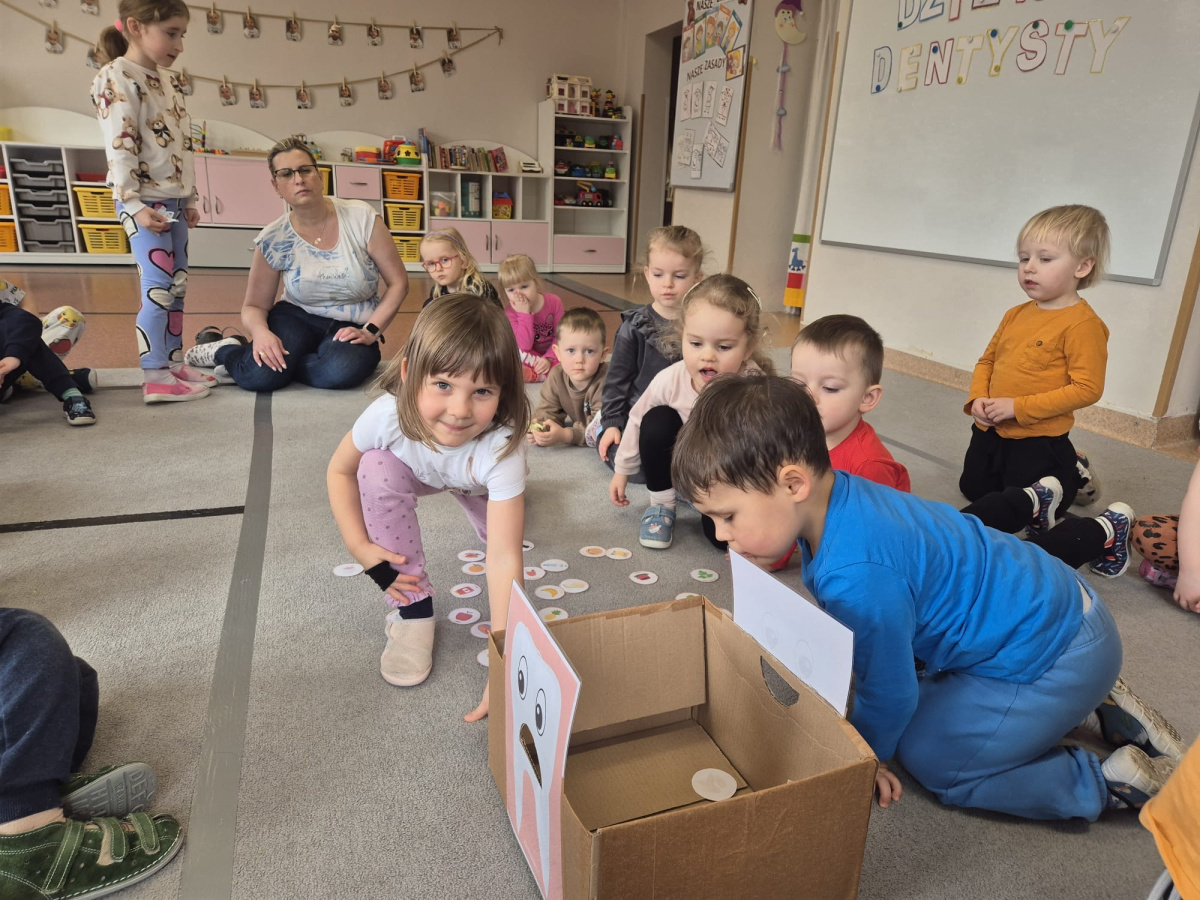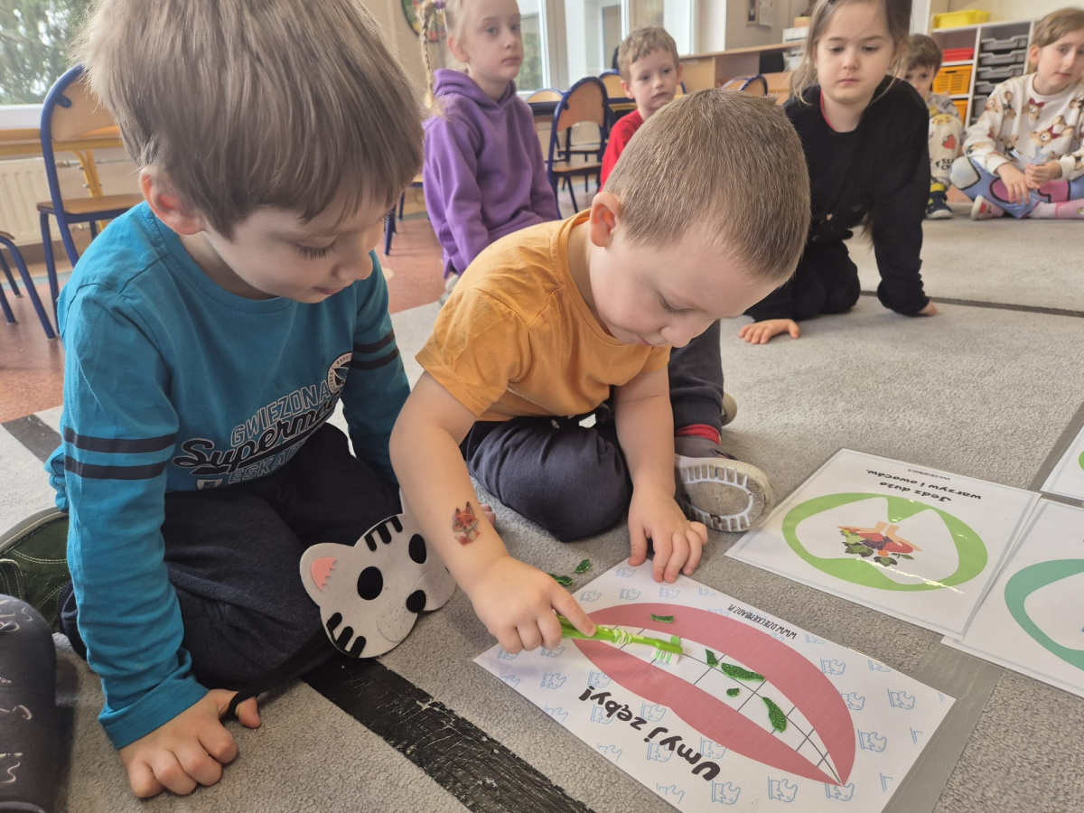 Dzień Dentysty w grupie „Misie” był pełen ciekawych i radosnych aktywności. Dzieci poznały zawód stomatologa oraz dowiedziały się, jak ważna jest codzienna higiena jamy ustnej i dbanie o zęby. Rozmawialiśmy o tym, jak prawidłowo myć zęby i dlaczego warto odwiedzać dentystę. Maluszki rozwijały także swoje zdolności manualne – z plasteliny tworzyły uśmiechy z ząbkami, co sprawiło im wiele radości. Nie zabrakło również elementów matematycznych – dzieci przeliczały zęby w dostępnym dla siebie zakresie. To był bardzo wartościowy dzień, który w przyjazny sposób przybliżył dzieciom temat dbania o zdrowy uśmiech.