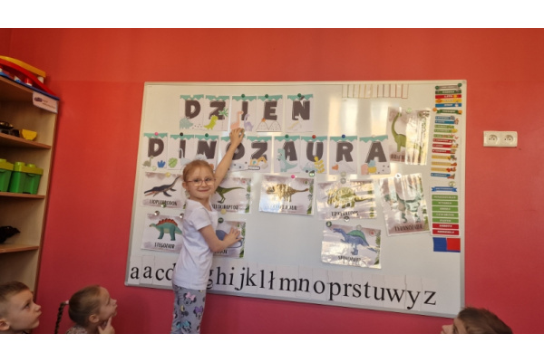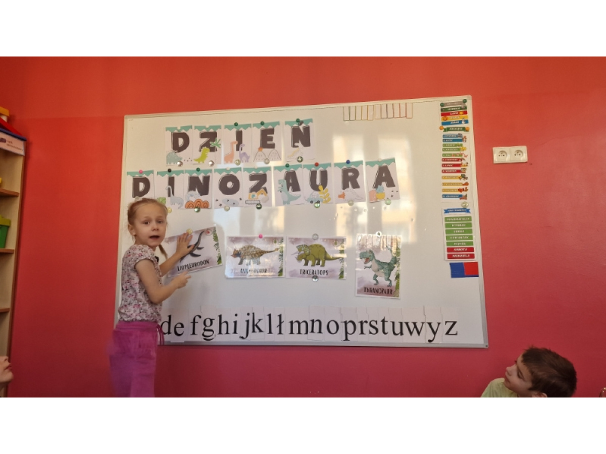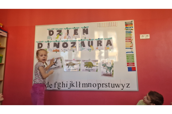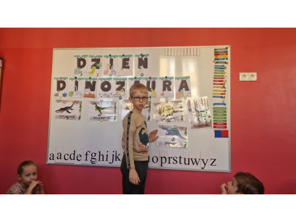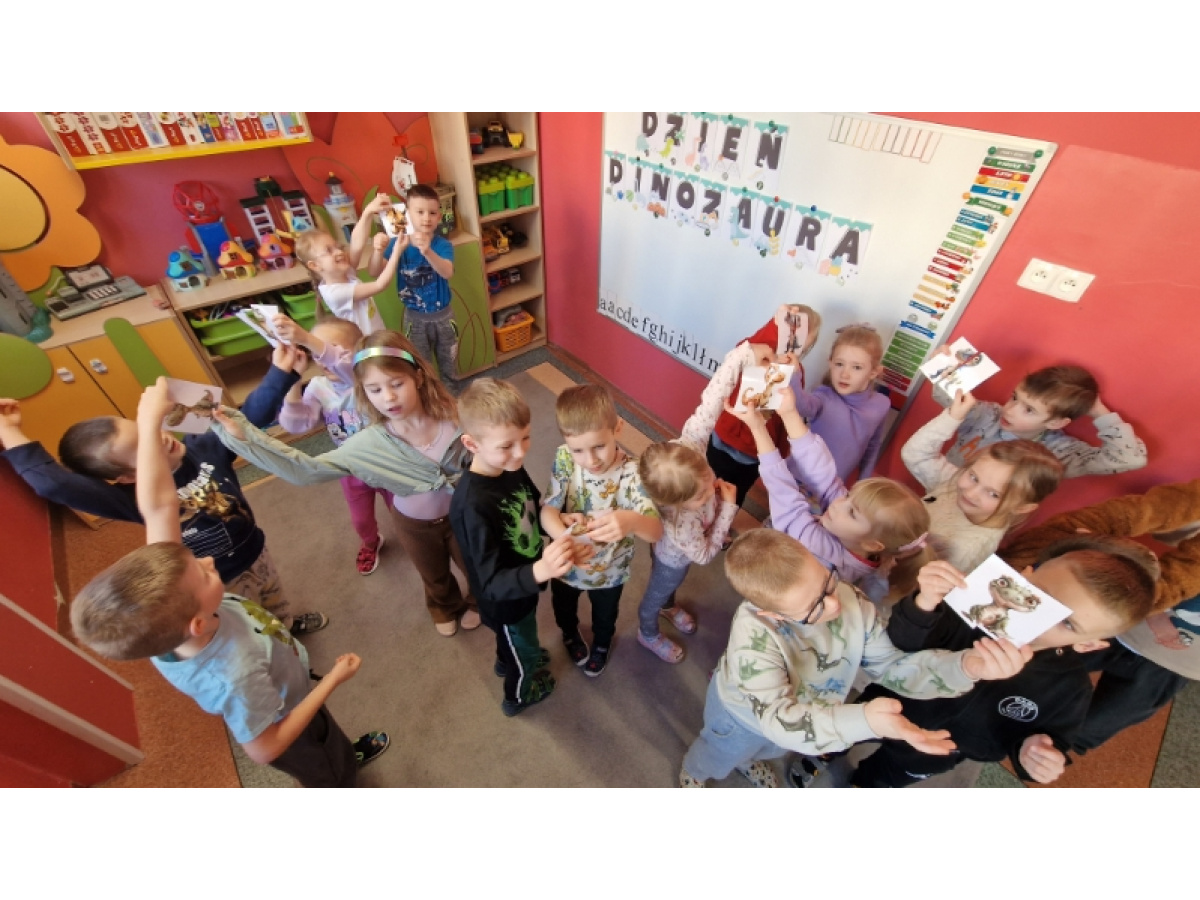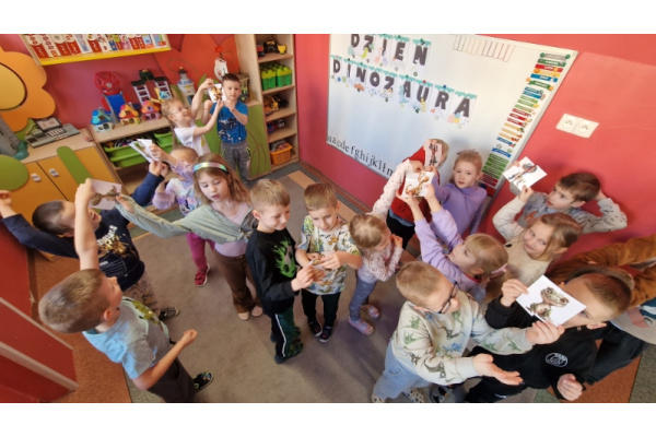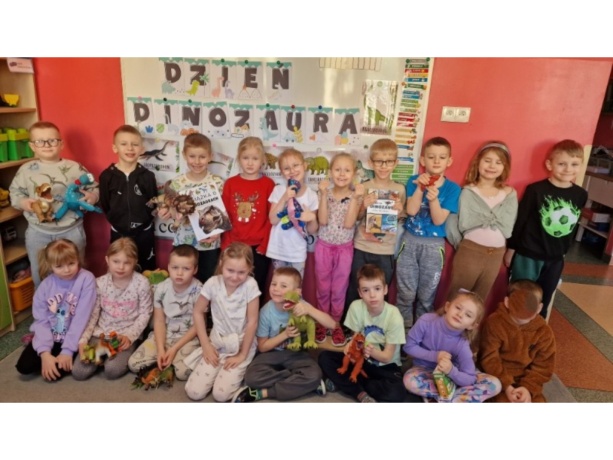 Nasze przedszkolaki przeniosły się w prehistoryczny świat! Dzieci bawiły się, poznawały ciekawostki o dinozaurach i uczestniczyły w tematycznych zabawach. Na zdjęciach widać uśmiechy, kreatywne kostiumy i radosną atmosferę pełną odkryć i przygód. To był dzień pełen śmiechu, zabawy i fascynujących „dinozaurzych” doświadczeń!