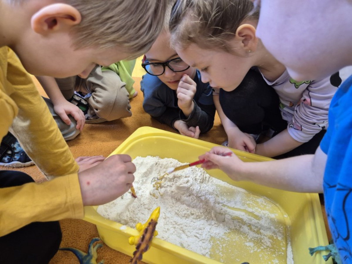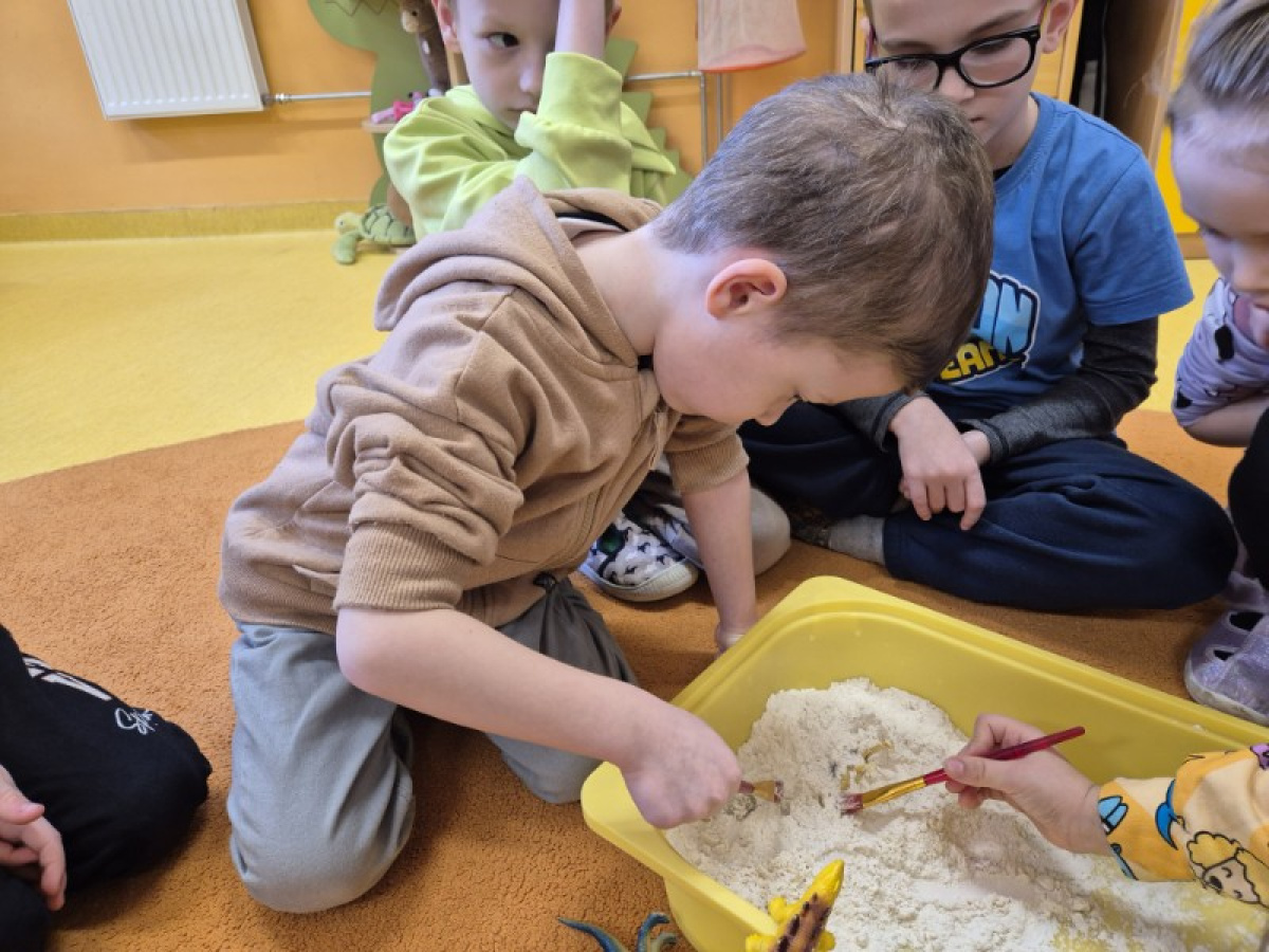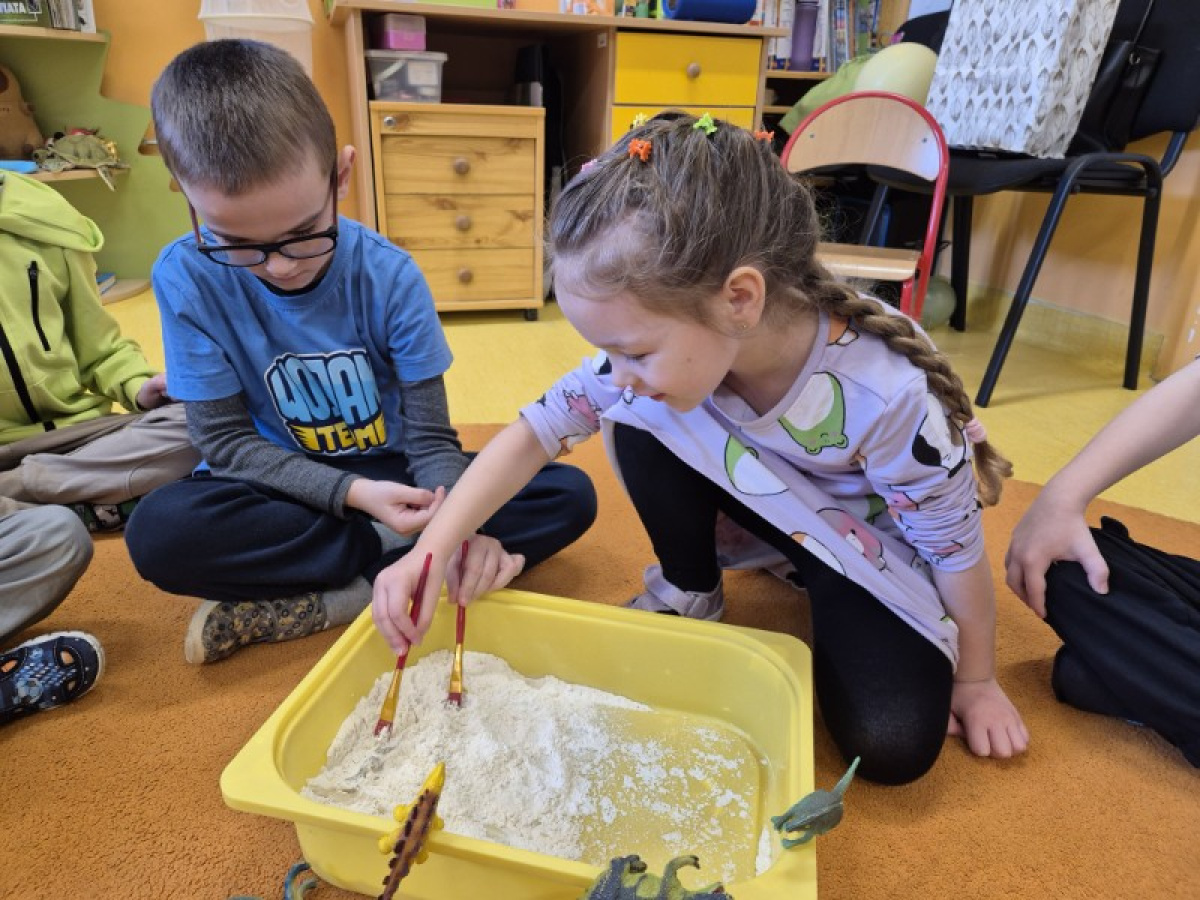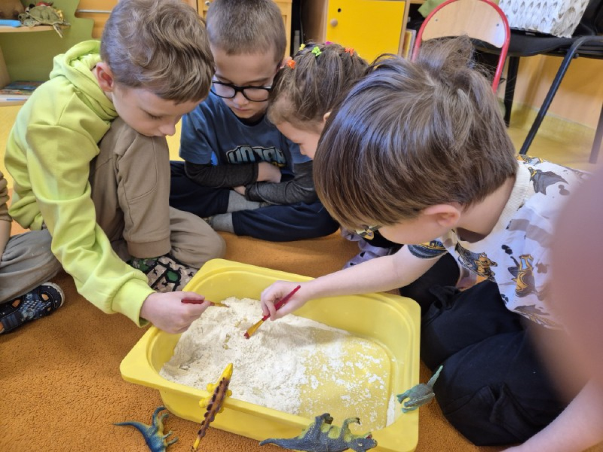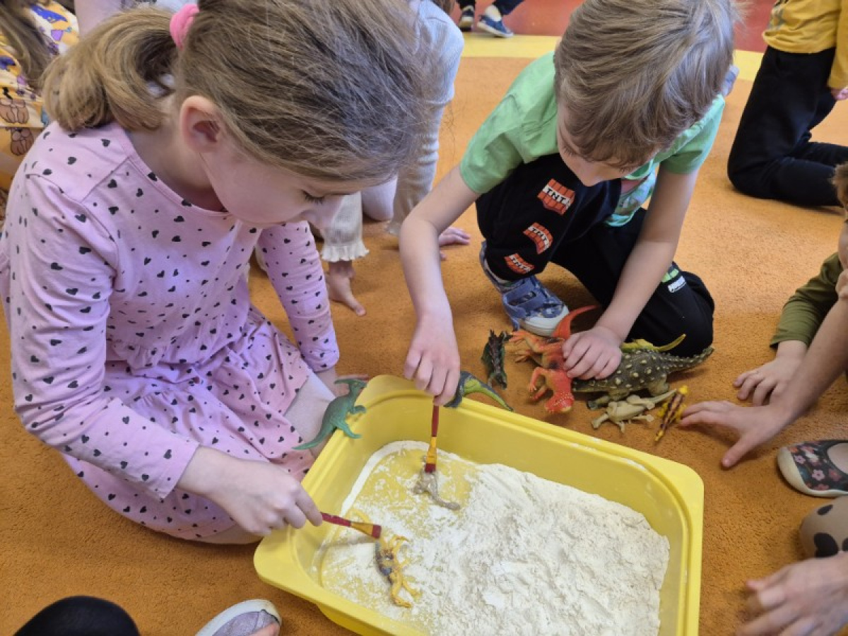 Największą atrakcją dnia była zabawa w paleontologów. Dzieci z ogromnym zaangażowaniem odkopywały „skamieniałości” ukryte w piasku, używając pędzelków i małych łopatek. Każde znalezisko wywoływało wiele emocji i radości, a mali badacze mogli poczuć się jak prawdziwi odkrywcy.
