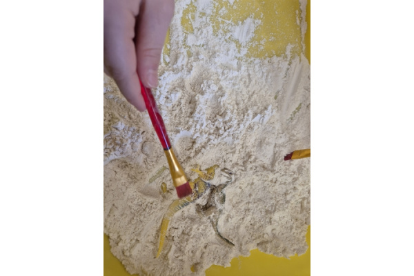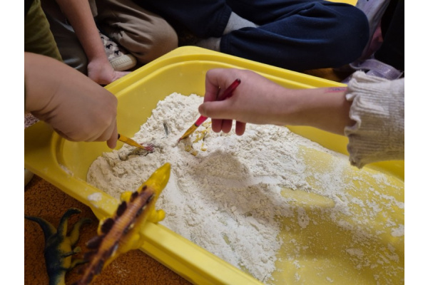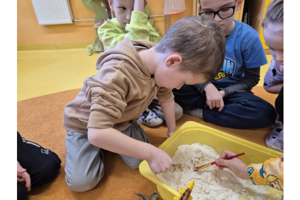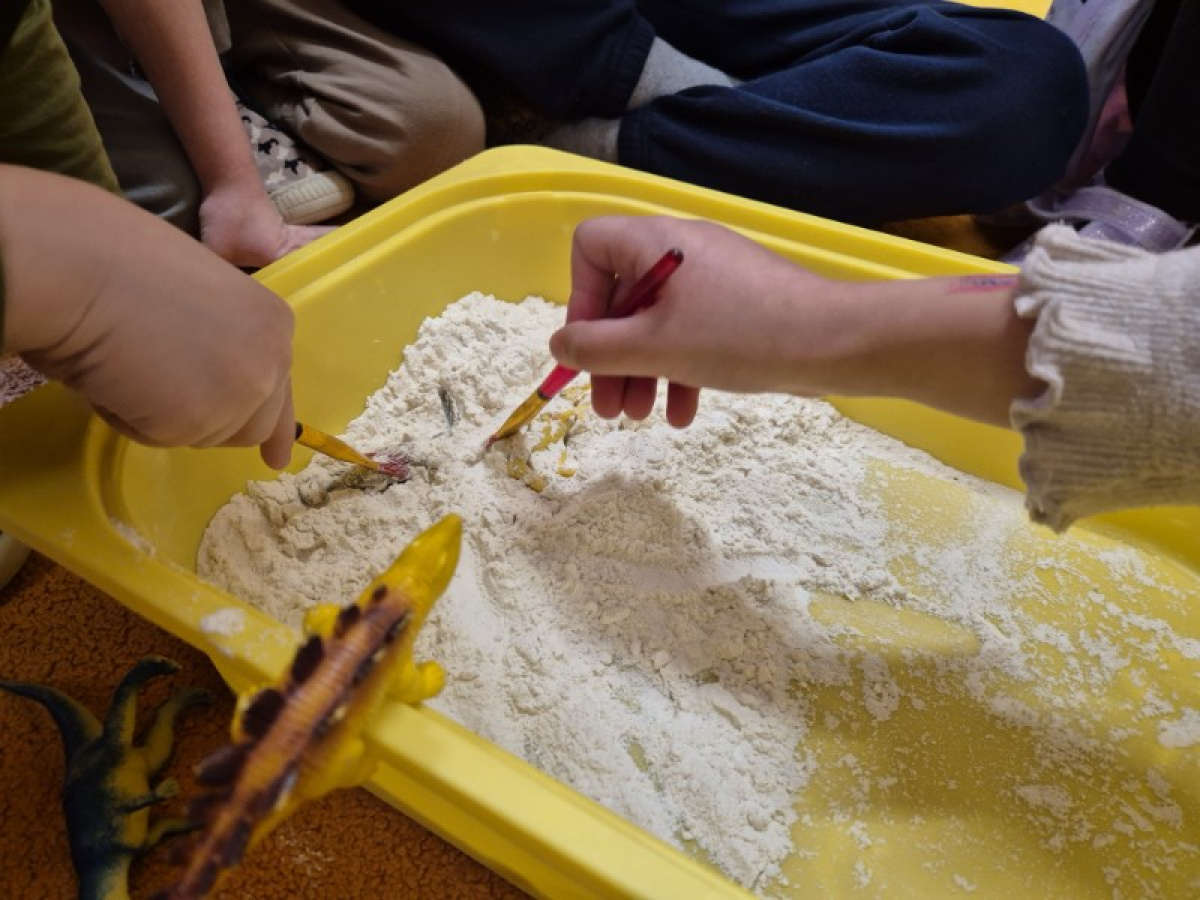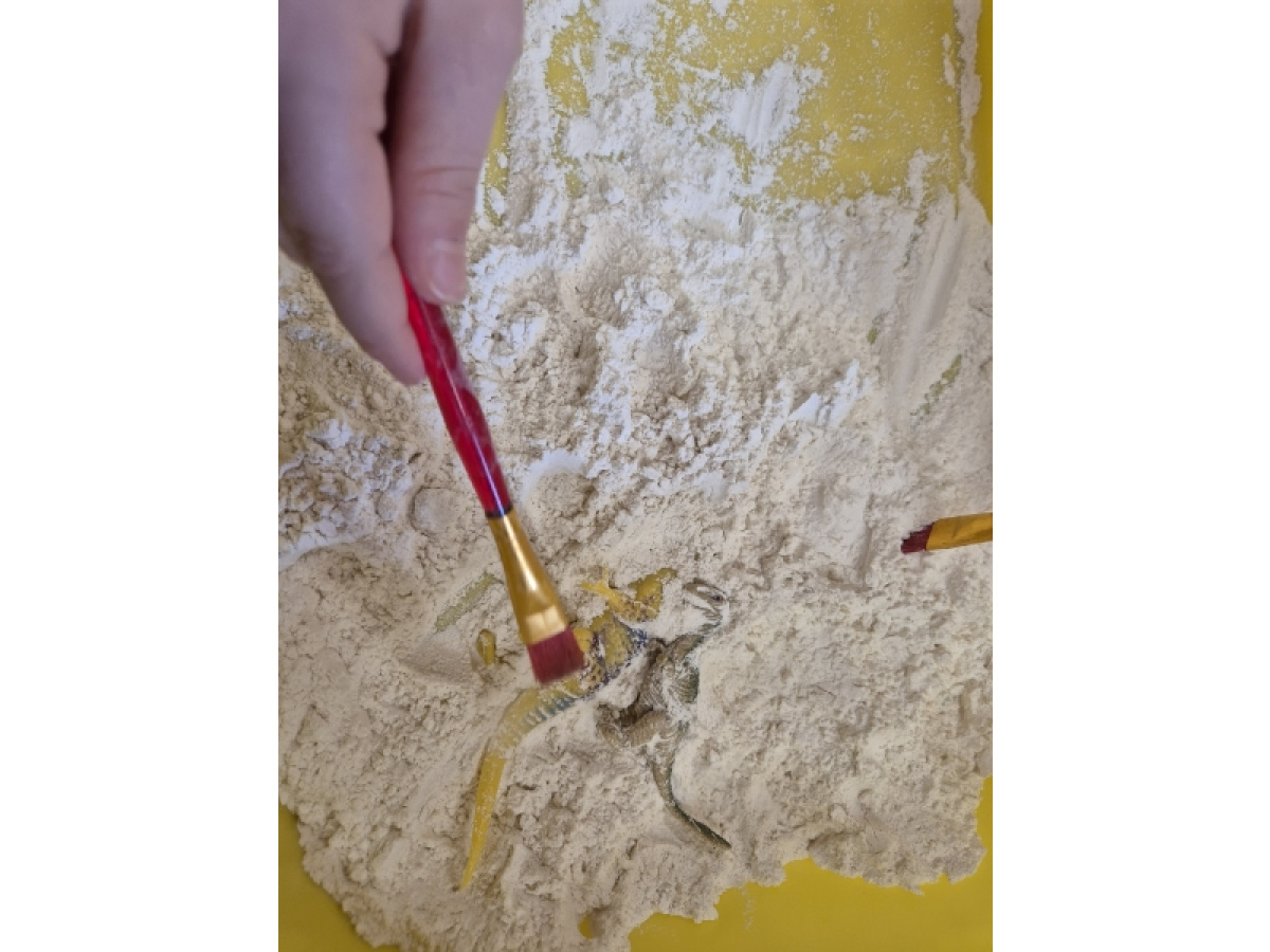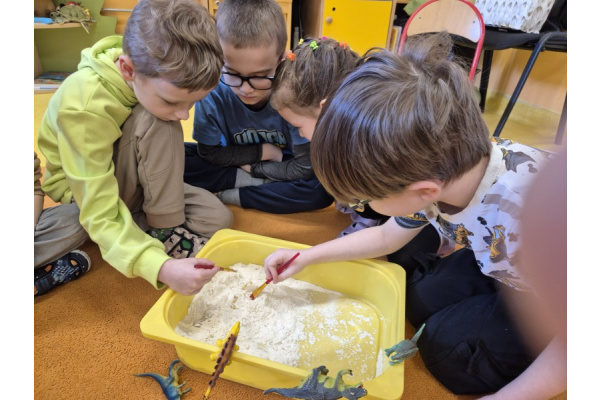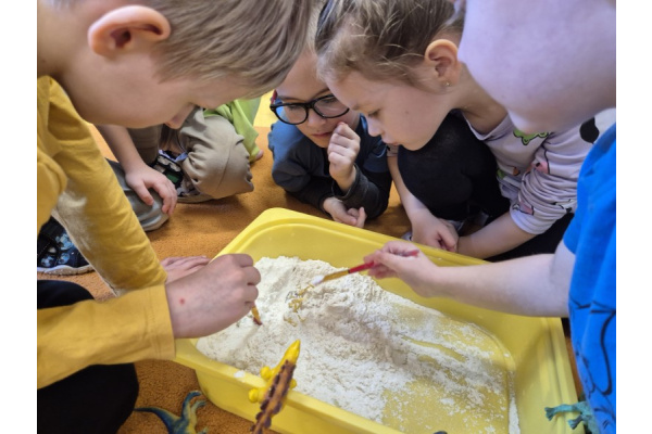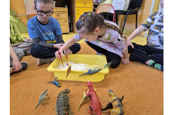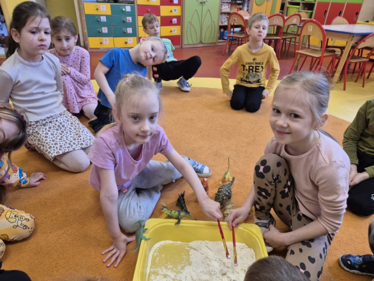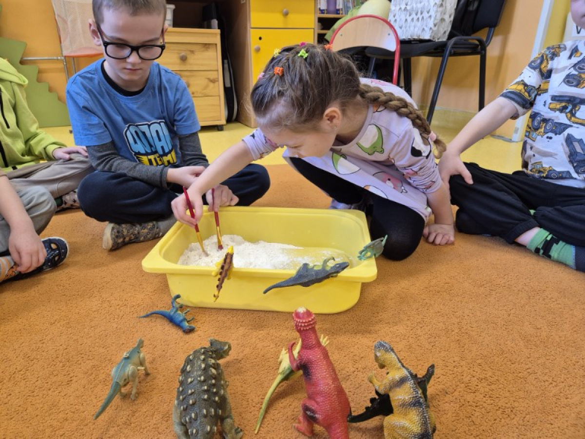 Największą atrakcją dnia była zabawa w paleontologów. Dzieci z ogromnym zaangażowaniem odkopywały „skamieniałości” ukryte w piasku, używając pędzelków i małych łopatek. Każde znalezisko wywoływało wiele emocji i radości, a mali badacze mogli poczuć się jak prawdziwi odkrywcy.