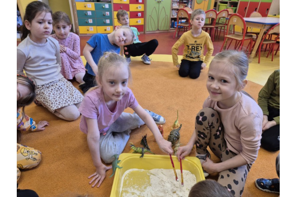 Kreciki przeniosły się w prehistoryczny świat, poznając różne gatunki dinozaurów, ich wygląd, zwyczaje oraz ciekawostki z nimi związane. Nie zabrakło zabaw ruchowych, prac plastycznych oraz wspólnych rozmów o tym, jak wyglądało życie miliony lat temu.