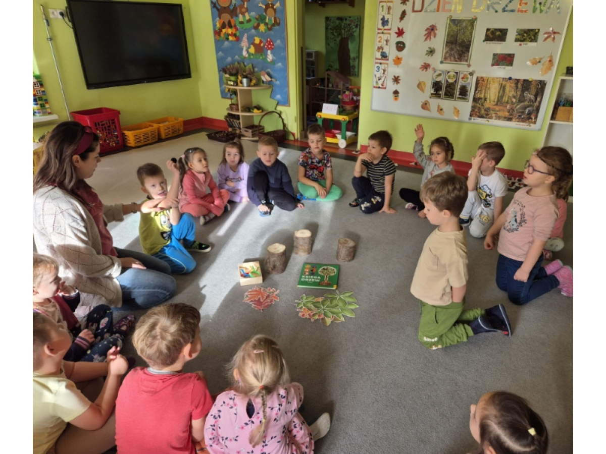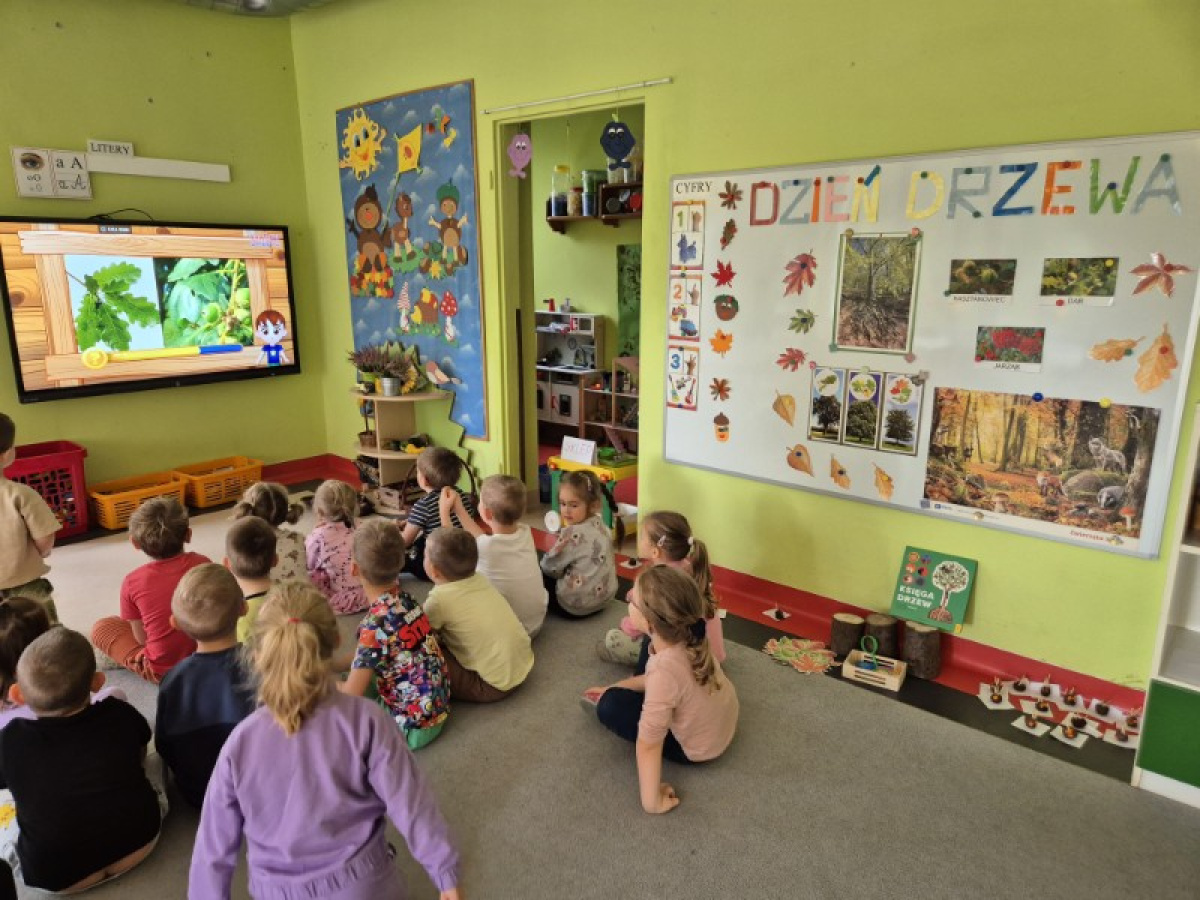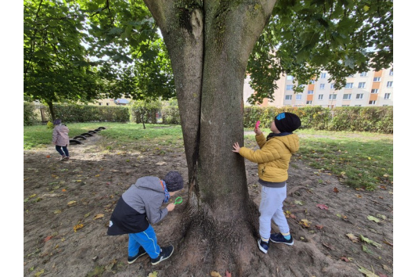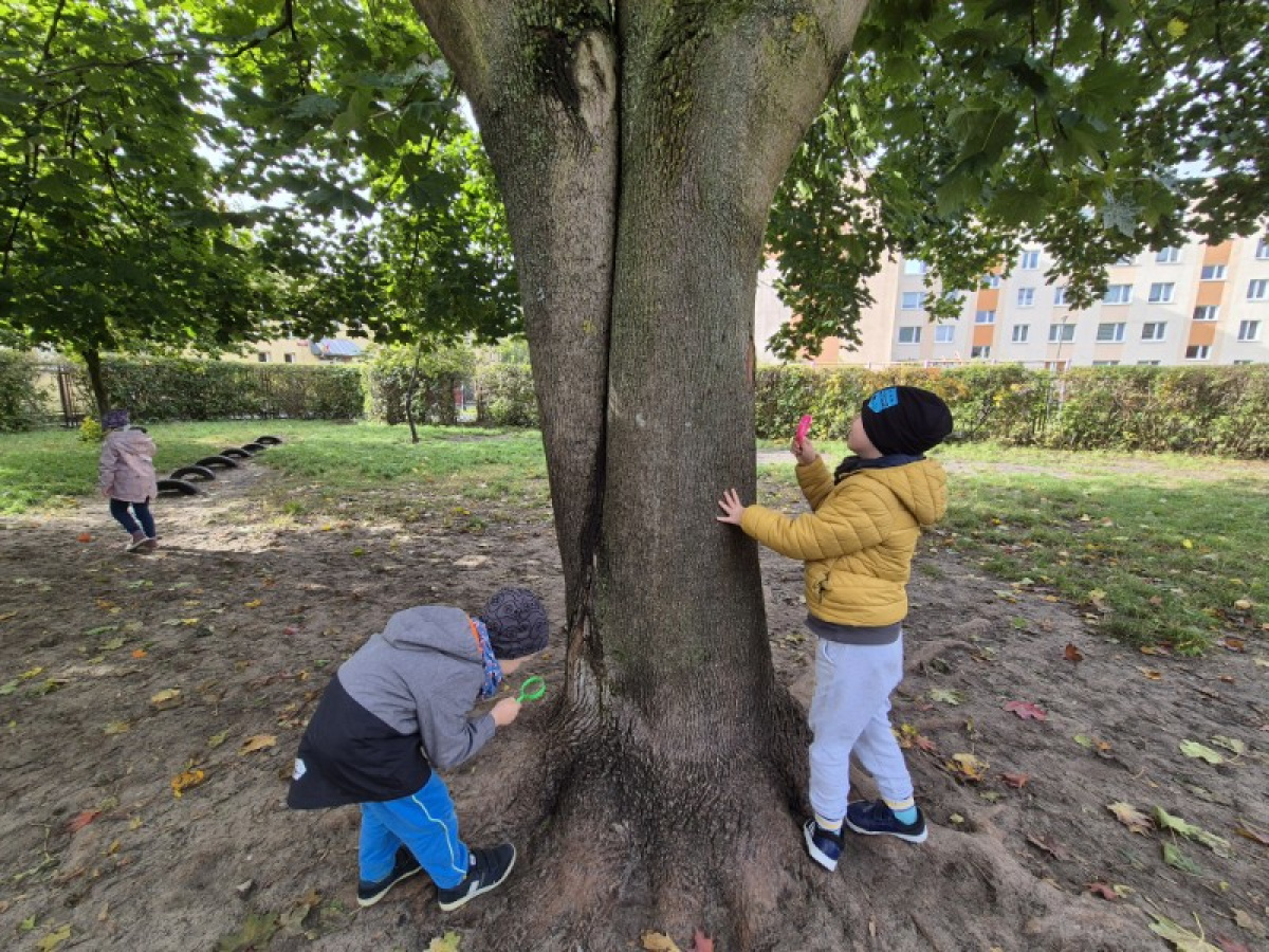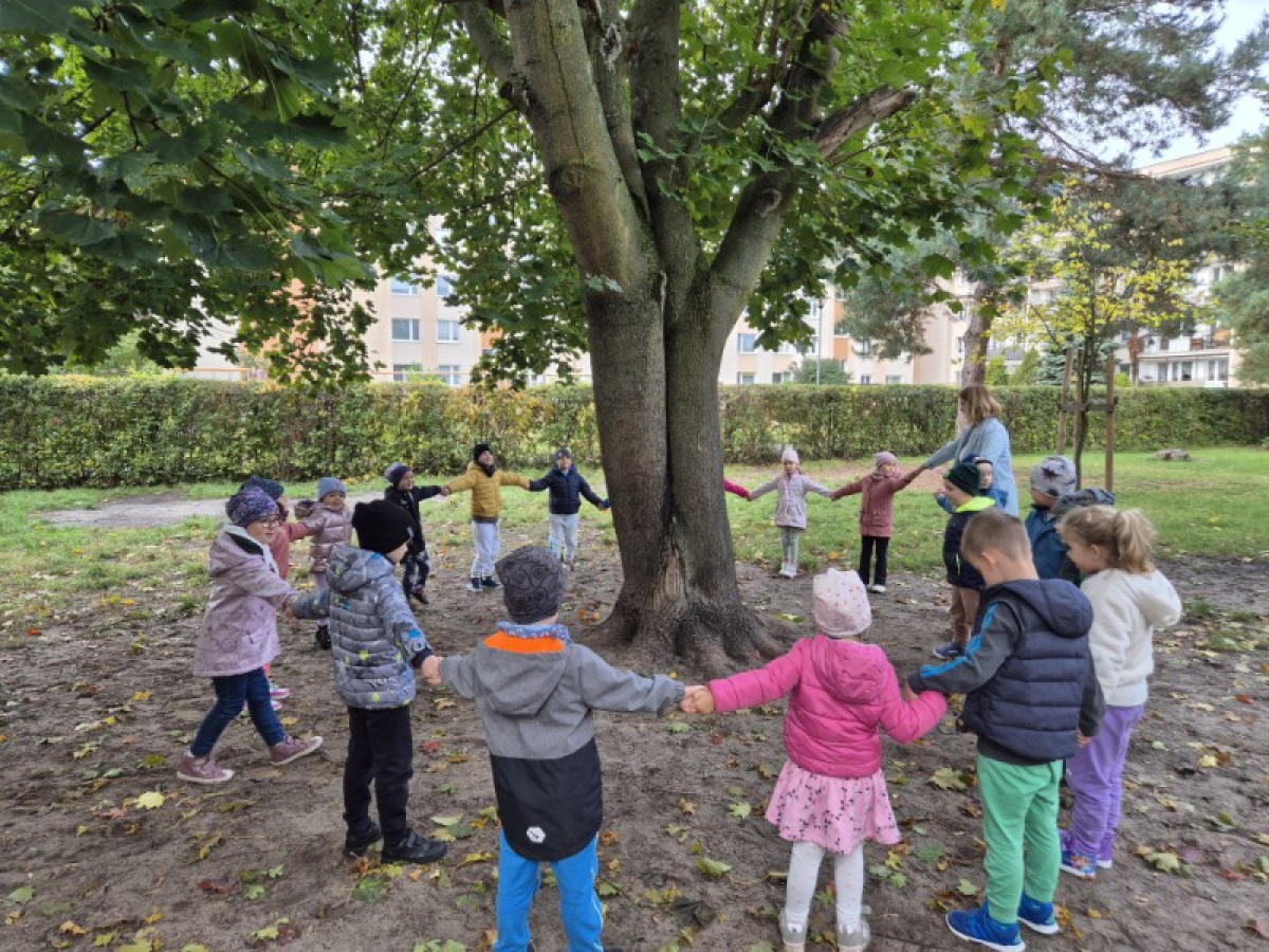 W piątek 10 października obchodziliśmy Święto Drzewa. Zajęcia rozpoczęliśmy od rozmowy kierowanej popartej pytaniami: Po co sadzimy drzewa?, Jaka jest rola drzew? Następnie wysłuchaliśmy wiersza M. Skrobacz pt: „Smutne drzewo”, który uwrażliwił nas na szanowanie drzew wokół nas. Wesoło bawiliśmy się biorąc udział w różnych zabawach ruchowych. W ogrodzie przedszkolnym oglądaliśmy drzewa za pomocą lup i obiecaliśmy, że będziemy dbać i szanować drzewa, gdyż są nam bardzo potrzebne!