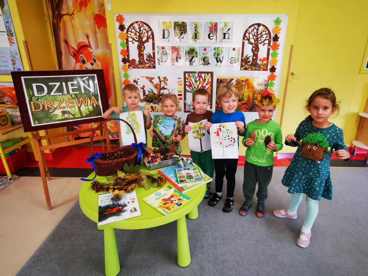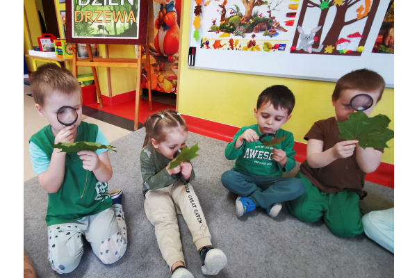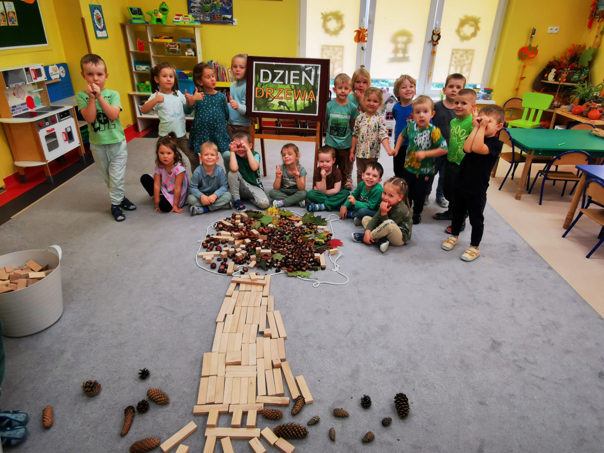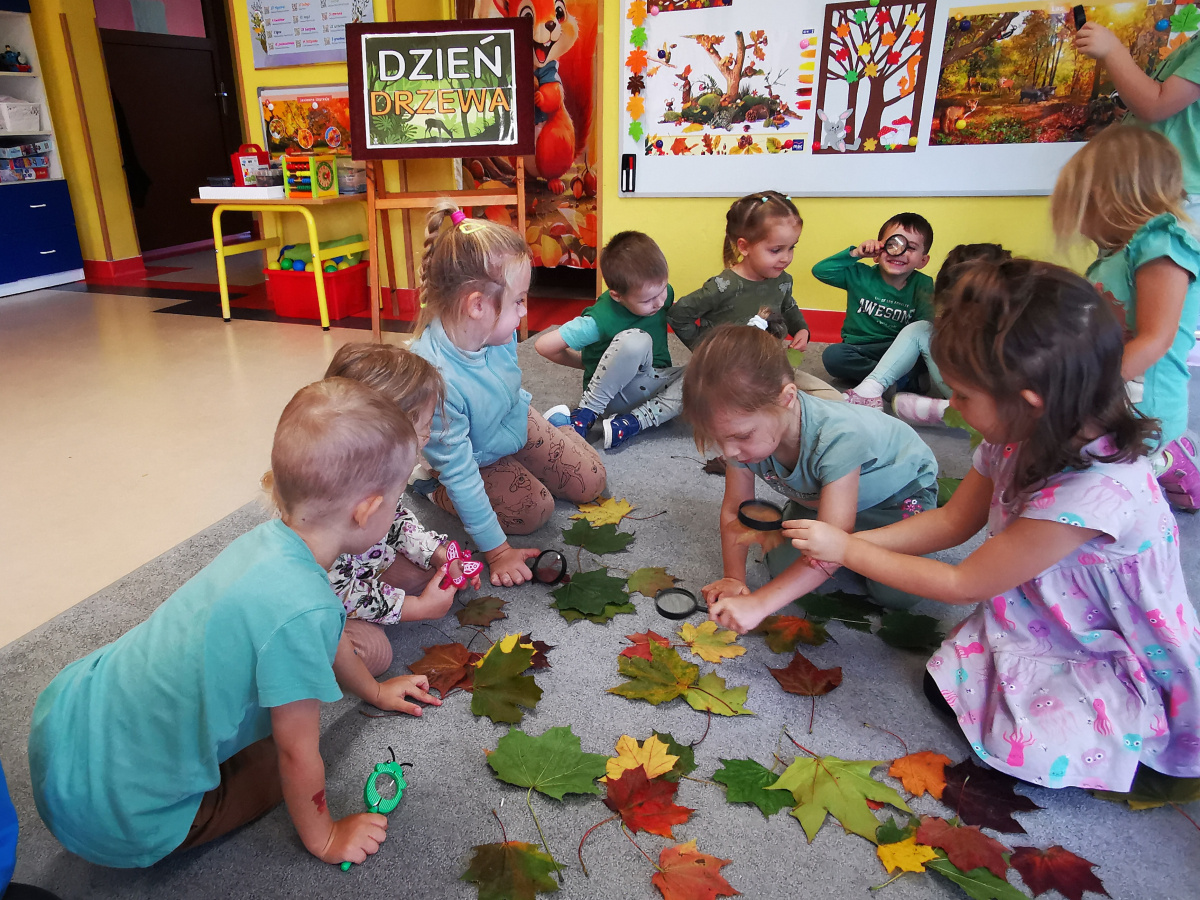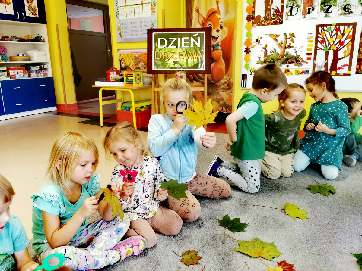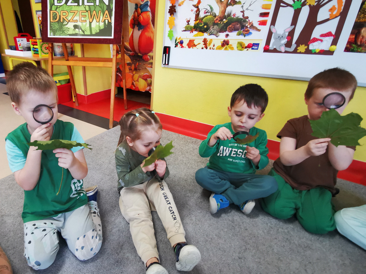Z okazji Dnia Drzewa nasze Liski ubrały się na zielono i aktywnie uczestniczyły w przyrodniczych zabawach. Dzieci oglądały liście przez lupę, budowały drzewo z darów lasu, przeglądały książki o drzewach oraz wykonały piękne prace plastyczne, które najpierw kolorowały kredkami, a następnie wyklejały plasteliną.To był pełen radości i odkrywania dzień, który uczył miłości do przyrody ????????