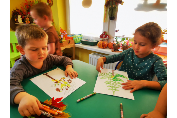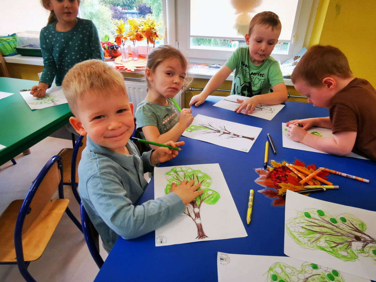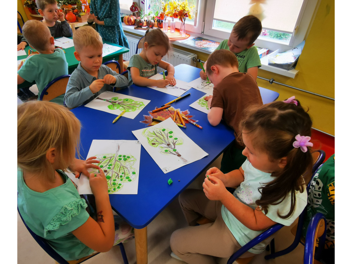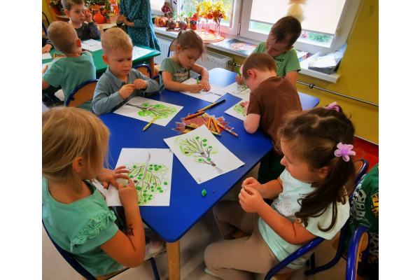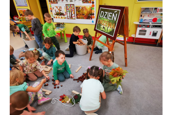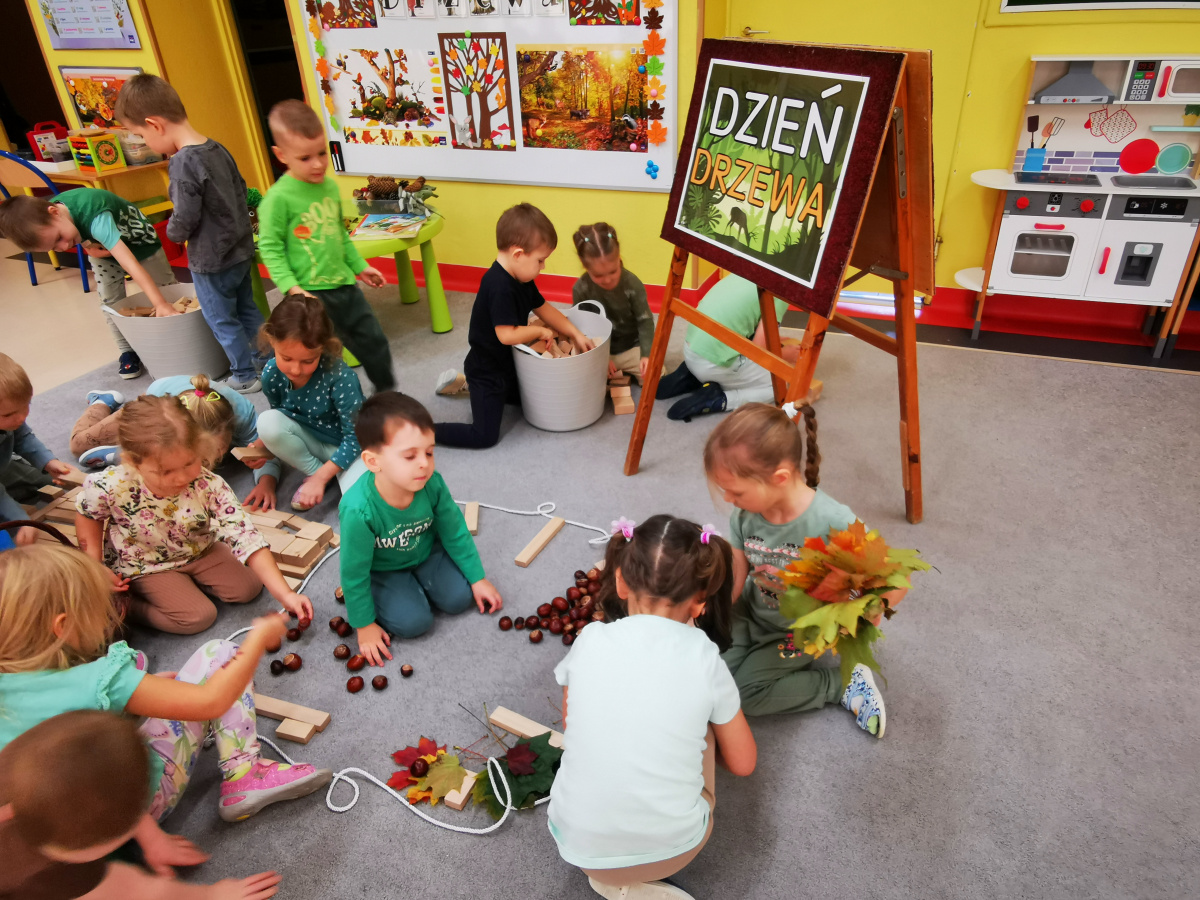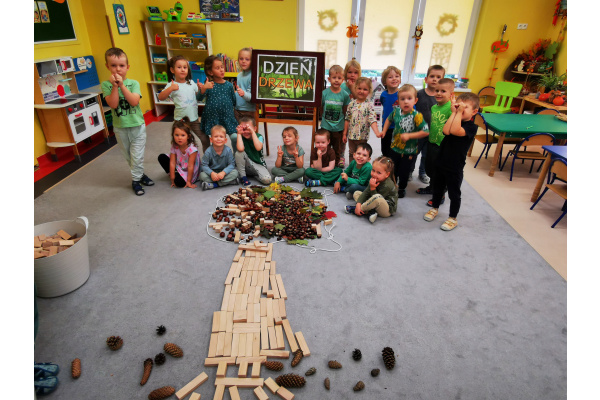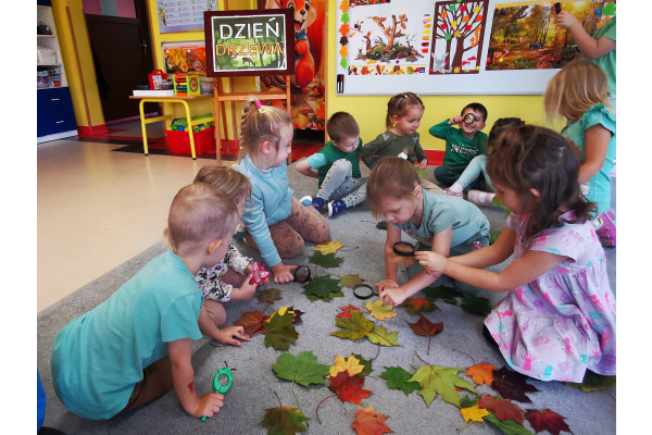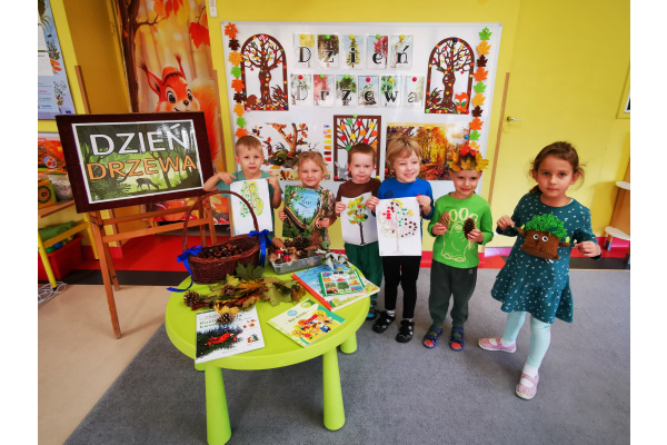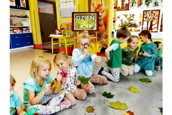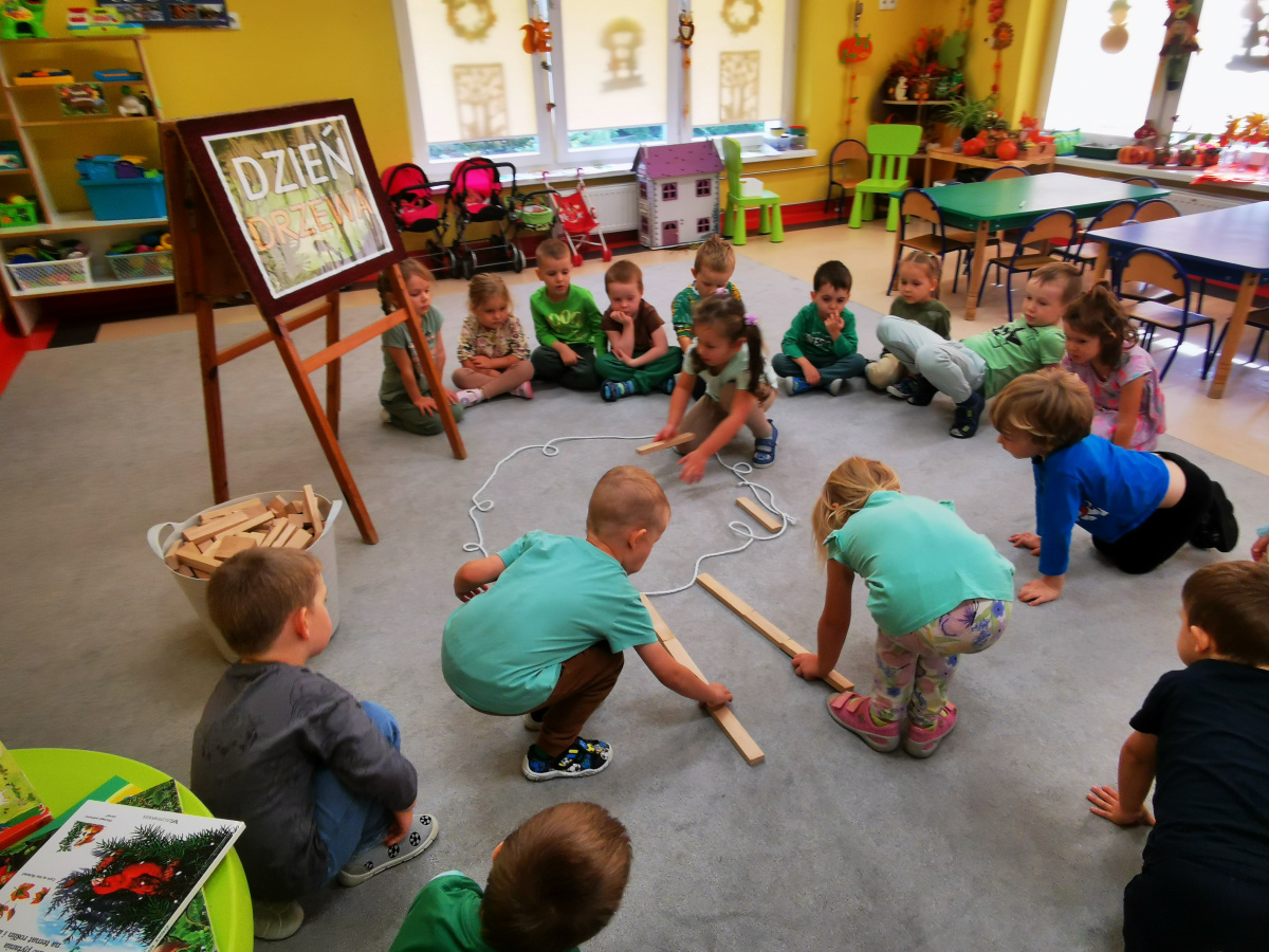 Z okazji Dnia Drzewa nasze Liski ubrały się na zielono i aktywnie uczestniczyły w przyrodniczych zabawach. Dzieci oglądały liście przez lupę, budowały drzewo z darów lasu, przeglądały książki o drzewach oraz wykonały piękne prace plastyczne, które najpierw kolorowały kredkami, a następnie wyklejały plasteliną.To był pełen radości i odkrywania dzień, który uczył miłości do przyrody ????????