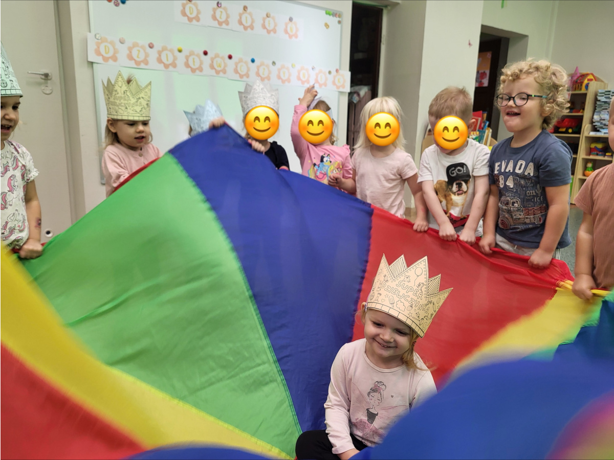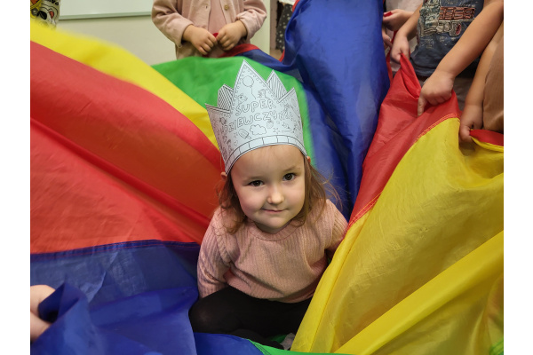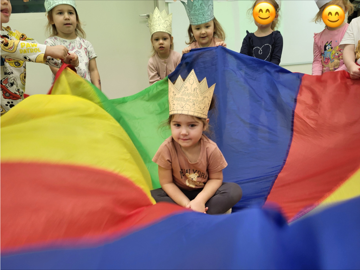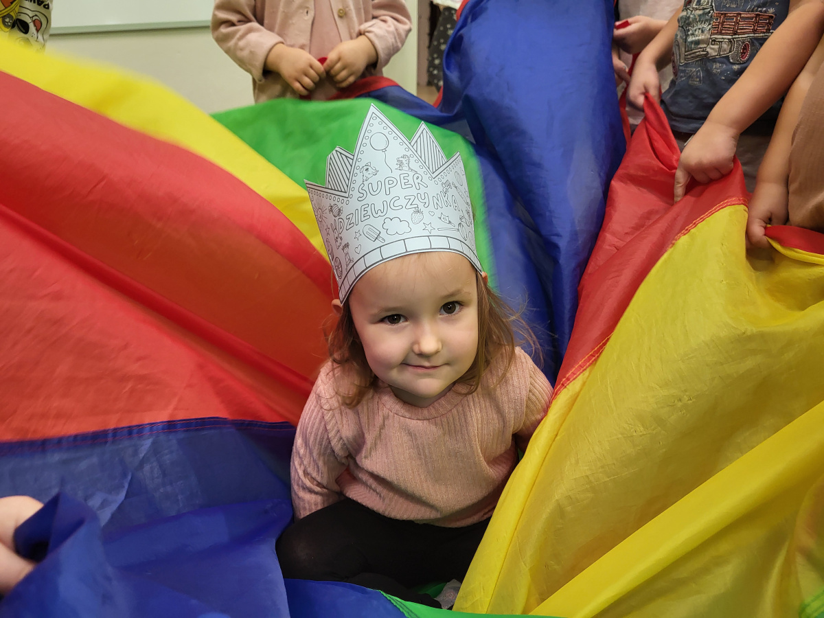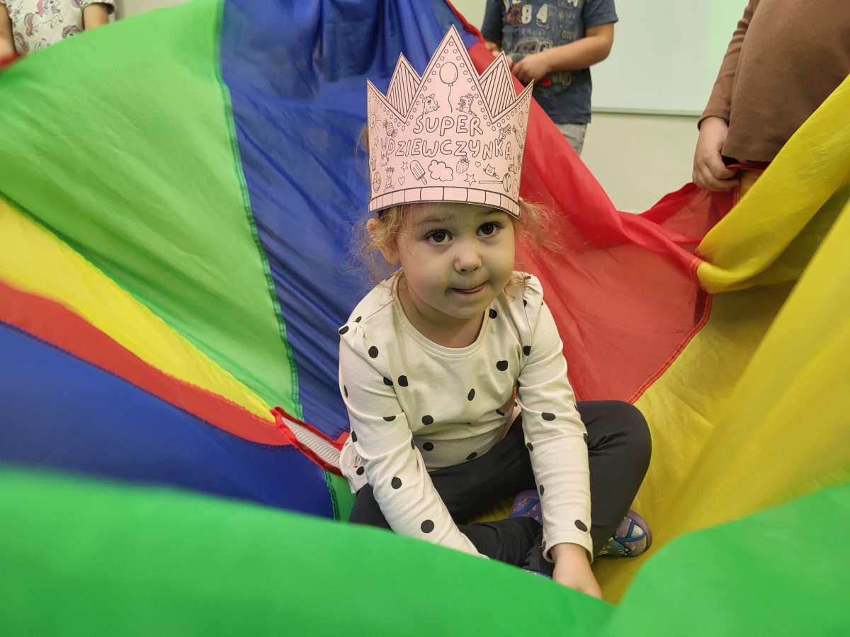 Dziewczynki otrzymały korony i upominki od chłopców z grupy, a wszyscy wspólnie bawili się z kolorową chustą animacyjną Klanza.