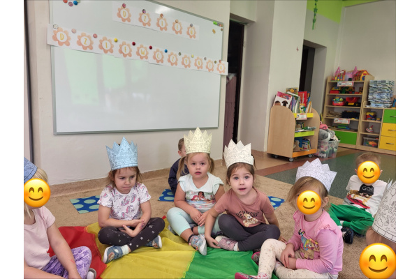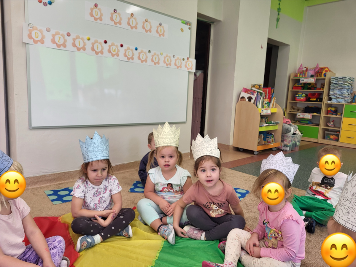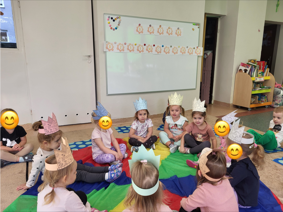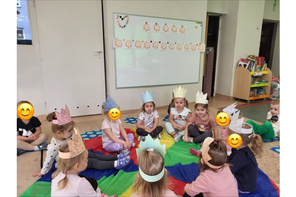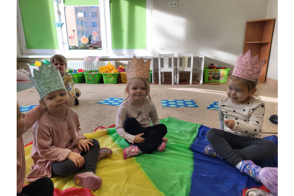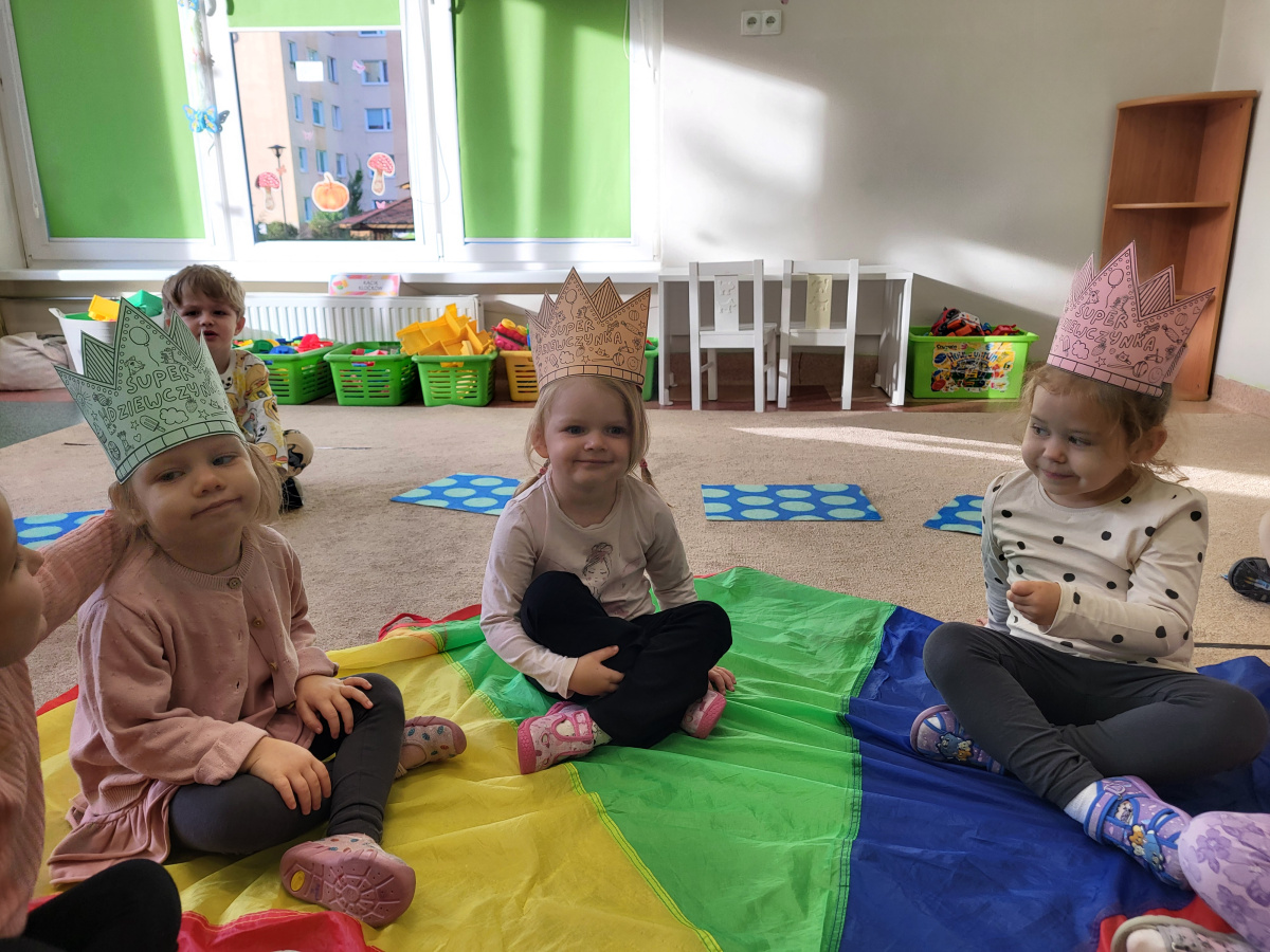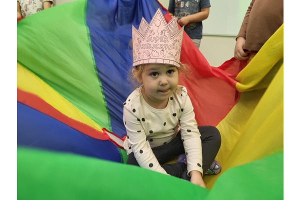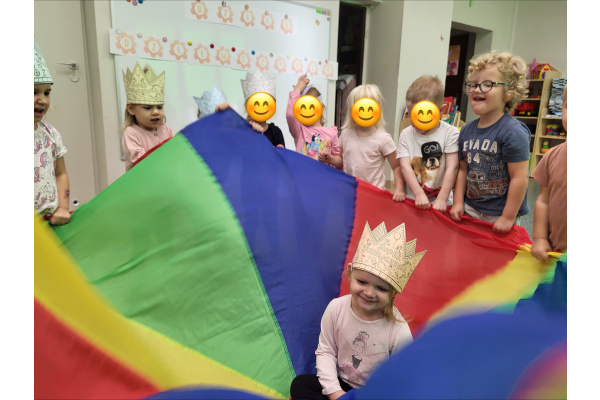 Dziewczynki otrzymały korony i upominki od chłopców z grupy, a wszyscy wspólnie bawili się z kolorową chustą animacyjną Klanza.