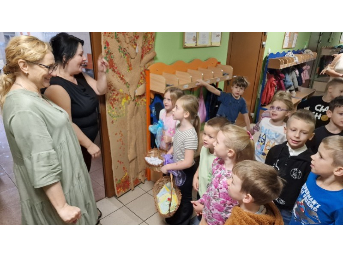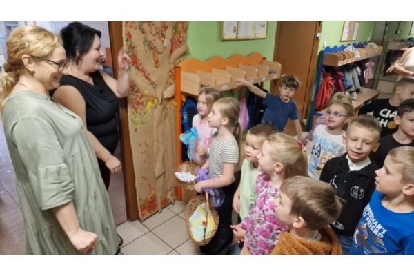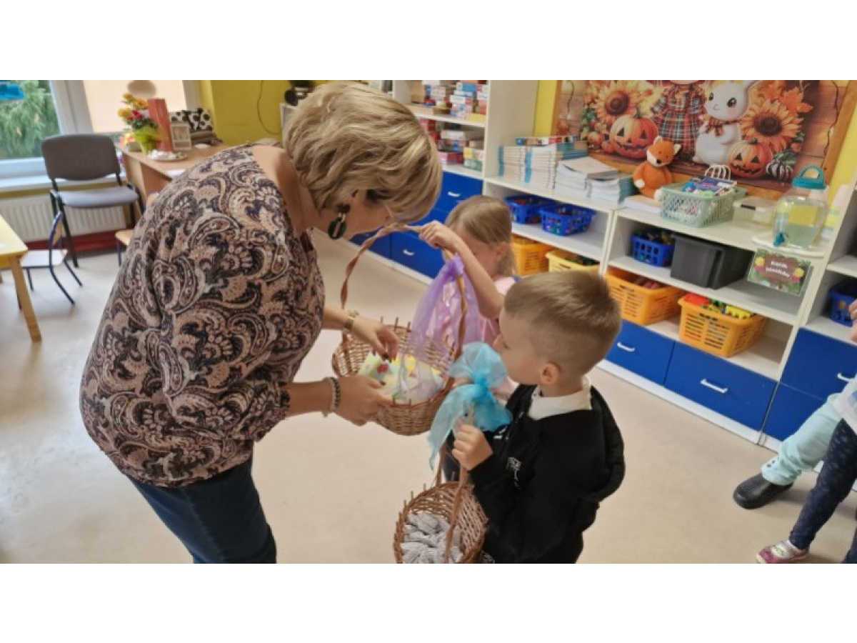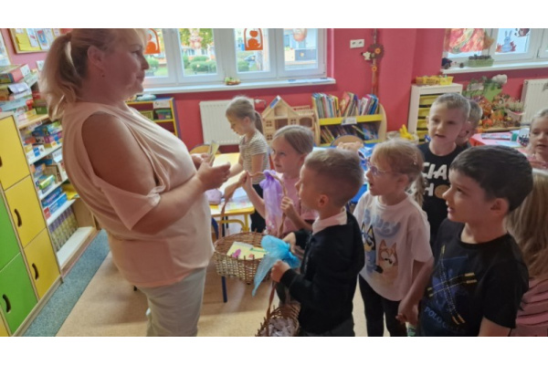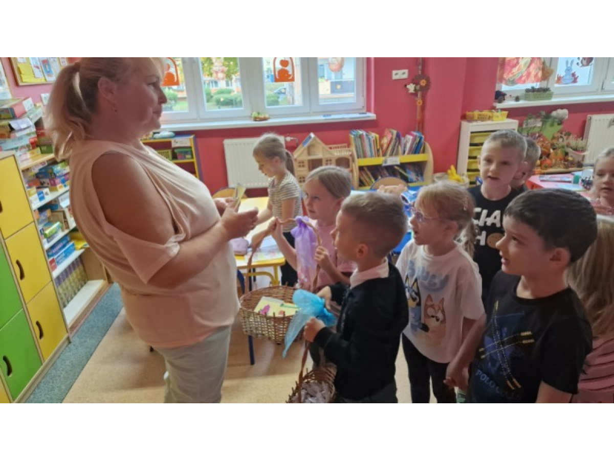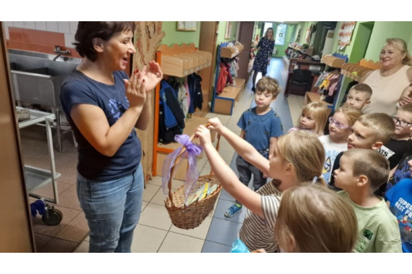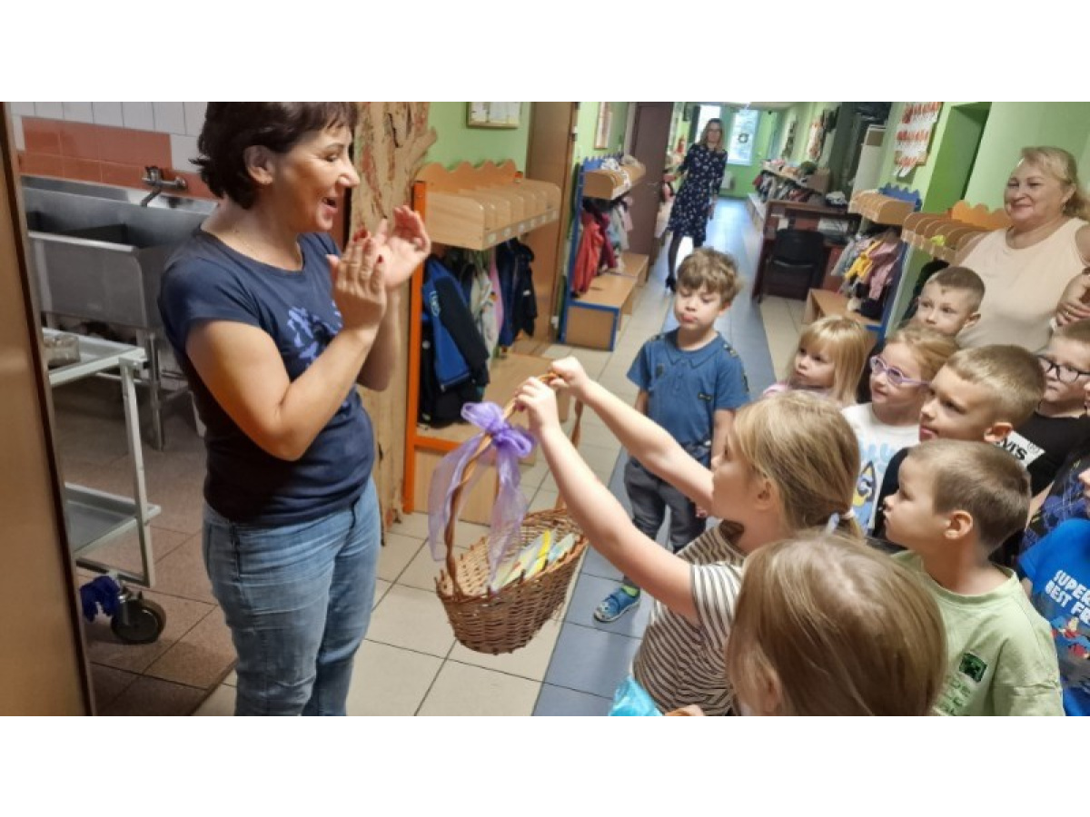 Z okazji Dnia Edukacji Narodowej przedszkolaki z radością wręczyły nauczycielom oraz wszystkim pracownikom przedszkola własnoręcznie przygotowane upominki oraz krówki. Dzieci z przejęciem składały życzenia, wywołując wzruszenie i uśmiechy na twarzach pracowników. Był to wyjątkowy moment pełen wdzięczności, ciepła i serdeczności.