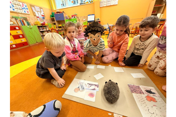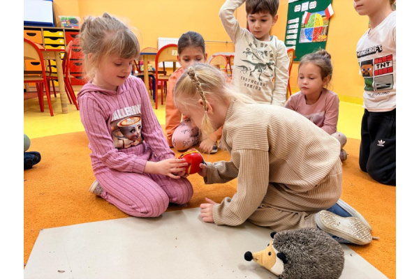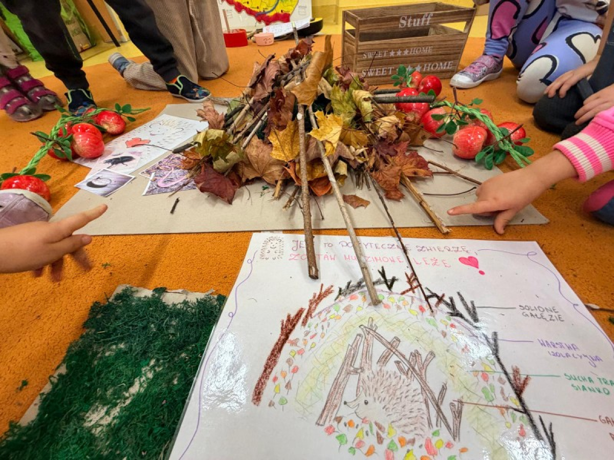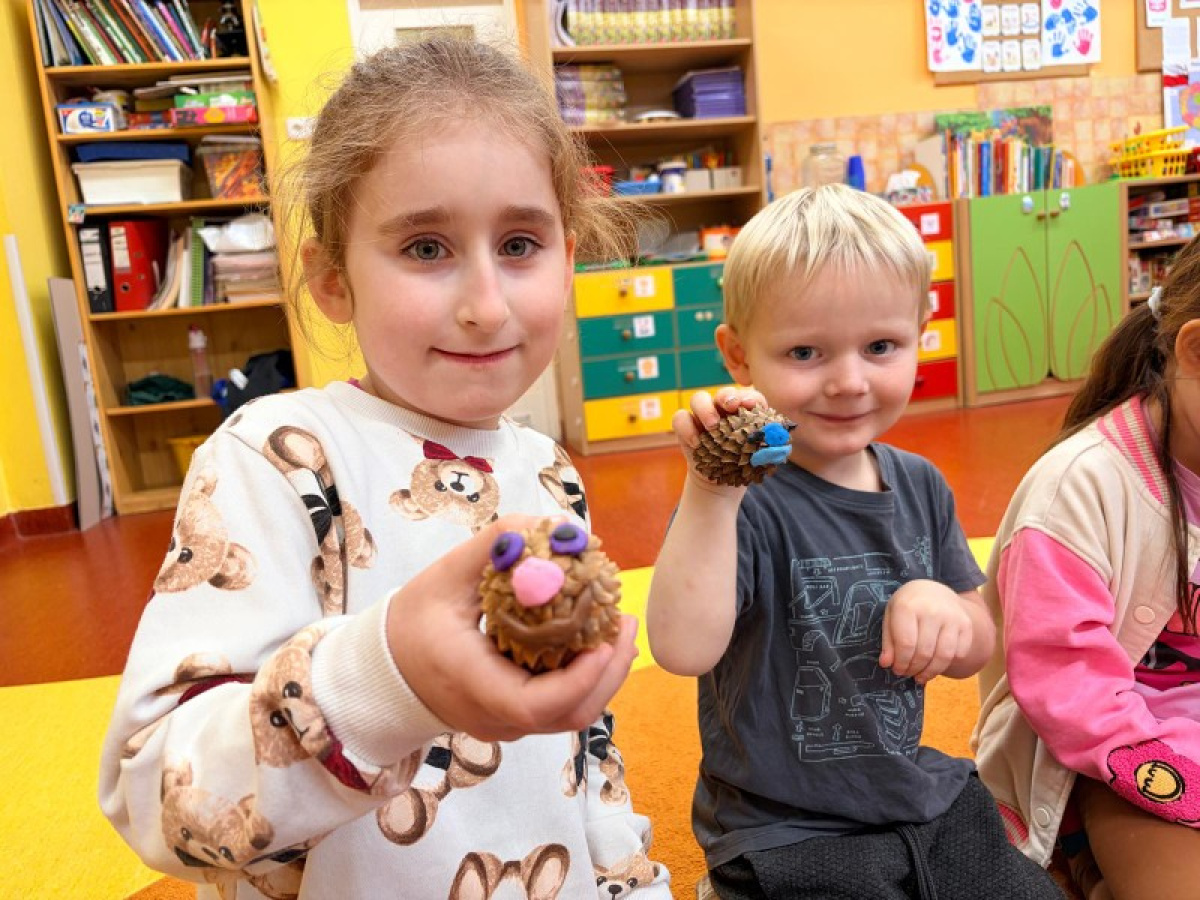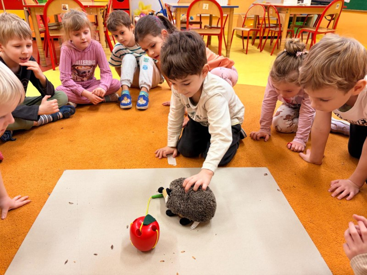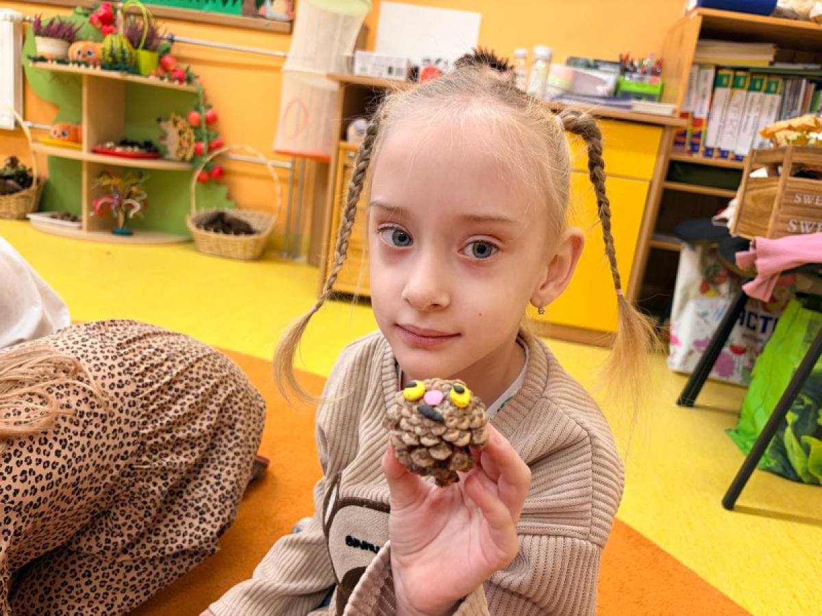 10 listopada obchodzony jest międzynarodowy Dzień Jeża. Kreciki z tej okazji postanowiły zamienić się w małych kolczastych przyjaciół. Przy pomocy szyszek oraz plasteliny powstały piękne Tuptusie. Dzieci dowiedziały się czym jest gatunek chroniony. Okazało się też, że jeże są mięsożercami, a z jabłek to one chętnie wyjadają tylko robaki. Zbudowaliśmy jesienne leże dla Tuptusia. A on w zamian wskoczył na jabłuszka i pogilał nasze uszka przy akompaniamencie dźwięków ukulele. Na koniec utrwaliliśmy sobie najważniejszą zasadę jeżowej pierwszej pomocy: 3xC, co znaczy CICHO, CIEPŁO i CIEMNO.