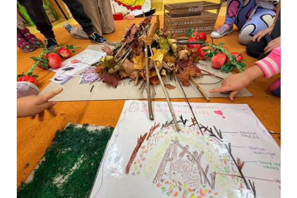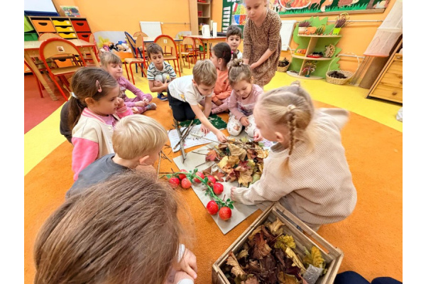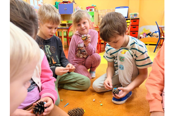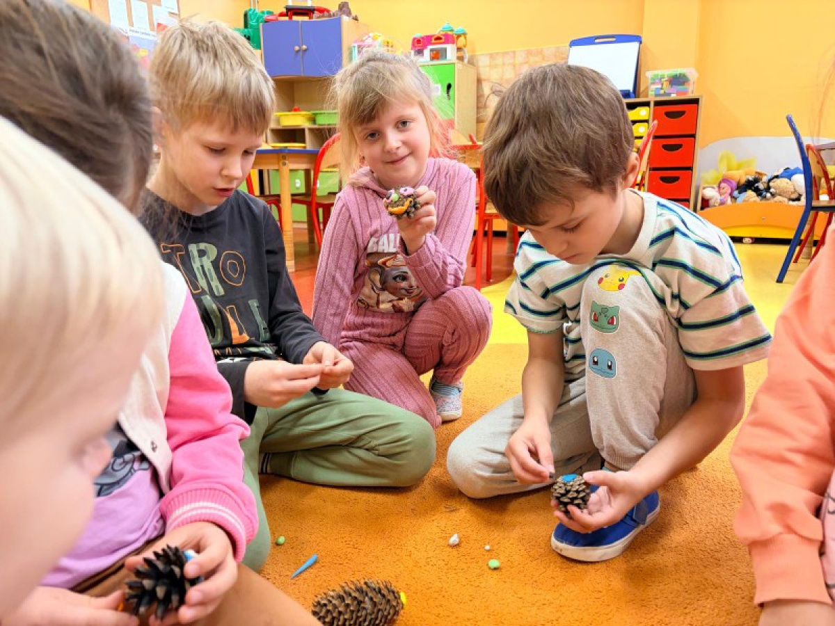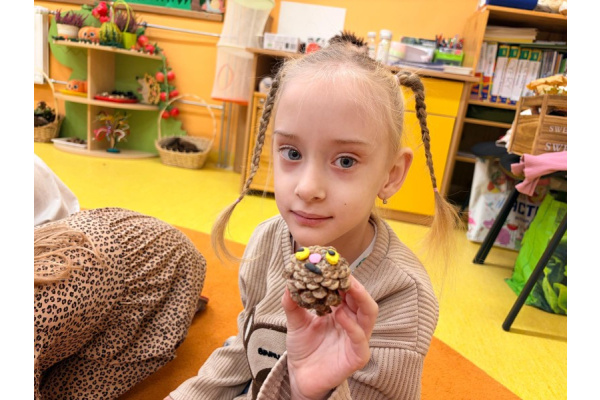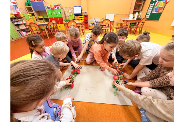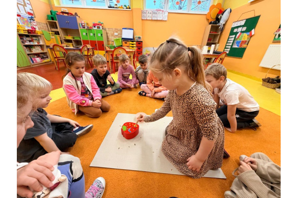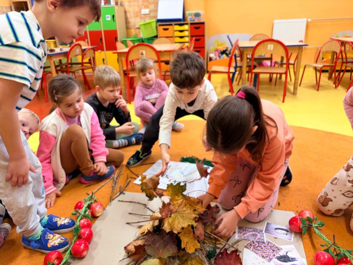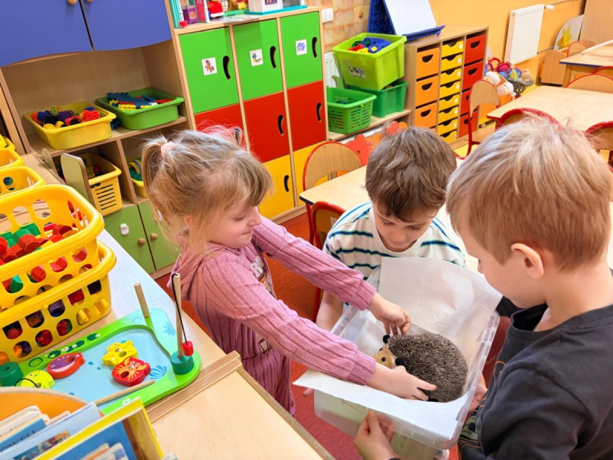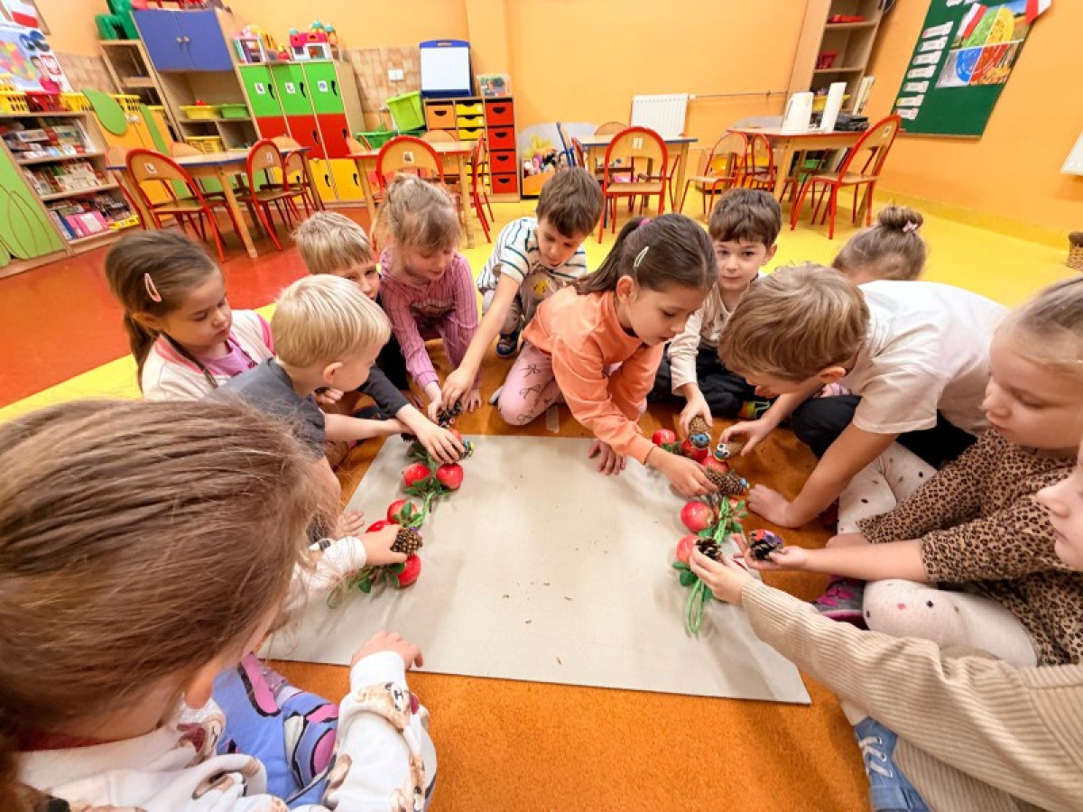 10 listopada obchodzony jest międzynarodowy Dzień Jeża. Kreciki z tej okazji postanowiły zamienić się w małych kolczastych przyjaciół. Przy pomocy szyszek oraz plasteliny powstały piękne Tuptusie. Dzieci dowiedziały się czym jest gatunek chroniony. Okazało się też, że jeże są mięsożercami, a z jabłek to one chętnie wyjadają tylko robaki. Zbudowaliśmy jesienne leże dla Tuptusia. A on w zamian wskoczył na jabłuszka i pogilał nasze uszka przy akompaniamencie dźwięków ukulele. Na koniec utrwaliliśmy sobie najważniejszą zasadę jeżowej pierwszej pomocy: 3xC, co znaczy CICHO, CIEPŁO i CIEMNO.