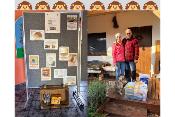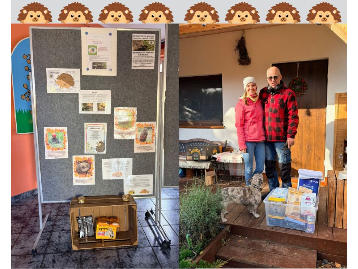 Od 4 do 14 listopada w Naszym Przedszkolu trwała zbiórka darów dla jeży będących pod opieką Pani Beaty oraz Pana Tomasza w Solcu Kujawskim. W sobotę, 15 listopada wszystkie dary zostały przekazane dla podopiecznych azylu. Dowiedzieliśmy się, że azyl składa się z kilku części. W jego skład wchodzą szpitalik - dla jeży, które pilnie potrzebują pomocy. Jeżarnia, w której młodsze jeże przygotowują się do hibernacji oraz wybiegi, w których dorosłe jeże już zapadły w sen zimowy.