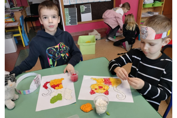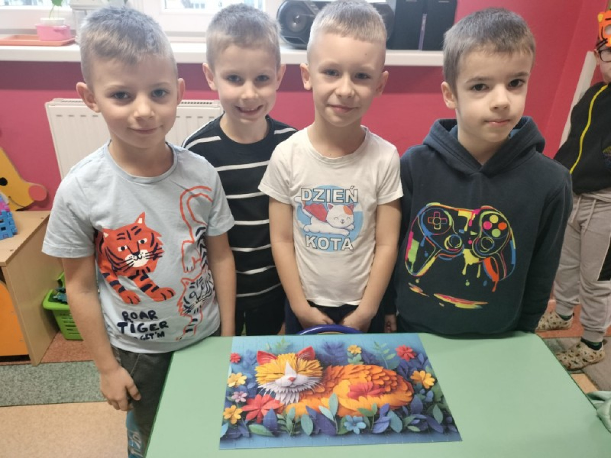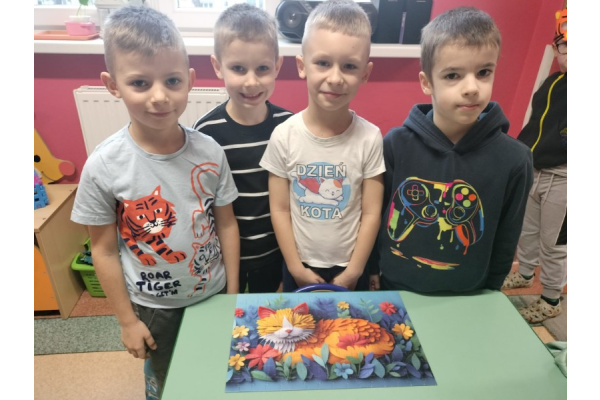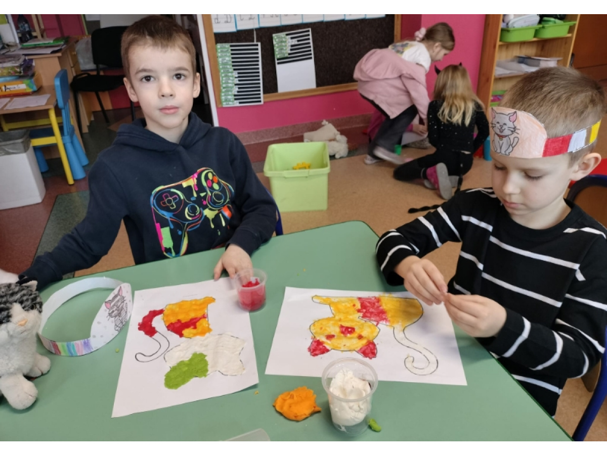 W przedszkolu świętowaliśmy radosny Dzień Kota, podczas którego dzieci brały udział w różnorodnych aktywnościach. Przedszkolaki tworzyły własne kocie opaski na głowę, rozwijając kreatywność i sprawność manualną. Układały także puzzle o tematyce kociej, doskonaląc spostrzegawczość i logiczne myślenie. W ramach pracy plastycznej ćwiczyły małą motorykę, wykonując kolorowe kotki różnymi technikami.
