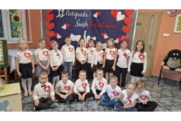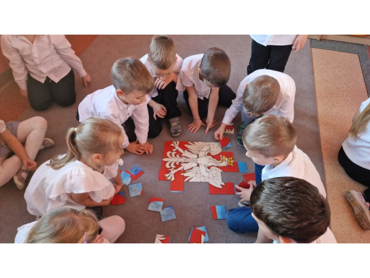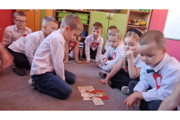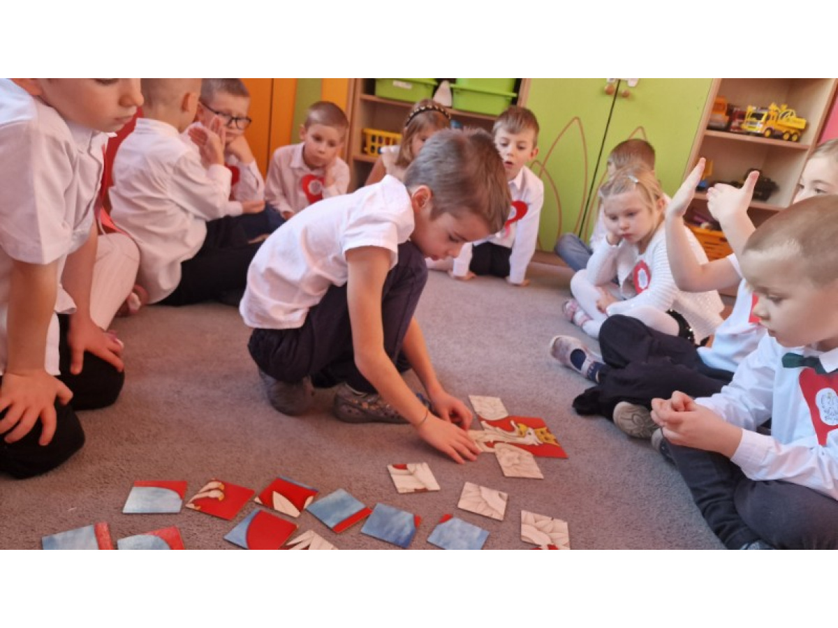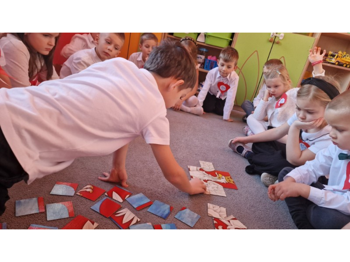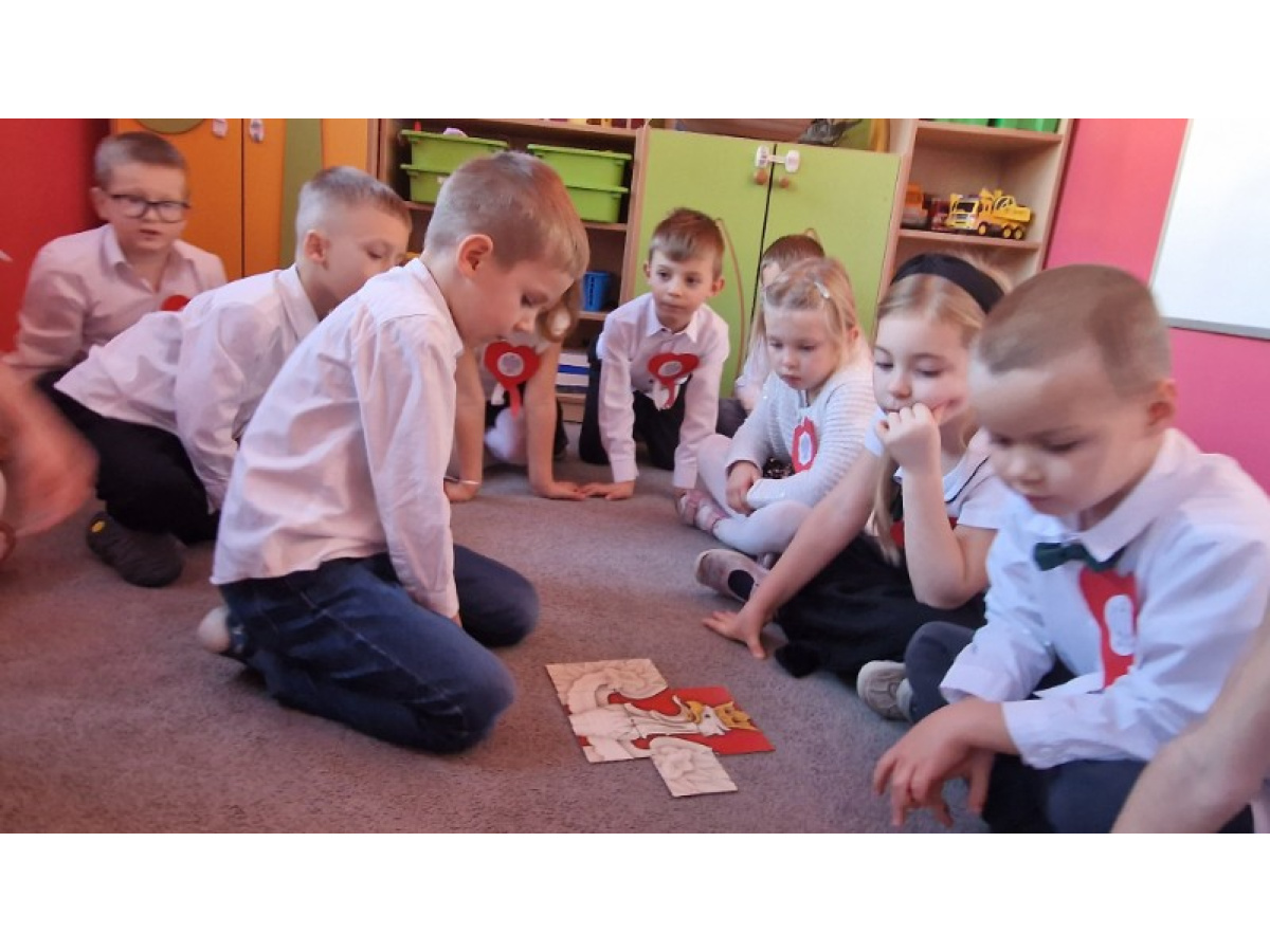 Dnia 7 listopada świętowaliśmy w przedszkolu odzyskanie przez Polskę niepodległości. Przedszkolaki wzięły udział w akcji "Szkoła do Hymnu" i wspólnie odśpiewały Hymn Polski. Braliśmy także udział w uroczystym występie grupy Żabek. Nie zabrakło wspólnych zdjęć, rozmów o polskich symbolach oraz układanie puzzli z Godłem Polski.