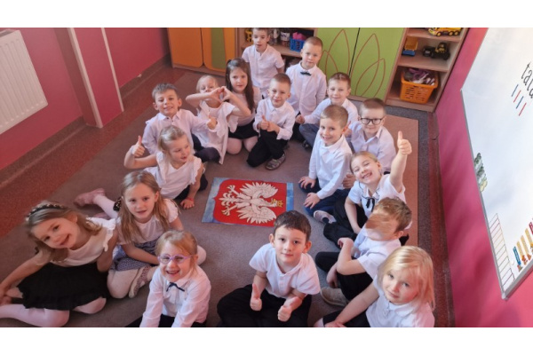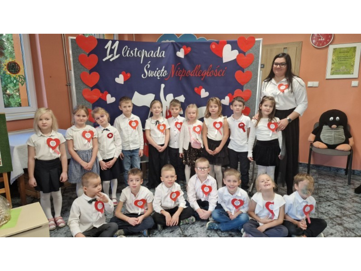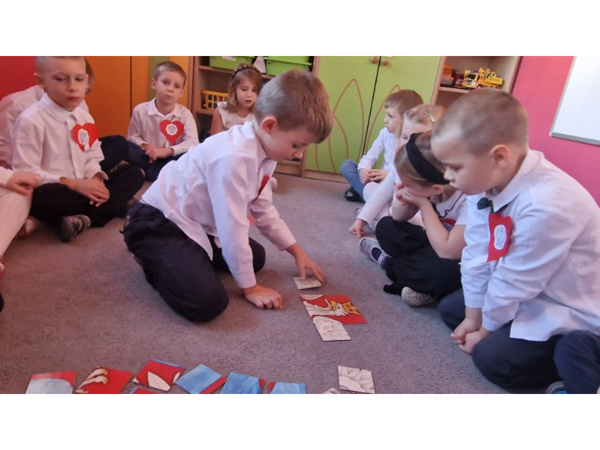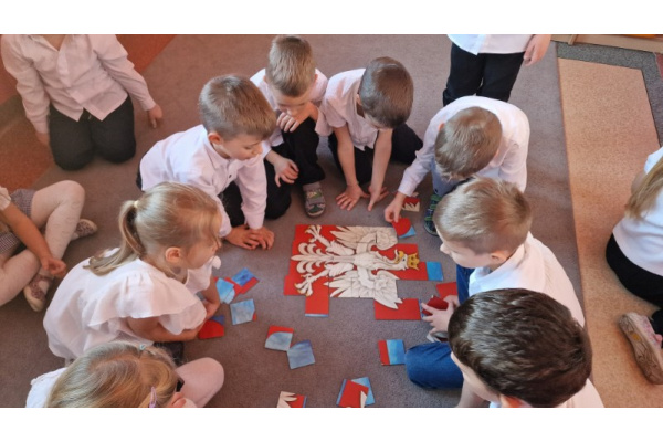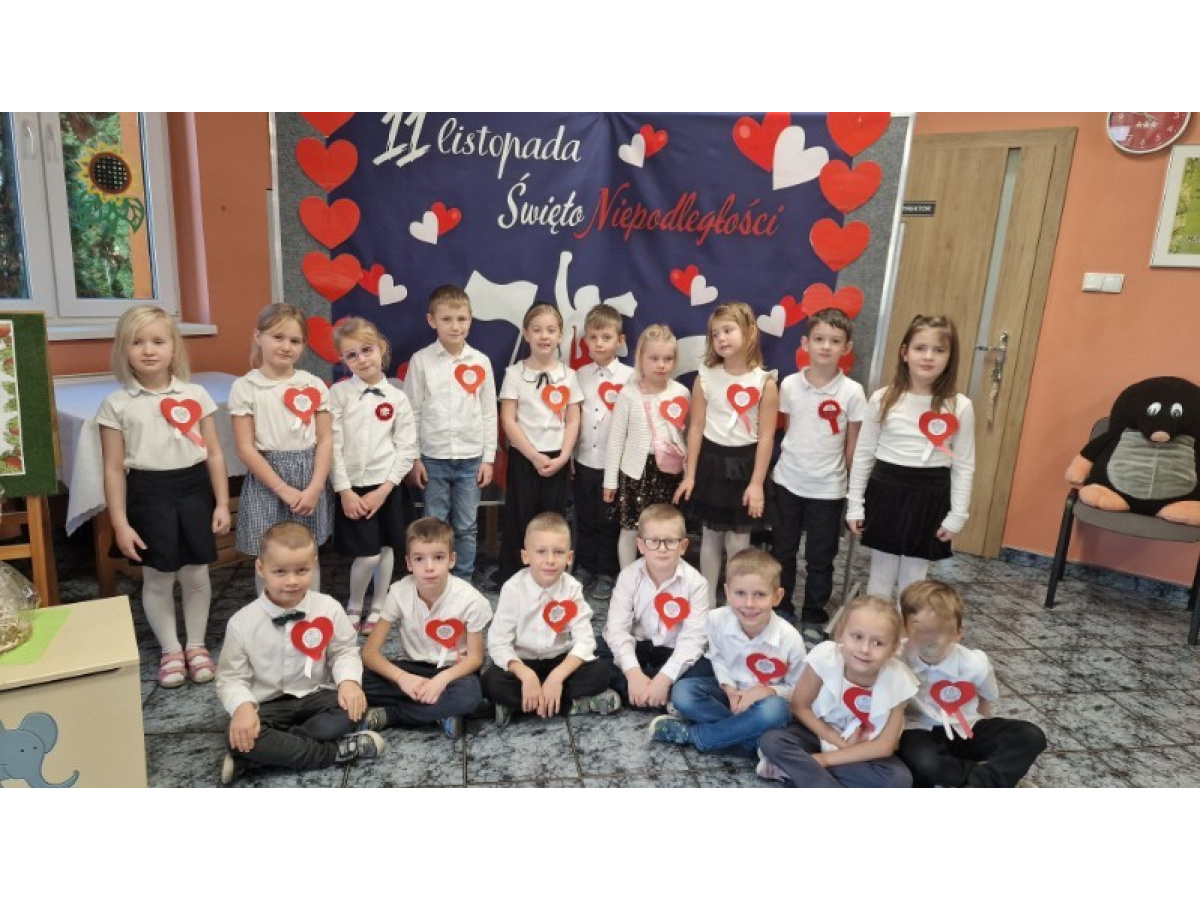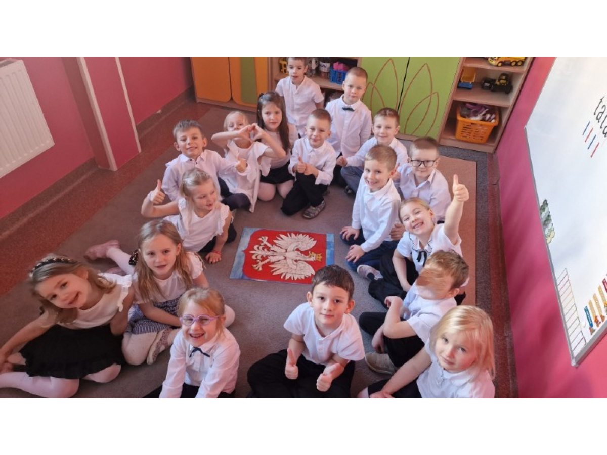 Dnia 7 listopada świętowaliśmy w przedszkolu odzyskanie przez Polskę niepodległości. Przedszkolaki wzięły udział w akcji "Szkoła do Hymnu" i wspólnie odśpiewały Hymn Polski. Braliśmy także udział w uroczystym występie grupy Żabek. Nie zabrakło wspólnych zdjęć, rozmów o polskich symbolach oraz układanie puzzli z Godłem Polski.