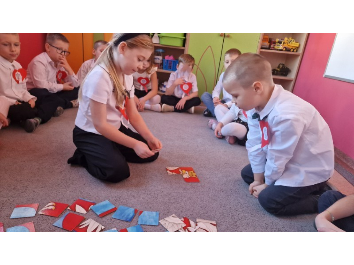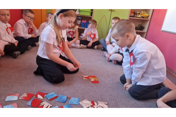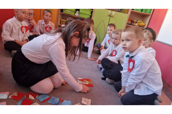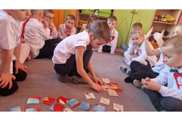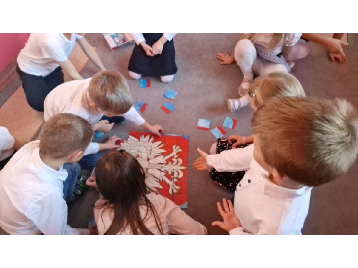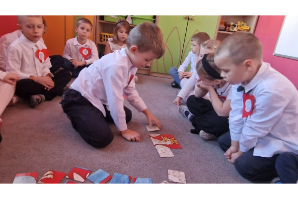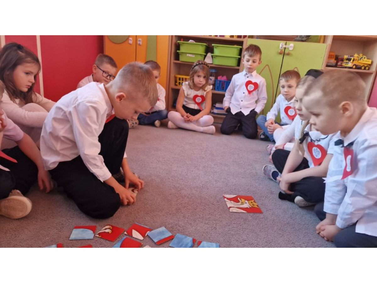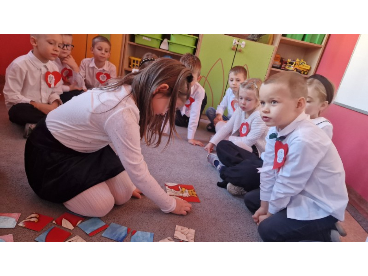 Dnia 7 listopada świętowaliśmy w przedszkolu odzyskanie przez Polskę niepodległości. Przedszkolaki wzięły udział w akcji "Szkoła do Hymnu" i wspólnie odśpiewały Hymn Polski. Braliśmy także udział w uroczystym występie grupy Żabek. Nie zabrakło wspólnych zdjęć, rozmów o polskich symbolach oraz układanie puzzli z Godłem Polski.
