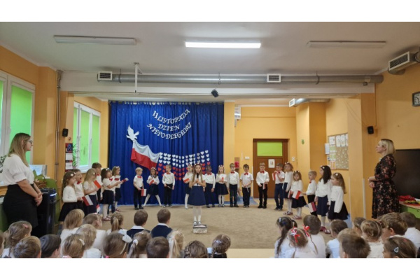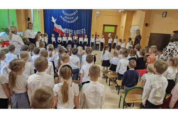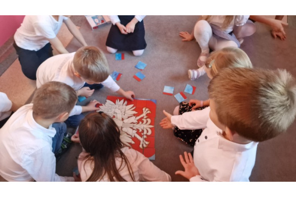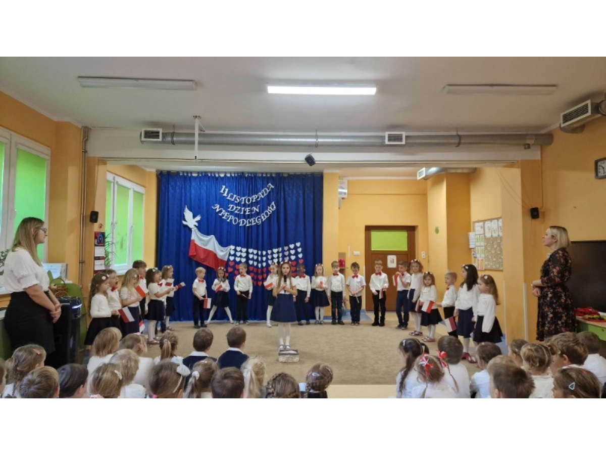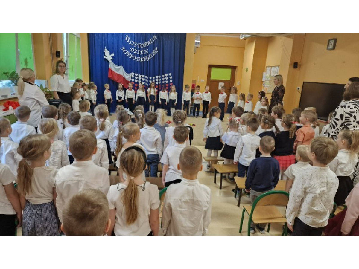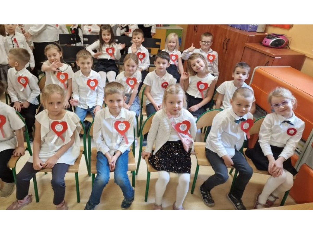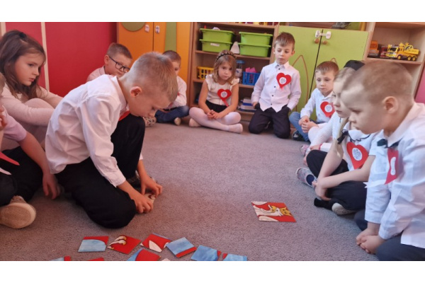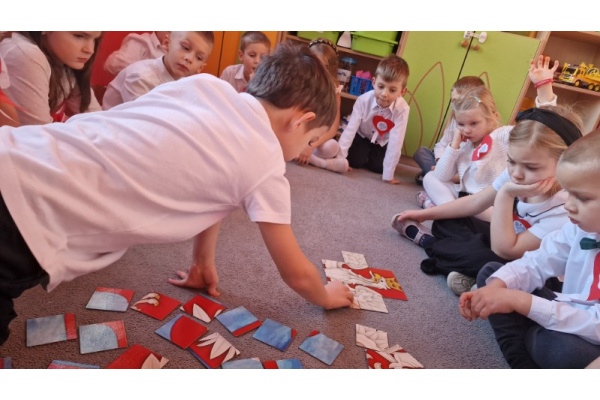 Dnia 7 listopada świętowaliśmy w przedszkolu odzyskanie przez Polskę niepodległości. Przedszkolaki wzięły udział w akcji "Szkoła do Hymnu" i wspólnie odśpiewały Hymn Polski. Braliśmy także udział w uroczystym występie grupy Żabek. Nie zabrakło wspólnych zdjęć, rozmów o polskich symbolach oraz układanie puzzli z Godłem Polski.