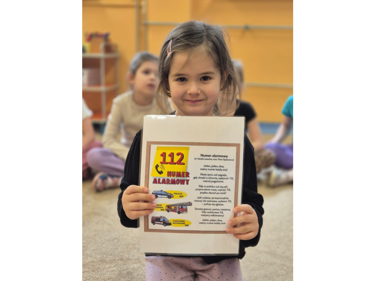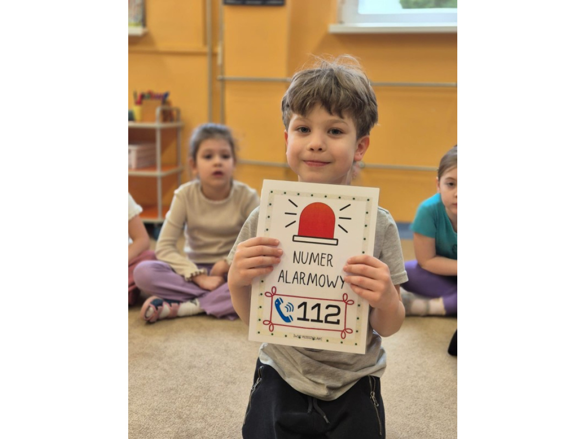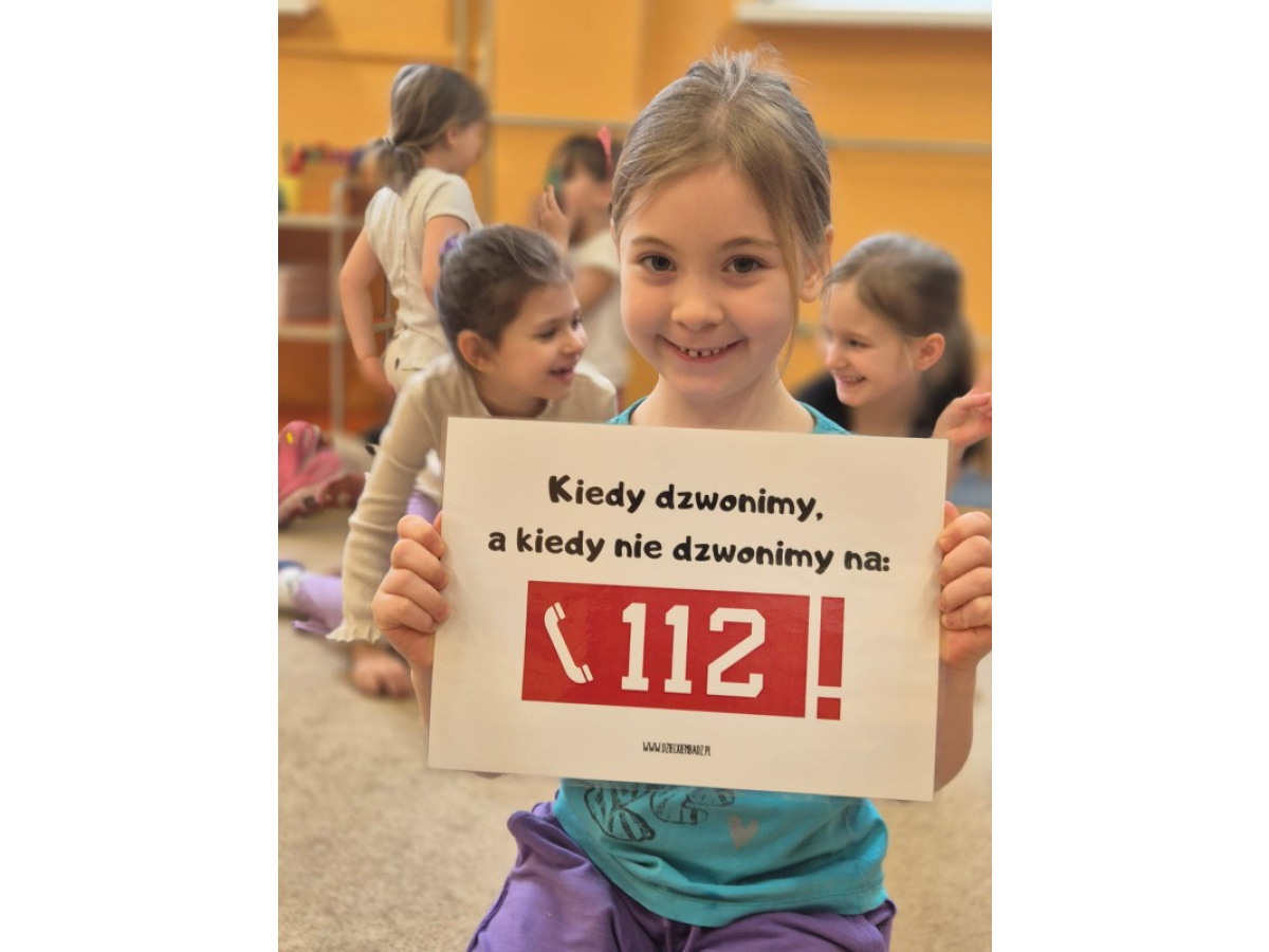 Z okazji Dnia Numeru Alarmowego 112 dzieci uczestniczyły w zajęciach edukacyjnych dotyczących zasad udzielania pierwszej pomocy oraz właściwego korzystania z numerów alarmowych. Przedszkolaki utrwalały, w jakich sytuacjach należy dzwonić pod numer 112 oraz jakie informacje należy przekazać dyspozytorowi. Podczas odgrywania scenki z Panią Patrycją ćwiczyły co zrobić gdy ktoś zasłabnie i jak powinna wygladać rozmowa z dyspozytorem.