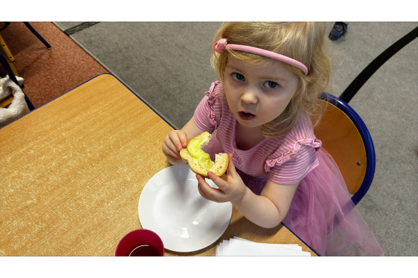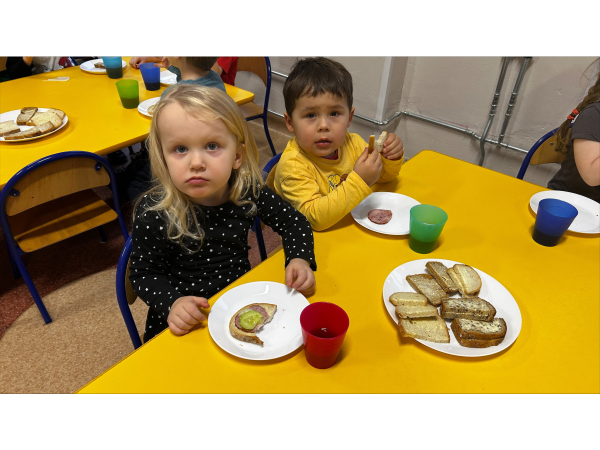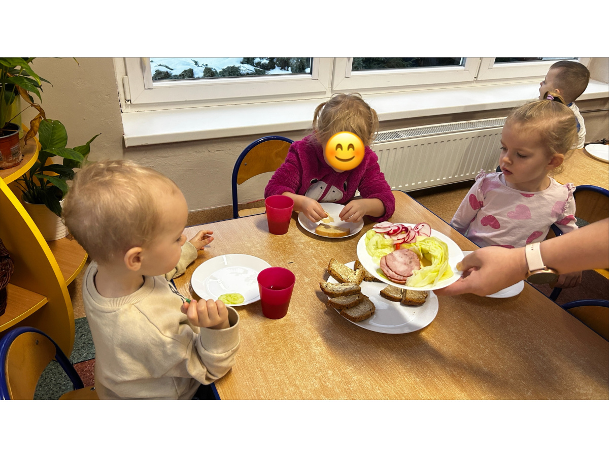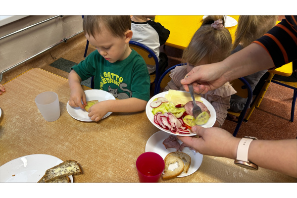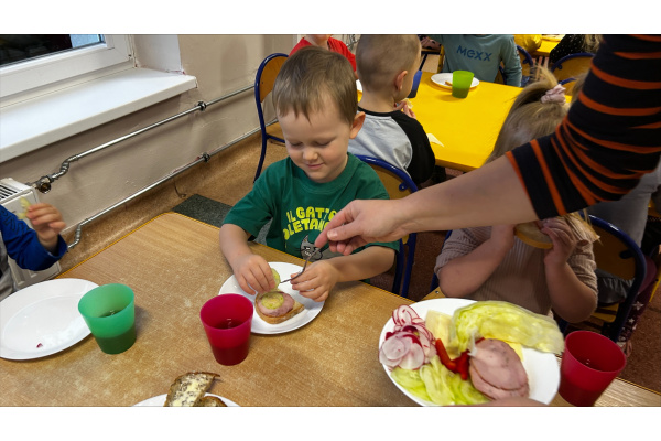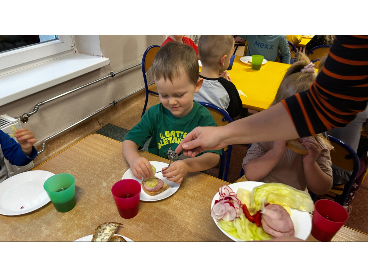 W pierwszą środę miesiąca dzieci z grupy „Misie” przygotowały zdrowe śniadanie, samodzielnie wybierając składniki takie jak sałata, ogórek, pomidor, rzodkiewka, kiełbasa czy ser. Przedszkolaki chętnie sięgały po warzywa i ze smakiem je zajadały.