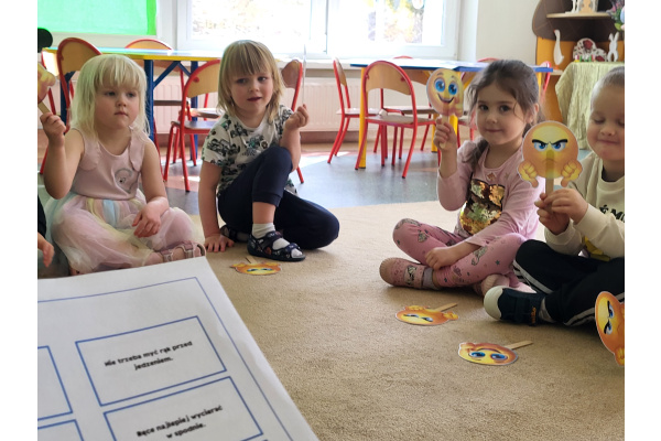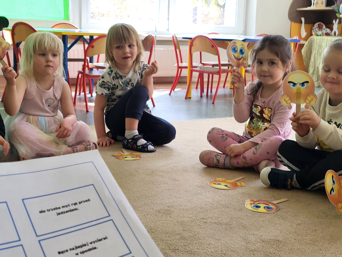 W grupie obchodziliśmy Dzień Zdrowia. Dzieci wcieliły się w rolę „sędziów”- za pomocą wesołej i smutnej minki oceniały, które zachowania są zdrowe i dobre, a które nie sprzyjają zdrowiu. Następnie przedszkolaki pracowały z dużym plakatem, na którym dopasowywały różne czynności do osoby dbającej o zdrowie oraz tej, która o siebie nie dba. Były to ciekawe i angażujące zajęcia, które pomogły dzieciom zrozumieć, jak ważne jest zdrowy styl życia.