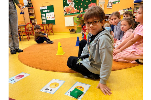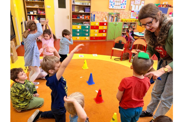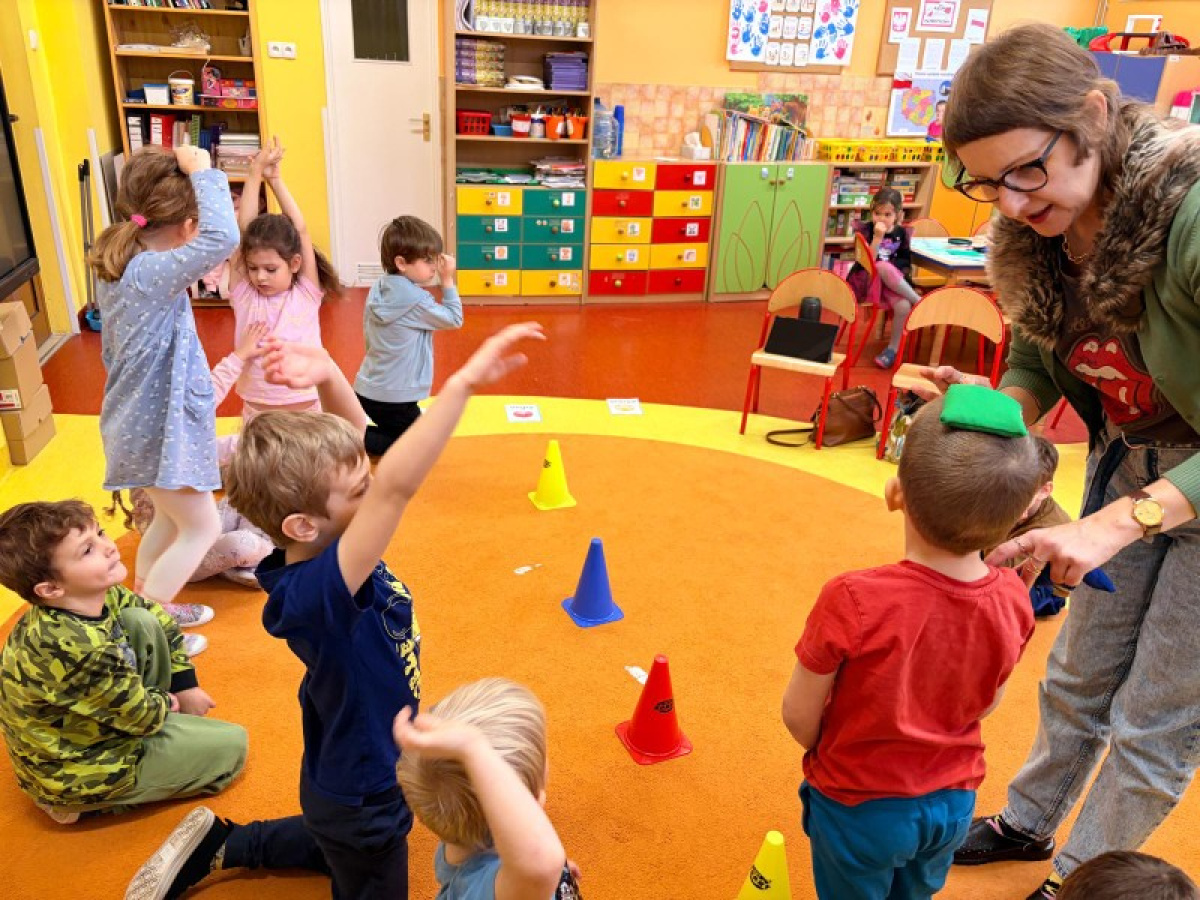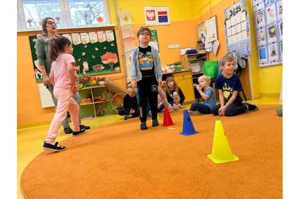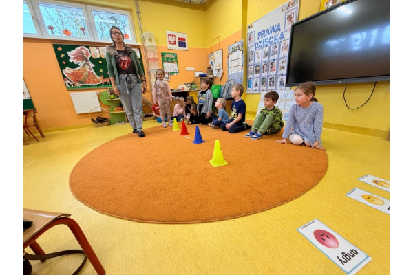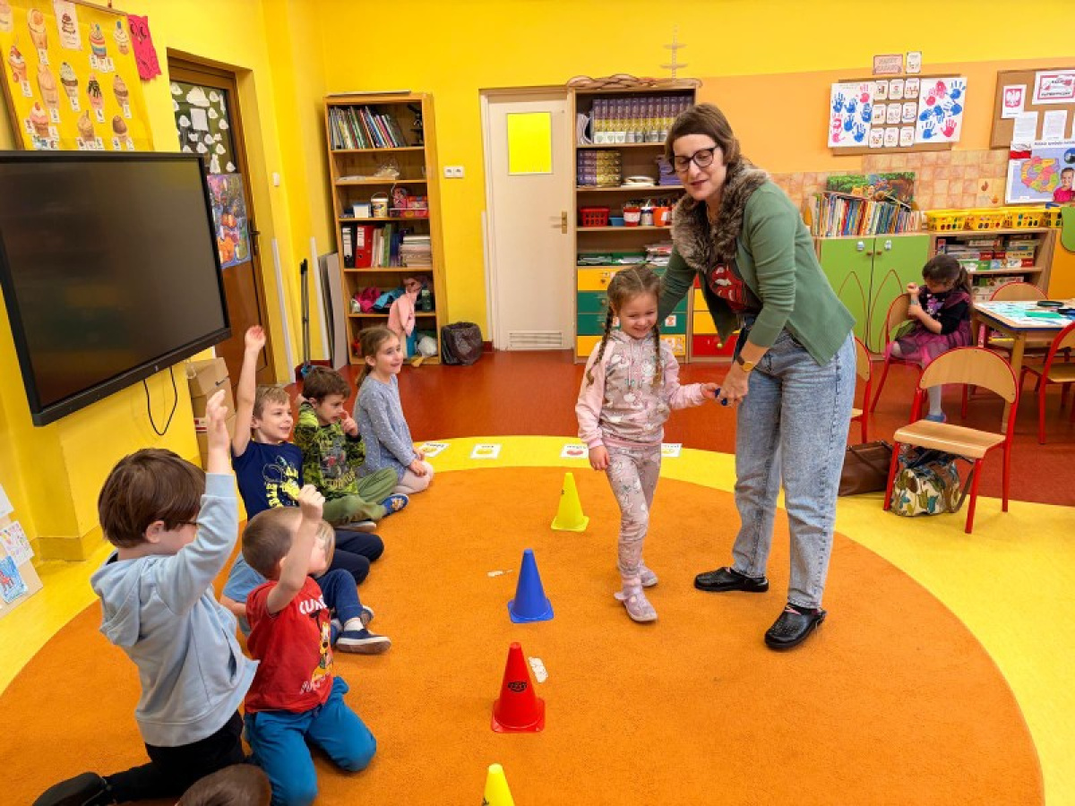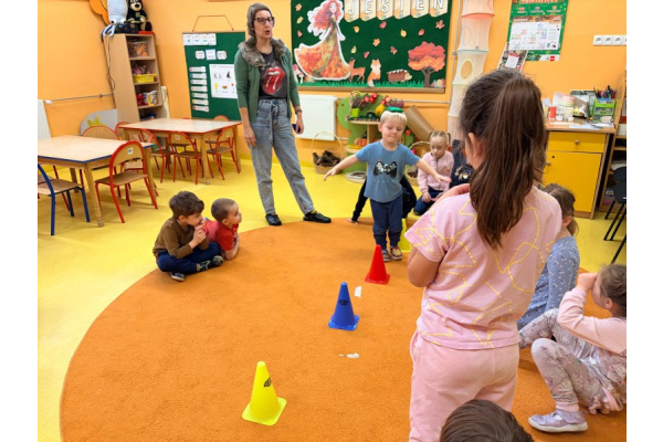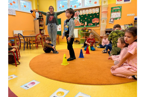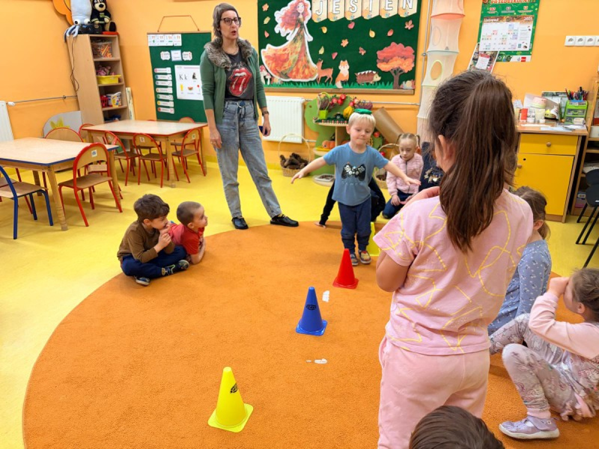 Pani Paulina zdążyła już dobrze poznać Kreciki. Wie, że najwięcej dzieci zapamiętają w ruchu i poprzez działanie. Na angielskim dzieciom w poznawaniu nowego słownictwa pomaga właśnie aktywność fizyczna. Ćwiczenia równoważne, slalomy, tory przeszkód i flashcards okazały się być bardzo dobrym połączeniem.