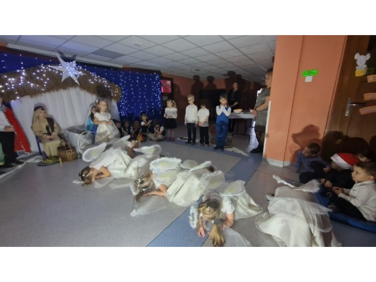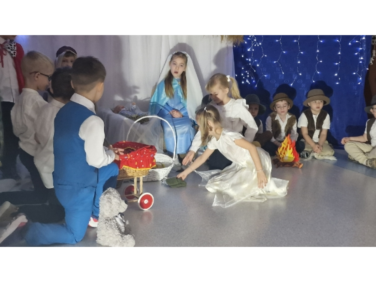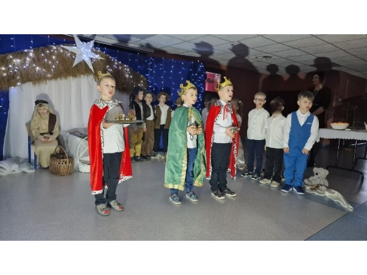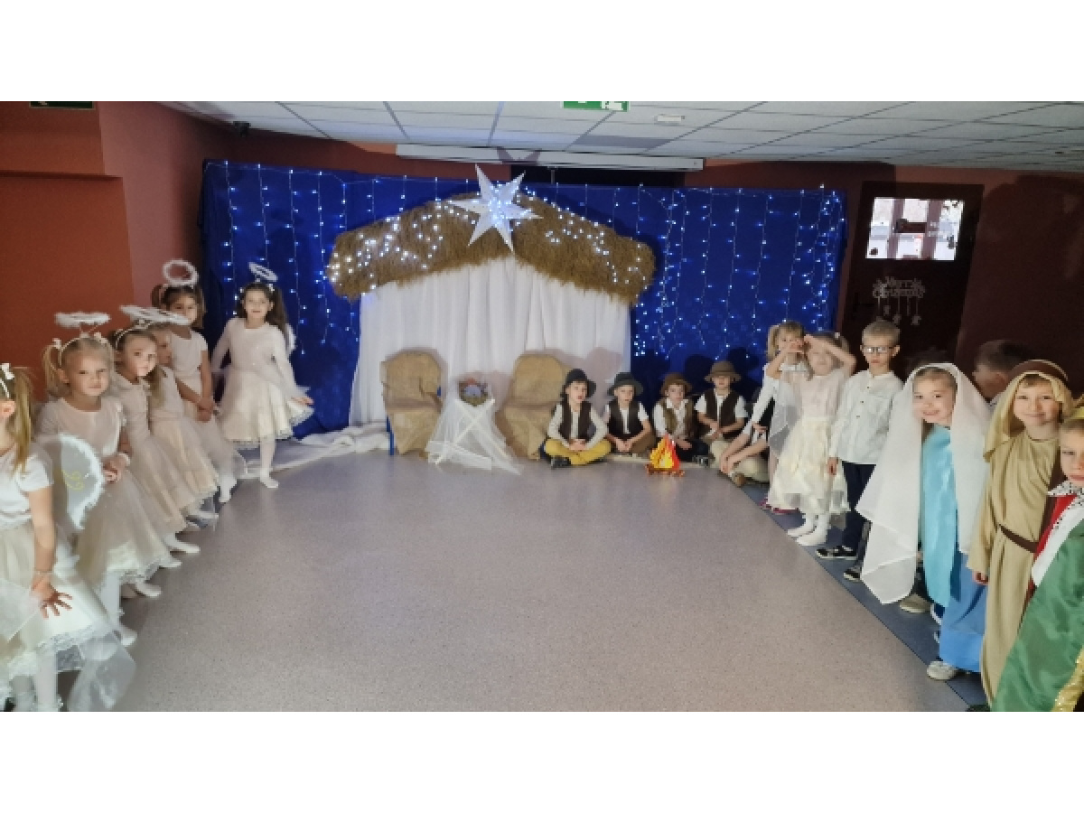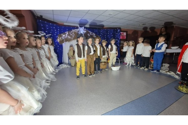 W wyjątkowej, bożonarodzeniowej atmosferze odbyły się jasełka przedszkolne przygotowane przez dzieci z grupy Świetliki. Przedszkolaki z ogromnym zaangażowaniem i radością zaprezentowały historię narodzin Jezusa, wcielając się w role Maryi, Józefa, Aniołków, Pasterzy, Trzech Króli oraz Dzieci- gości. Występ uświetniły piękne kolędy, starannie przygotowane stroje oraz świąteczna scenografia, które wprowadziły zgromadzonych w magiczny, świąteczny nastrój. To wyjątkowe wydarzenie było nie tylko artystycznym występem, ale także okazją do wspólnego przeżywania tradycji bożonarodzeniowych, budowania więzi oraz wzmacniania takich wartości jak miłość, dobro i życzliwość.