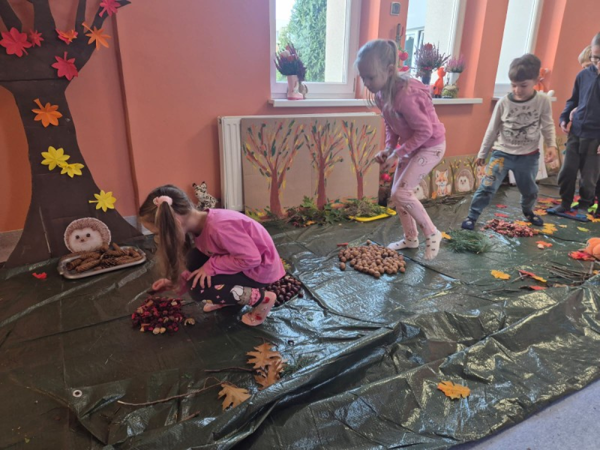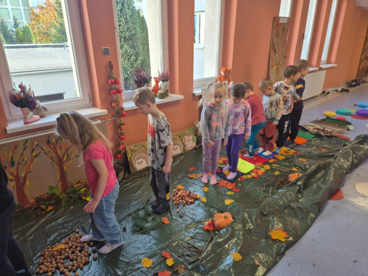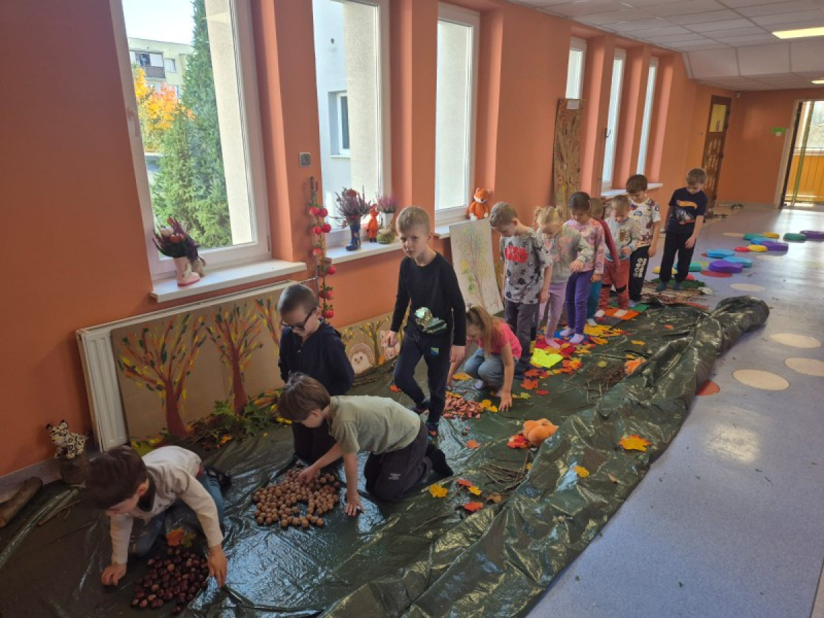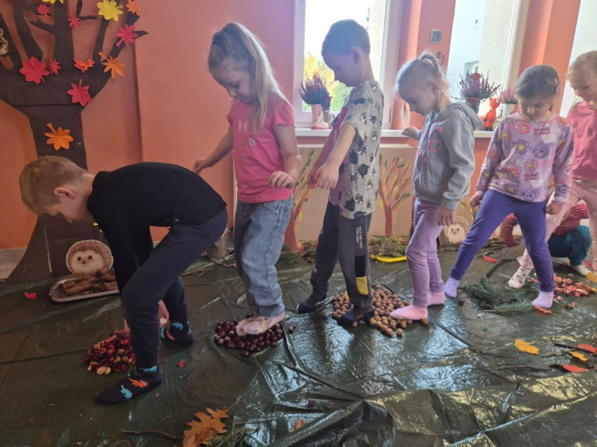 Kreciki codziennie przyglądają się zmianom zachodzącym w przyrodzie. Jesień to pora roku, która maluje świat wspaniałymi kolorami, jak również wiele może nam ofiarować. Od kilku dni zbieraliśmy wszelkie dary jesieni. Kasztany, orzechy, szyszki, liście... Wszystko to okazało się drogocennymi skarbami, dzięki którym w pochmurny dzień mogliśmy stworzyć w przedszkolu własną jesienną ścieżkę sensoryczną.