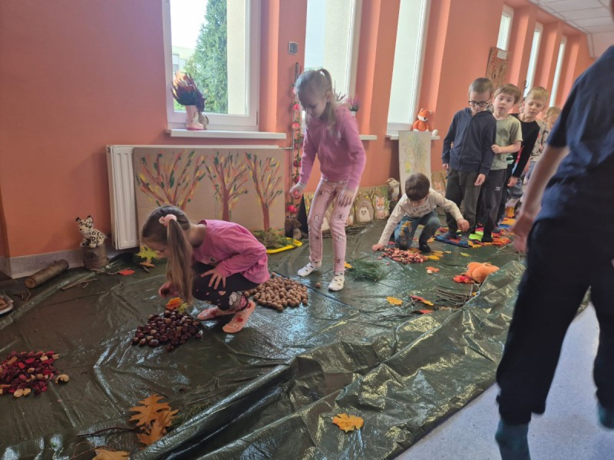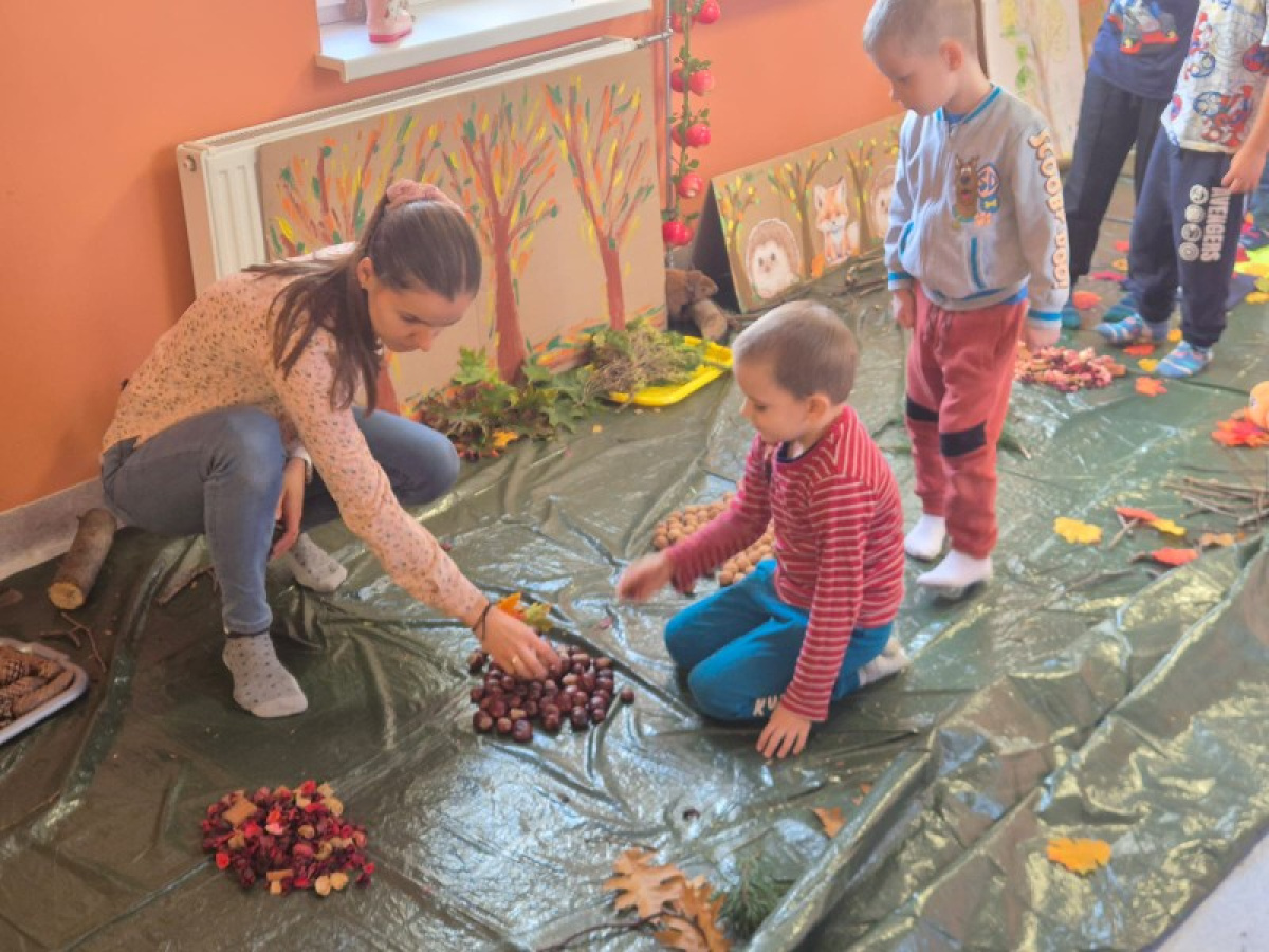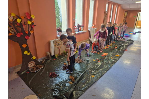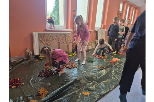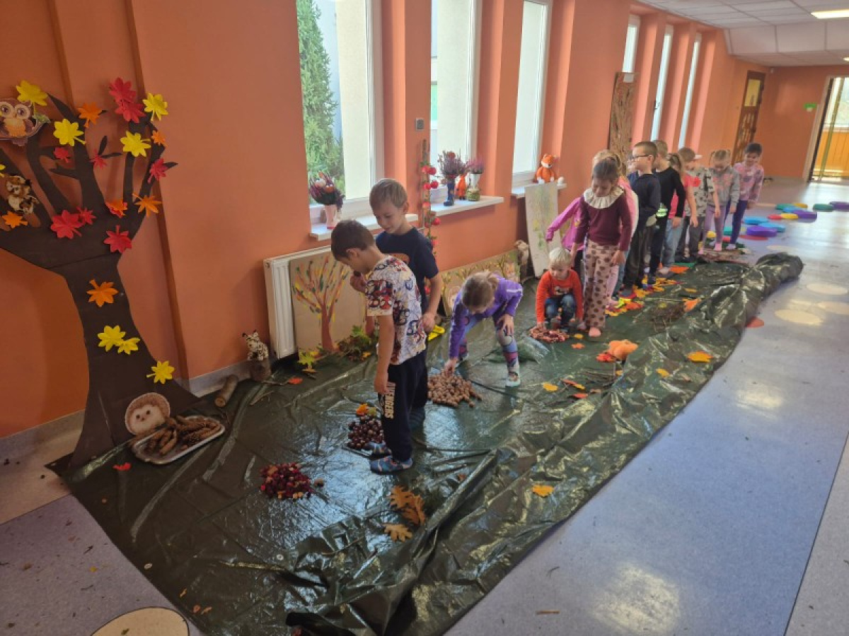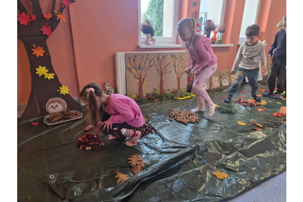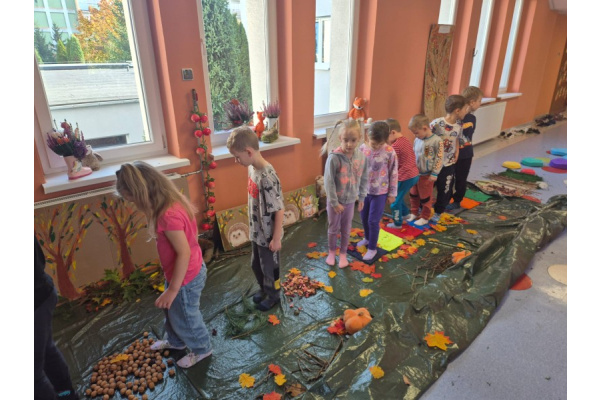 Kreciki codziennie przyglądają się zmianom zachodzącym w przyrodzie. Jesień to pora roku, która maluje świat wspaniałymi kolorami, jak również wiele może nam ofiarować. Od kilku dni zbieraliśmy wszelkie dary jesieni. Kasztany, orzechy, szyszki, liście... Wszystko to okazało się drogocennymi skarbami, dzięki którym w pochmurny dzień mogliśmy stworzyć w przedszkolu własną jesienną ścieżkę sensoryczną.
