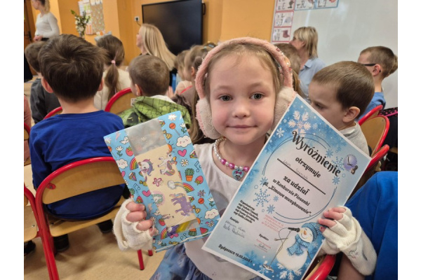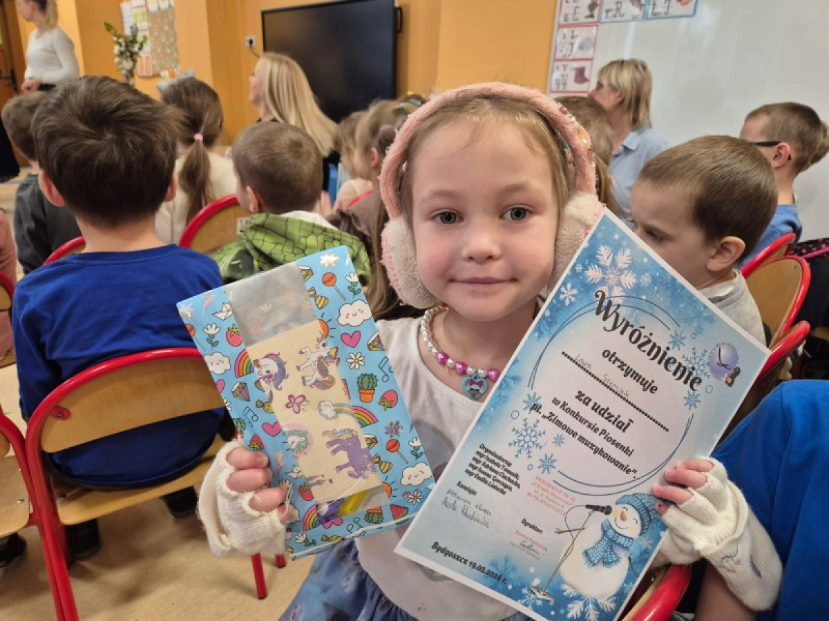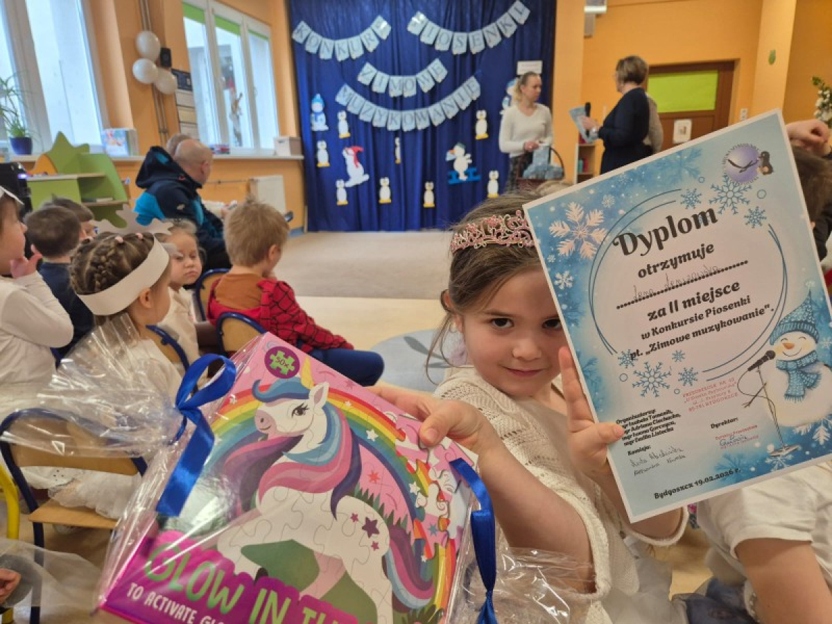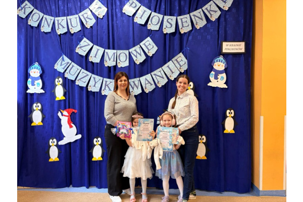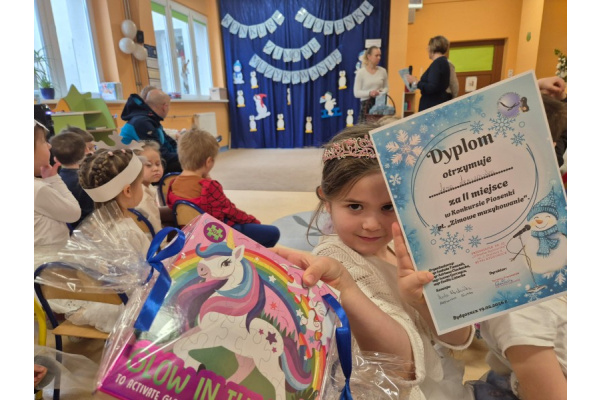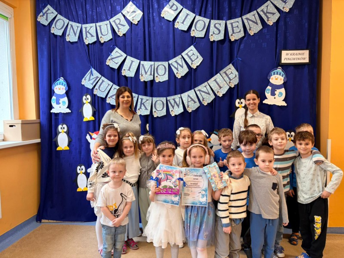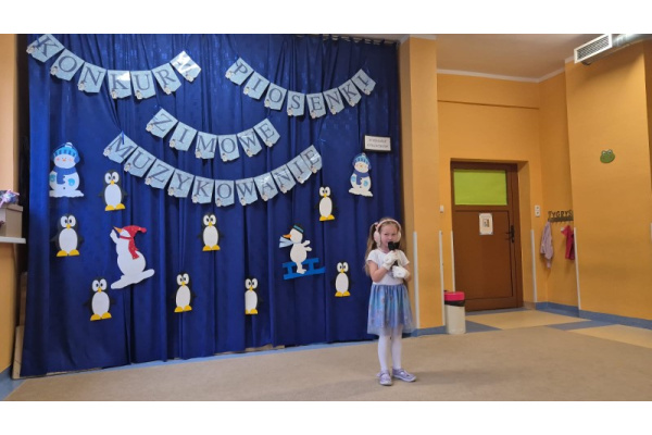 W czwartek 19 lutego odbył się przedszkolny konkurs piosenki "Zimowe muzykowanie". Wystąpiły w nim nasze dwie solistki: Lena, która zajęła drugie miejsce oraz Laura, która otrzymała wyróżnienie. Obie dziewczynki wystąpiły w kategorii wiekowej 5-cio i 6-cio latków. Dodatkowo wszystkie dzieci z grupy Kreciki dzięki uprzejmości organizatorek miały zaszczyt wystąpić przed przedszkolną widownią w przerwie konkursu. Dzieci oraz Pani Marta przygotowały piosenkę "Tupu, tup po śniegu". Dodatkowym walorem artystycznym była muzyka grana na żywo na ukulele, klawesach, janczarach oraz guiro. Dziękujemy za możliwość podzielenia się naszymi talentami.