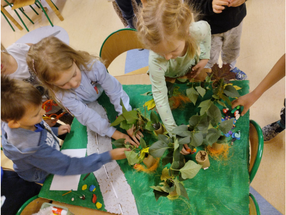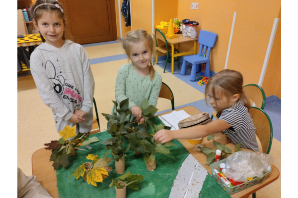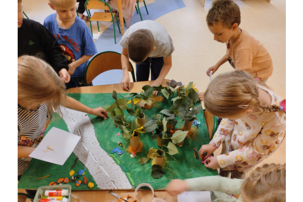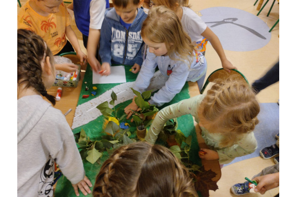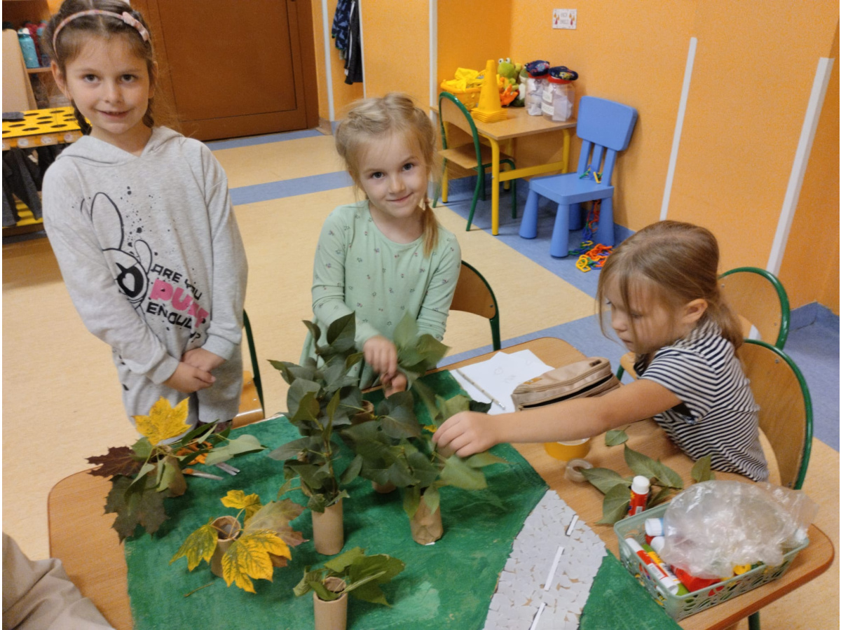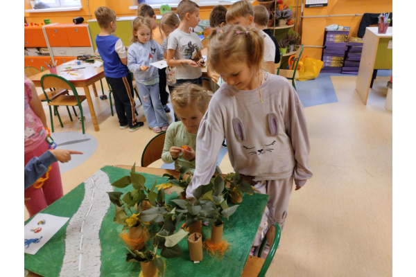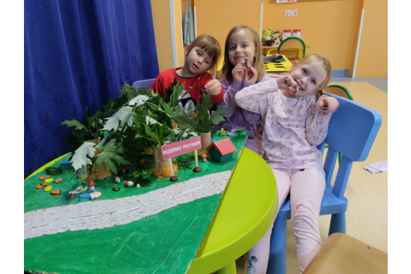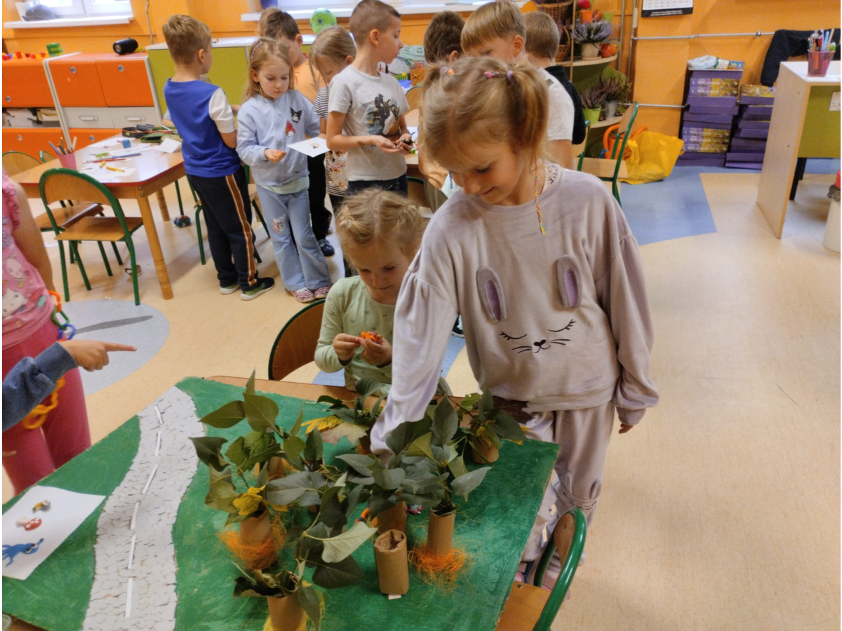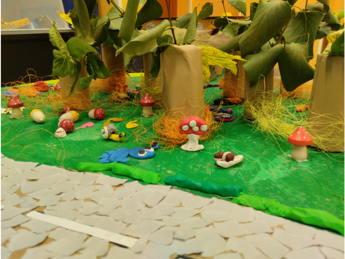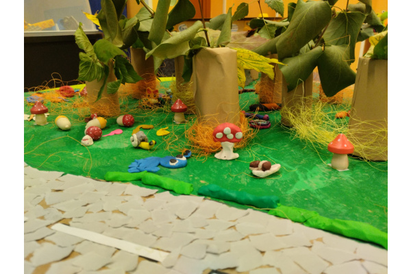 Z okazji nadejścia nowej pory roku, jesieni, dzieci z naszej grupy wspólnie wykonały makietę lasu. Chętne przedszkolaki przez kilka dni malowały farbami, wycinały, lepiły z plasteliny, zbierały liście, orzechy, kasztany. Z dużym zaangażowaniem i cierpliwością tworzyły tak, aby makieta przedstawiała barwy jesieni oraz jej leśne dary. Wspólne dzieło można było obejrzeć w holu głównym przedszkola. Brawo Żabki!