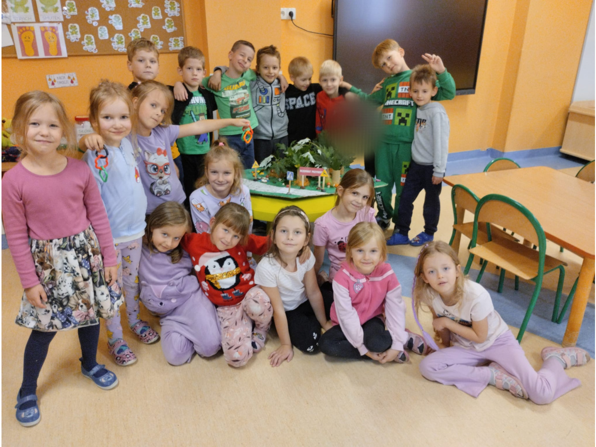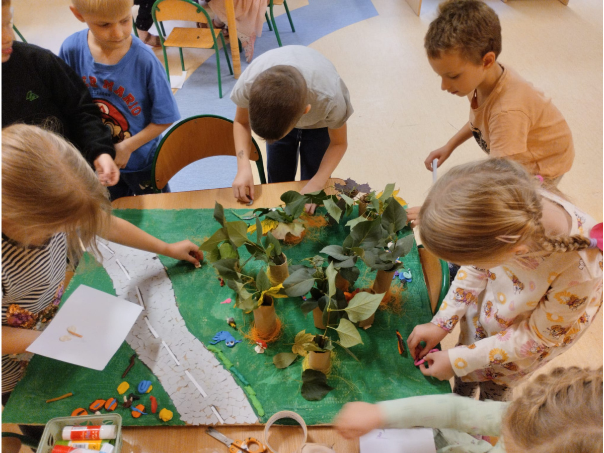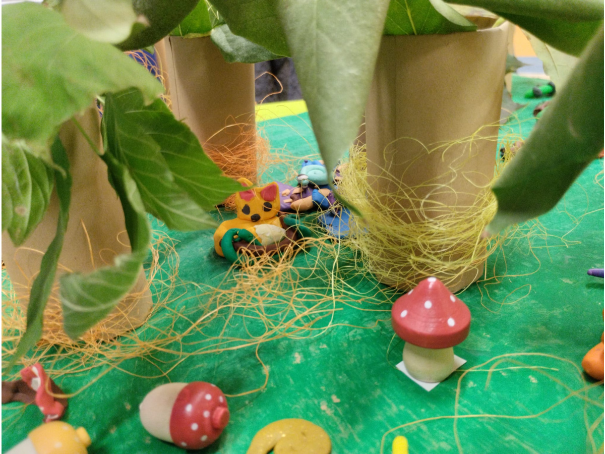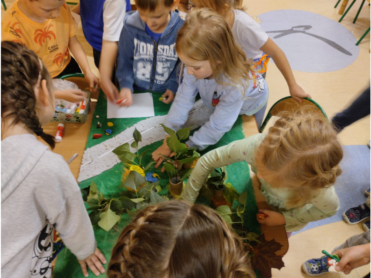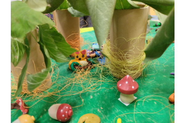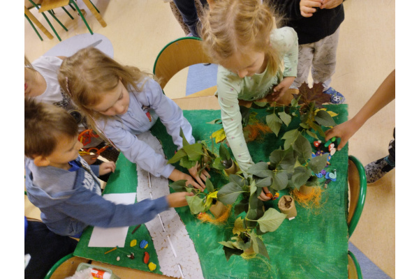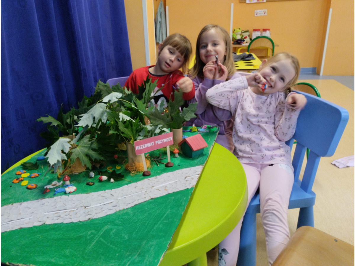 Z okazji nadejścia nowej pory roku, jesieni, dzieci z naszej grupy wspólnie wykonały makietę lasu. Chętne przedszkolaki przez kilka dni malowały farbami, wycinały, lepiły z plasteliny, zbierały liście, orzechy, kasztany. Z dużym zaangażowaniem i cierpliwością tworzyły tak, aby makieta przedstawiała barwy jesieni oraz jej leśne dary. Wspólne dzieło można było obejrzeć w holu głównym przedszkola. Brawo Żabki!