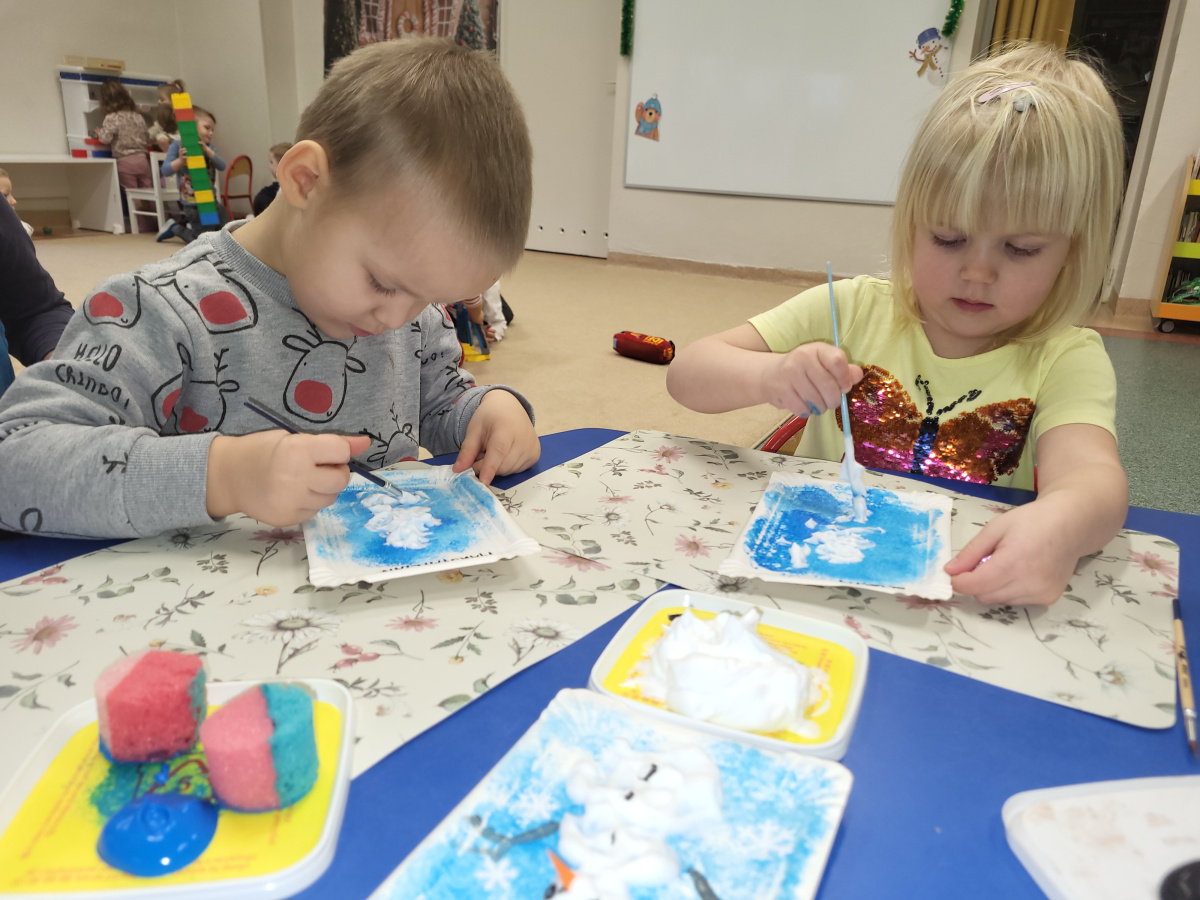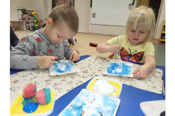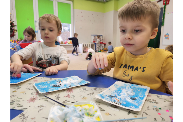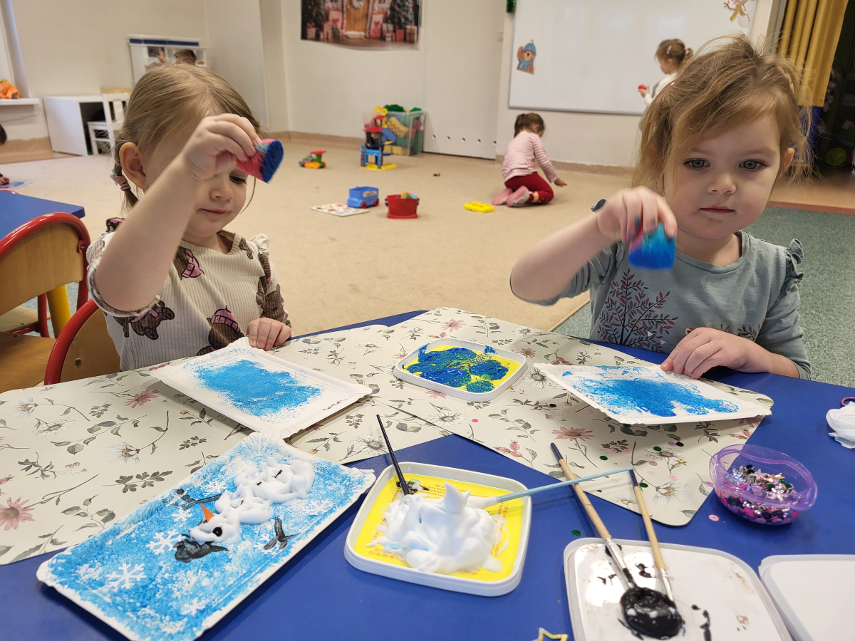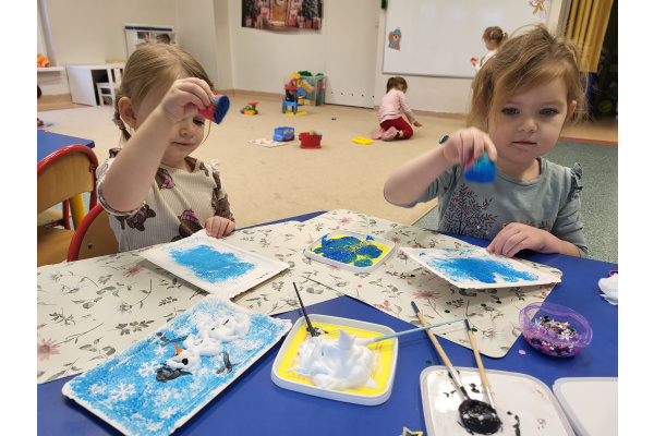 W jednym ze styczniowych dni dzieci tworzyły zimowe prace plastyczne – malowały bałwanki. Najpierw gąbką pokrywały kartki niebieską farbą, tworząc zimowe tło, a następnie z wykorzystaniem pianki do golenia formowały bałwanki. Dzieci świetnie się przy tym bawiły, a efektem ich pracy były piękne, kreatywne prace plastyczne.