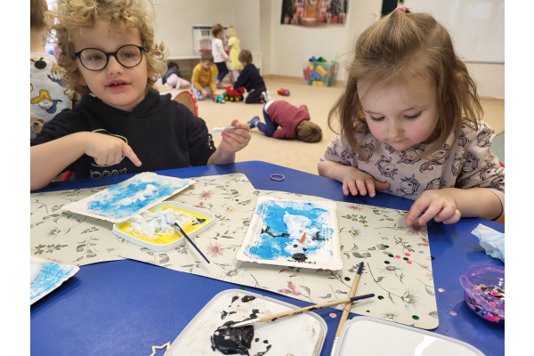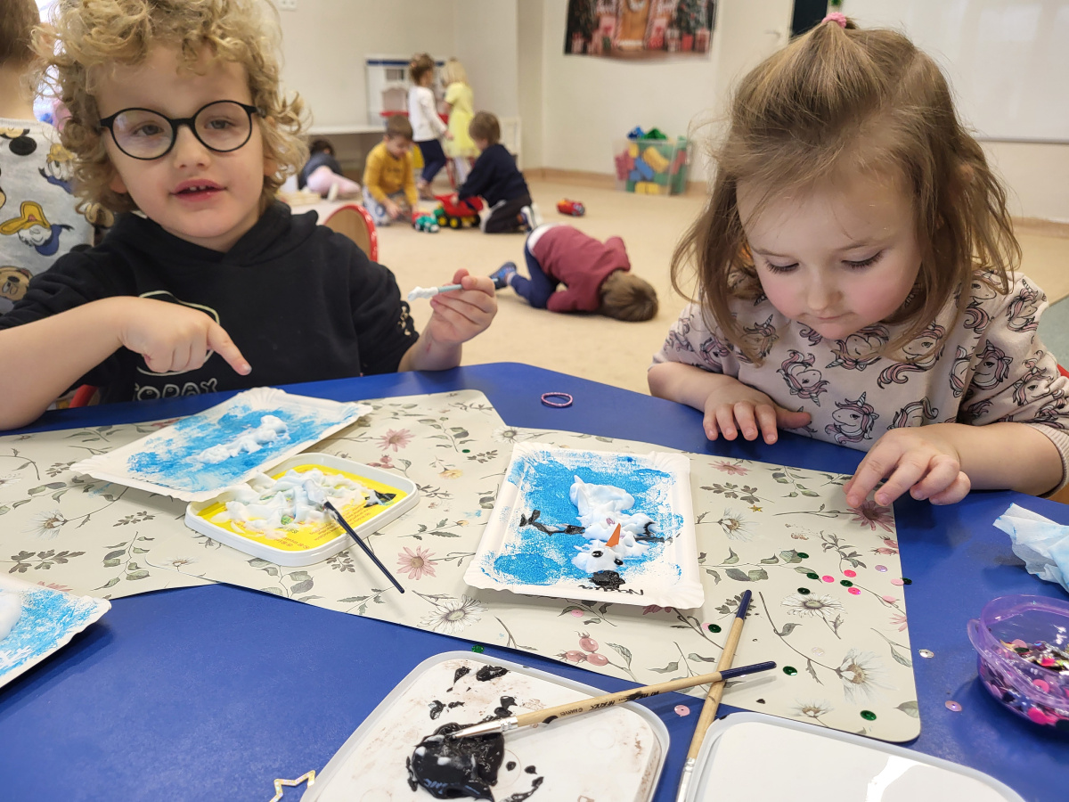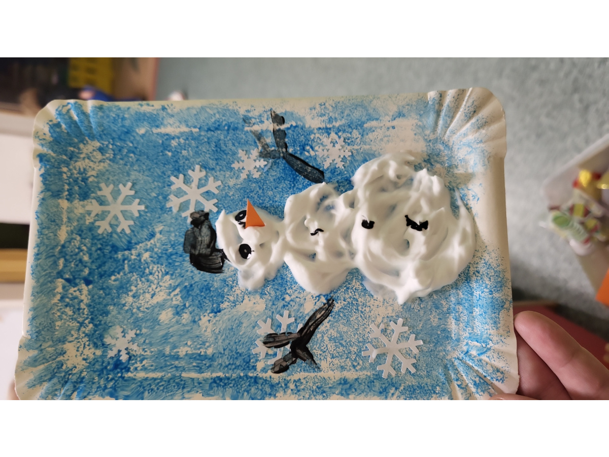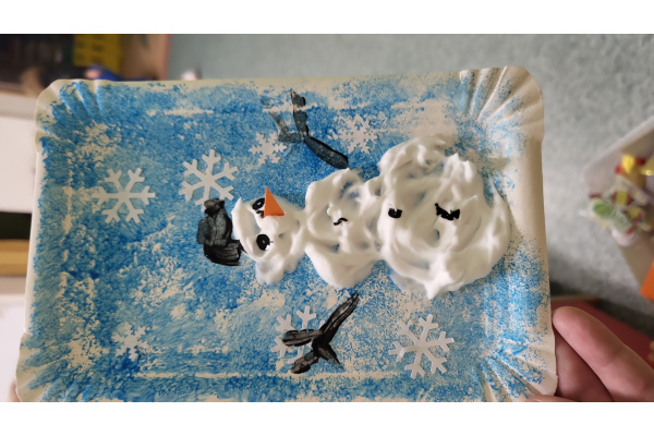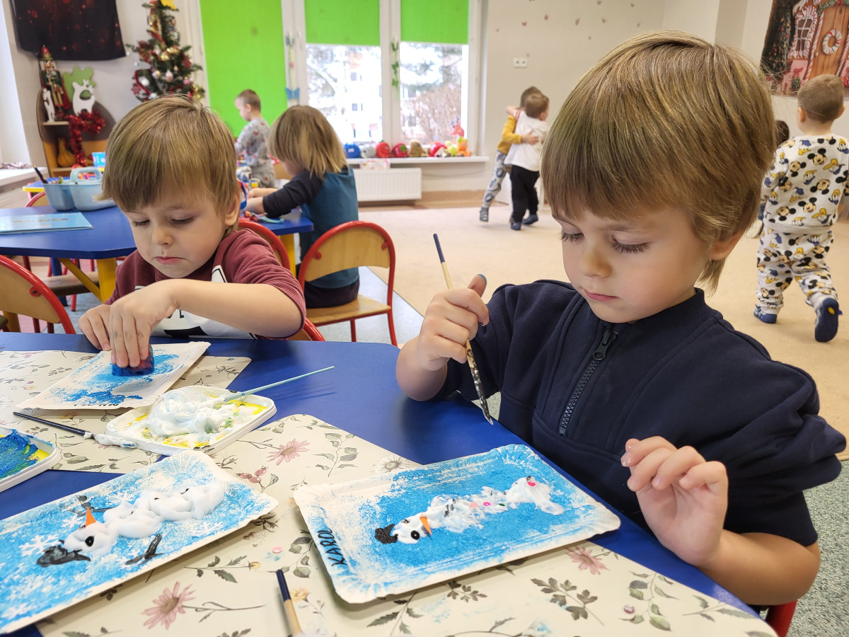 W jednym ze styczniowych dni dzieci tworzyły zimowe prace plastyczne – malowały bałwanki. Najpierw gąbką pokrywały kartki niebieską farbą, tworząc zimowe tło, a następnie z wykorzystaniem pianki do golenia formowały bałwanki. Dzieci świetnie się przy tym bawiły, a efektem ich pracy były piękne, kreatywne prace plastyczne.
