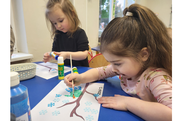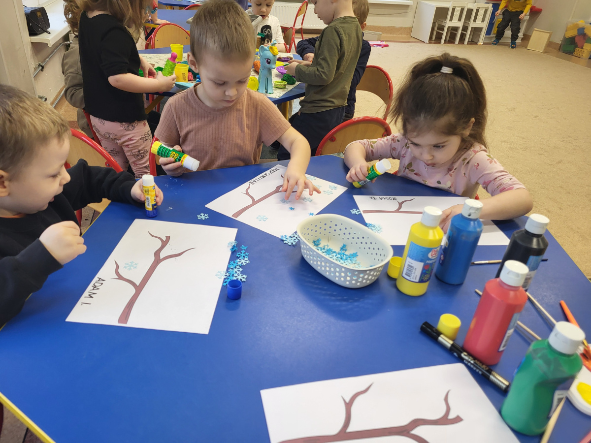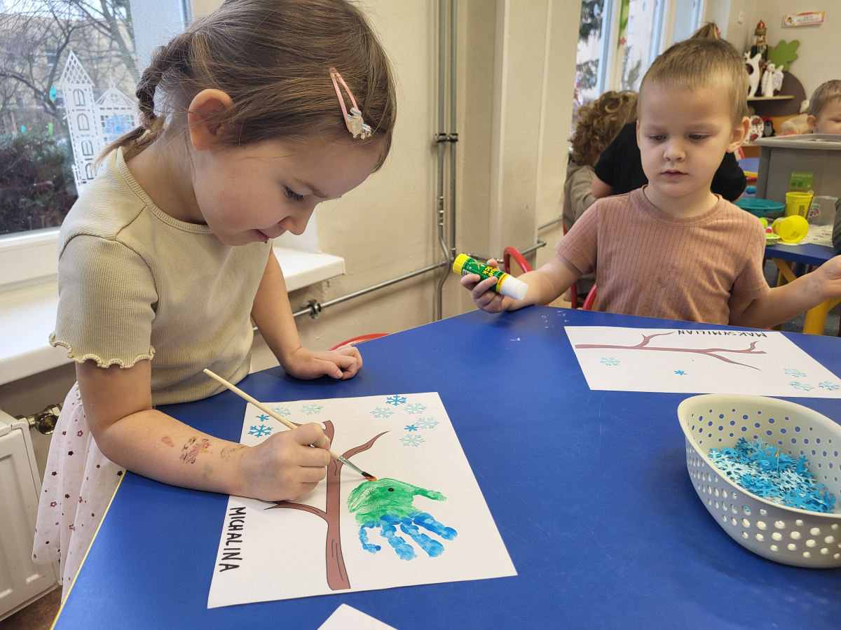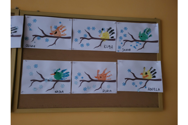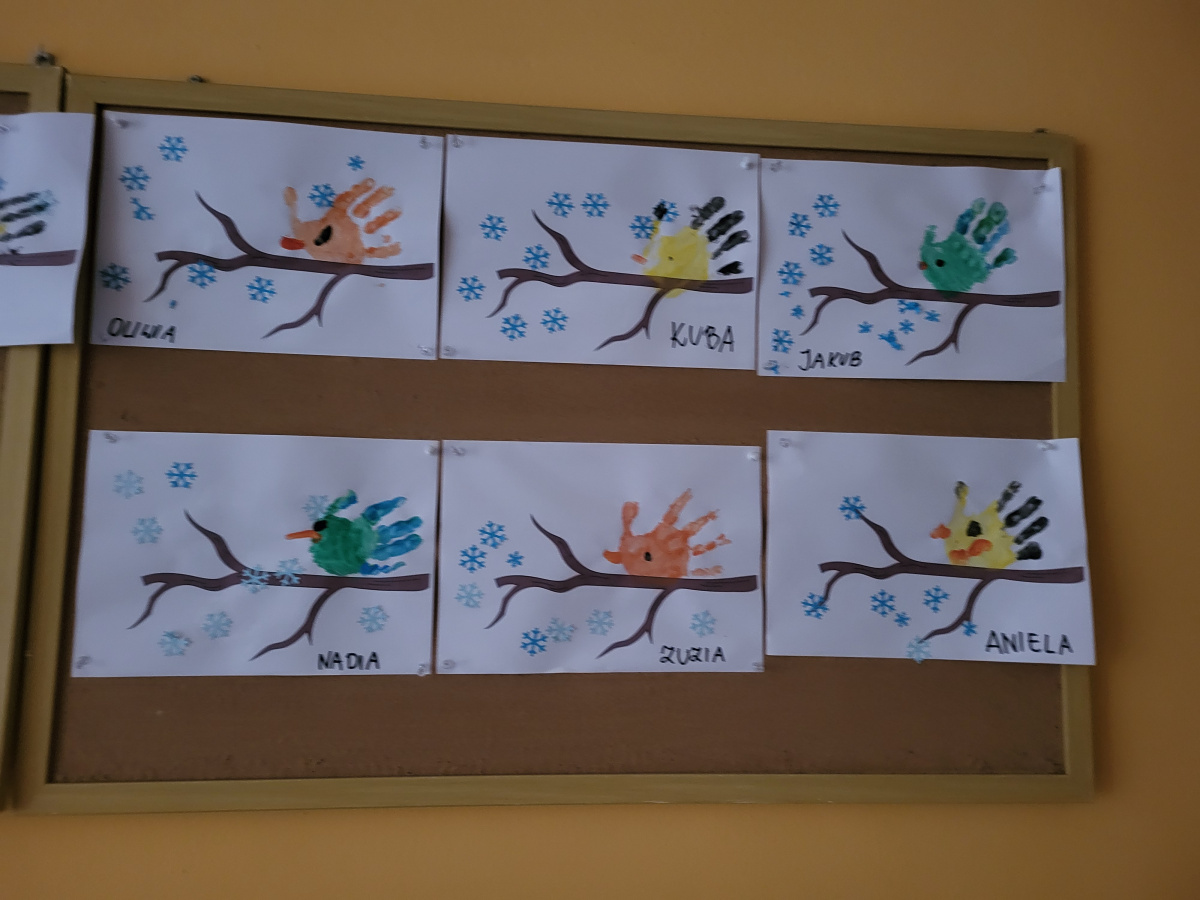 Dzieci z grupy „Motylki” wykonały pracę plastyczną, tworząc zimowe ptaszki z odcisków pomalowanych dłoni. Na zakończenie dzieci domalowały ptaszkom dziób i oczka, rozwijając kreatywność oraz sprawność manualną.