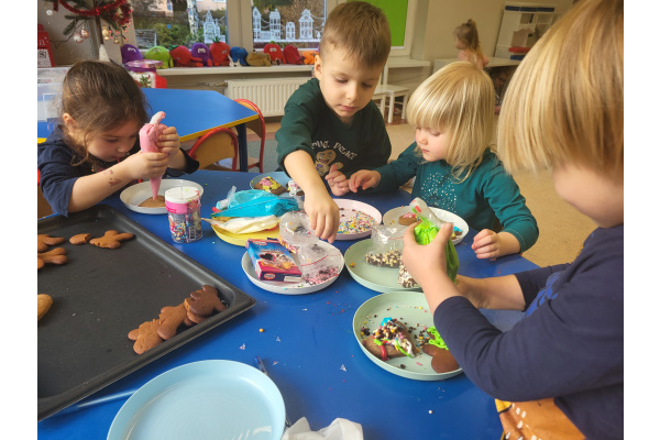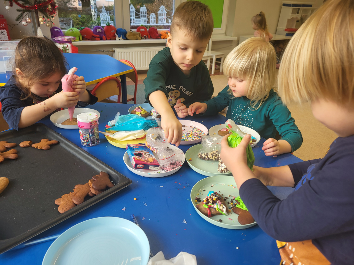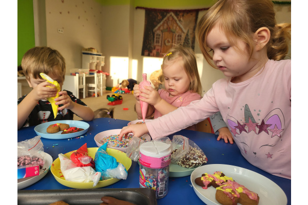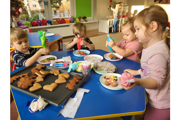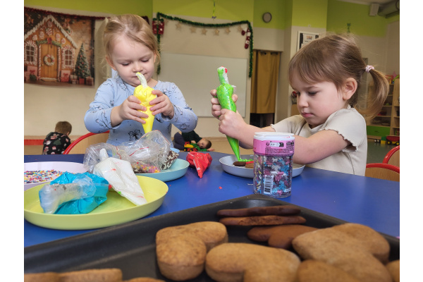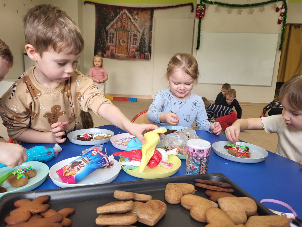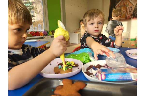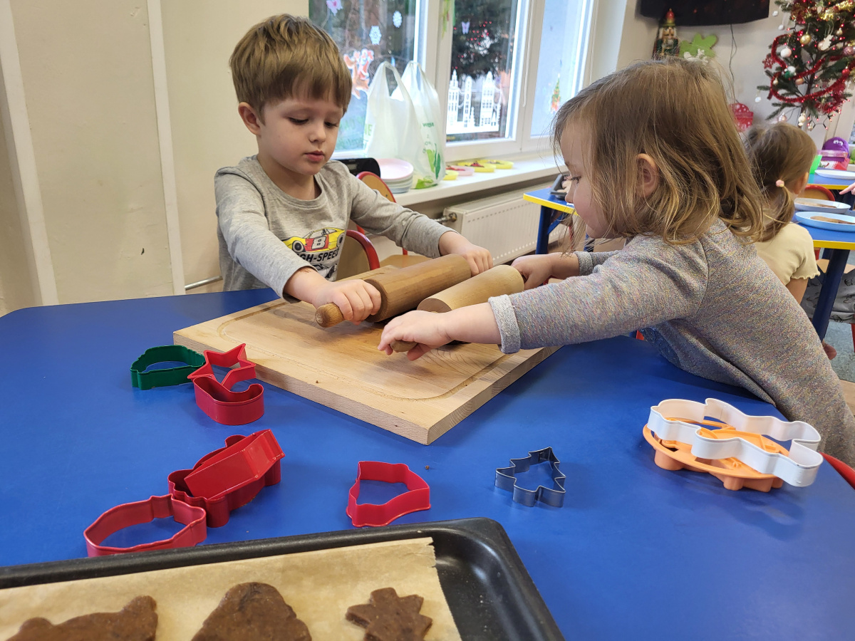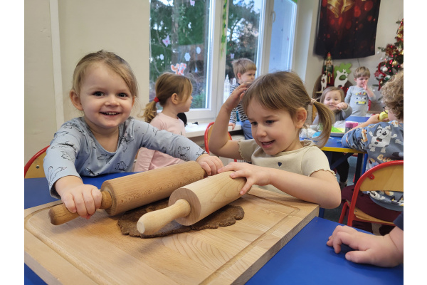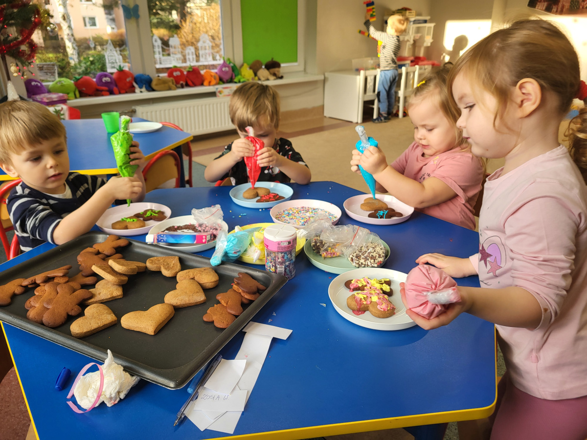 W grudniu dzieci z grupy „Motylki” wzięły udział w pachnących świętami zajęciach – pieczeniu pierniczków. Dzięki uprzejmości dziadka Anieli otrzymaliśmy ciasto piernikowe oraz gotowe, upieczone ciasteczka, które przedszkolaki mogły dekorować. Dzieci z radością wałkowały ciasto i wykrawały różne kształty pierniczków, świetnie się przy tym bawiąc. Przygotowane pierniczki dzieci zabrały do domu, a także były one pysznym deserem podczas przedszkolnej Wigilii. Serdecznie dziękujemy dziadkowi Anieli za ten słodki, świąteczny gest.
