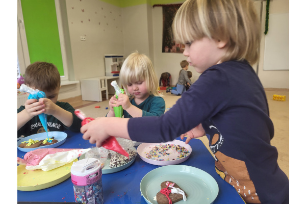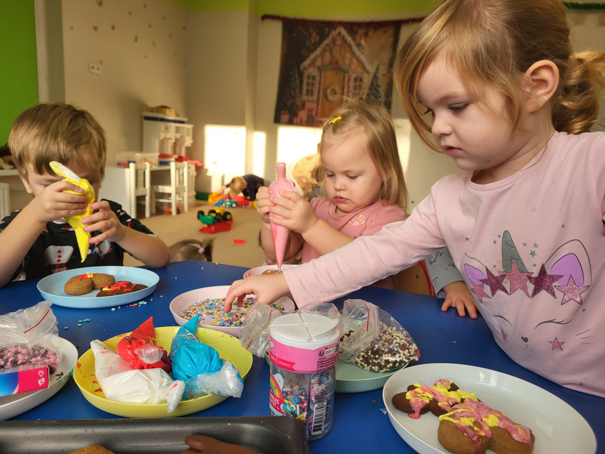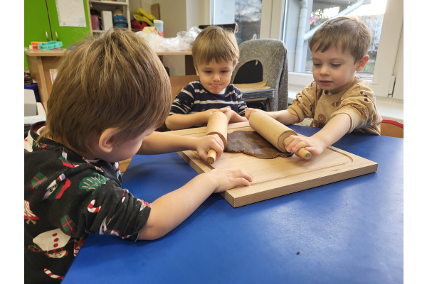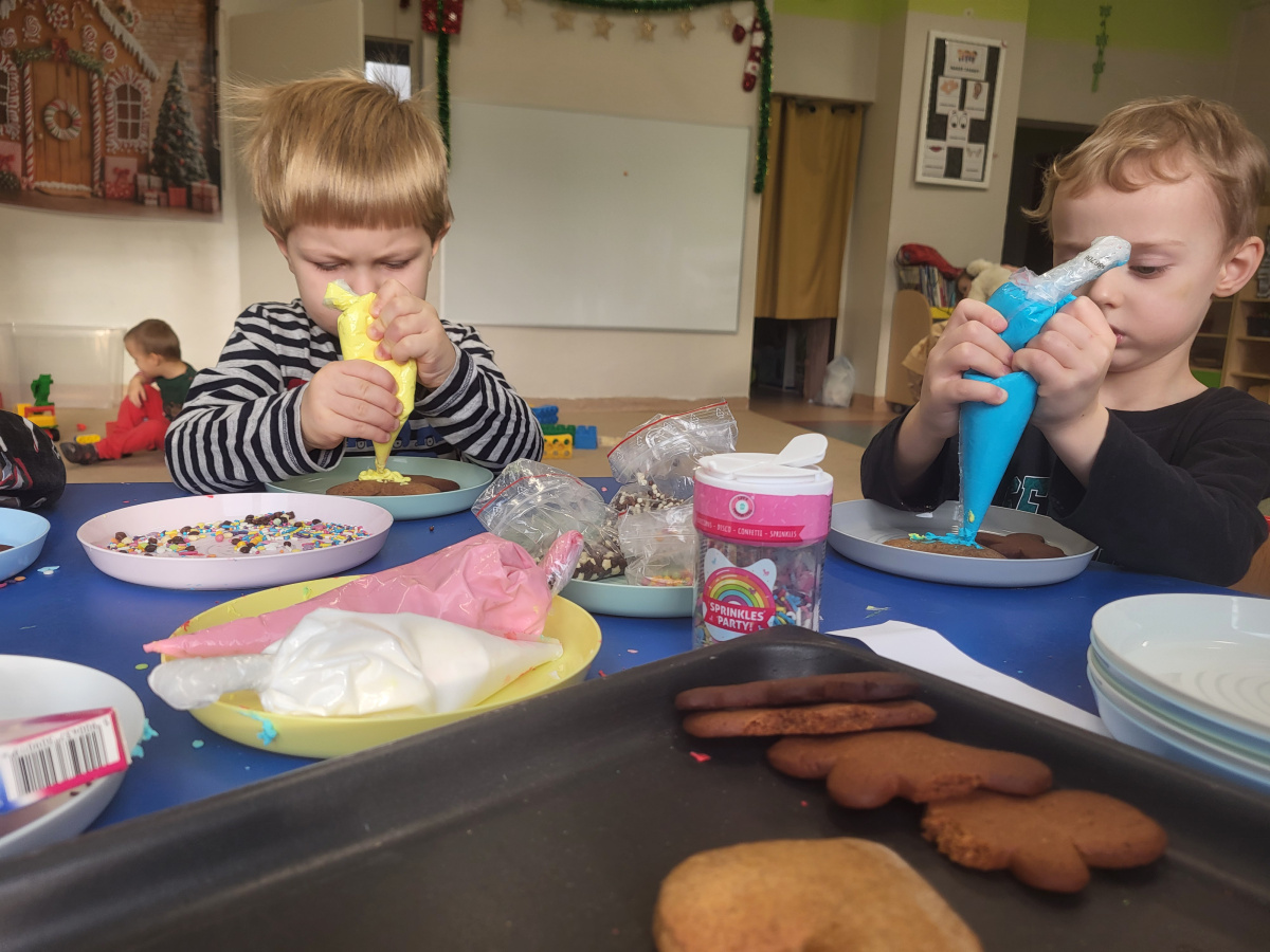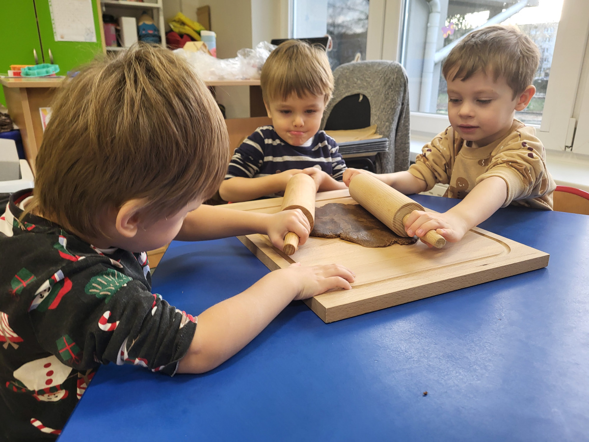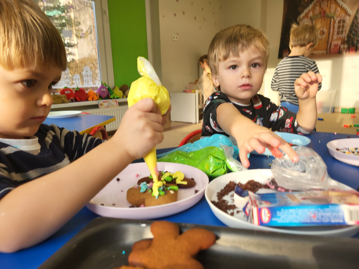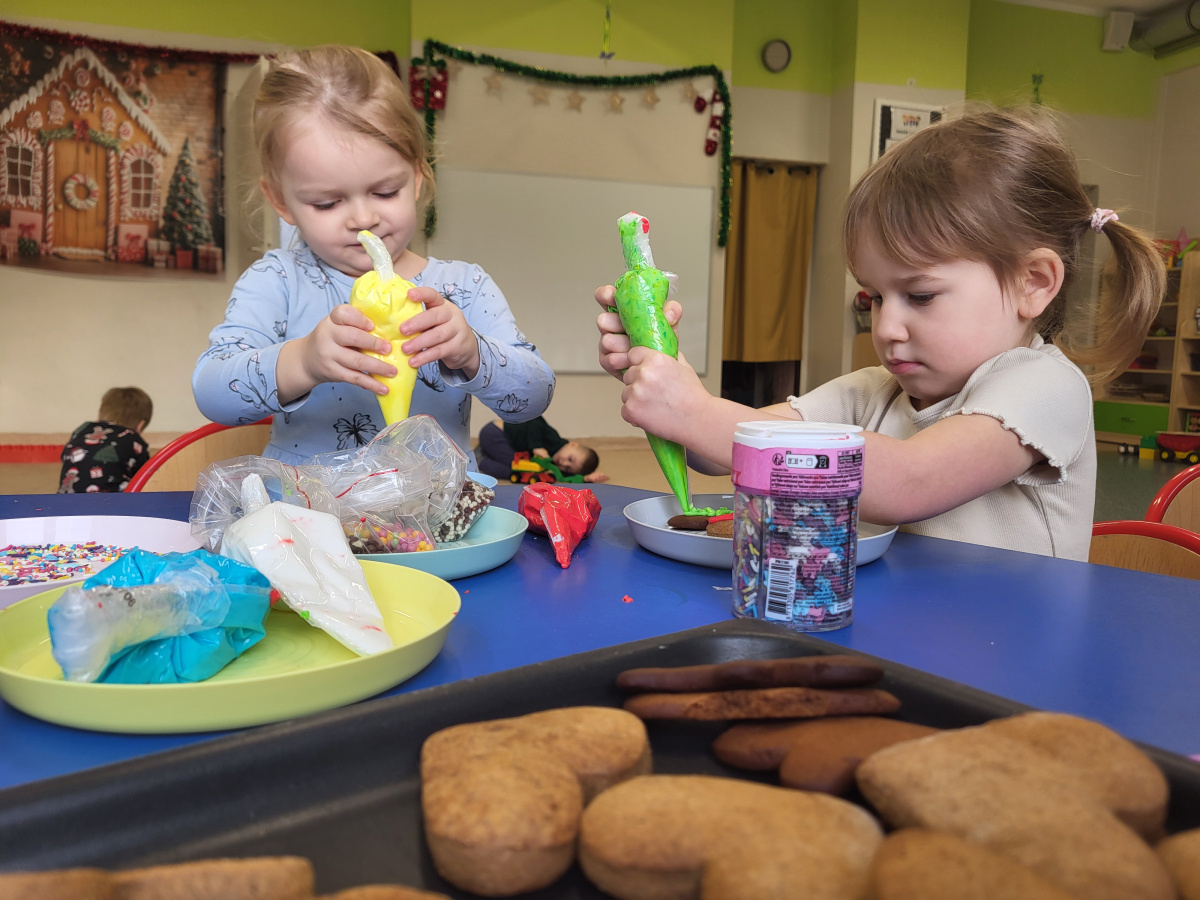 W grudniu dzieci z grupy „Motylki” wzięły udział w pachnących świętami zajęciach – pieczeniu pierniczków. Dzięki uprzejmości dziadka Anieli otrzymaliśmy ciasto piernikowe oraz gotowe, upieczone ciasteczka, które przedszkolaki mogły dekorować. Dzieci z radością wałkowały ciasto i wykrawały różne kształty pierniczków, świetnie się przy tym bawiąc. Przygotowane pierniczki dzieci zabrały do domu, a także były one pysznym deserem podczas przedszkolnej Wigilii. Serdecznie dziękujemy dziadkowi Anieli za ten słodki, świąteczny gest.