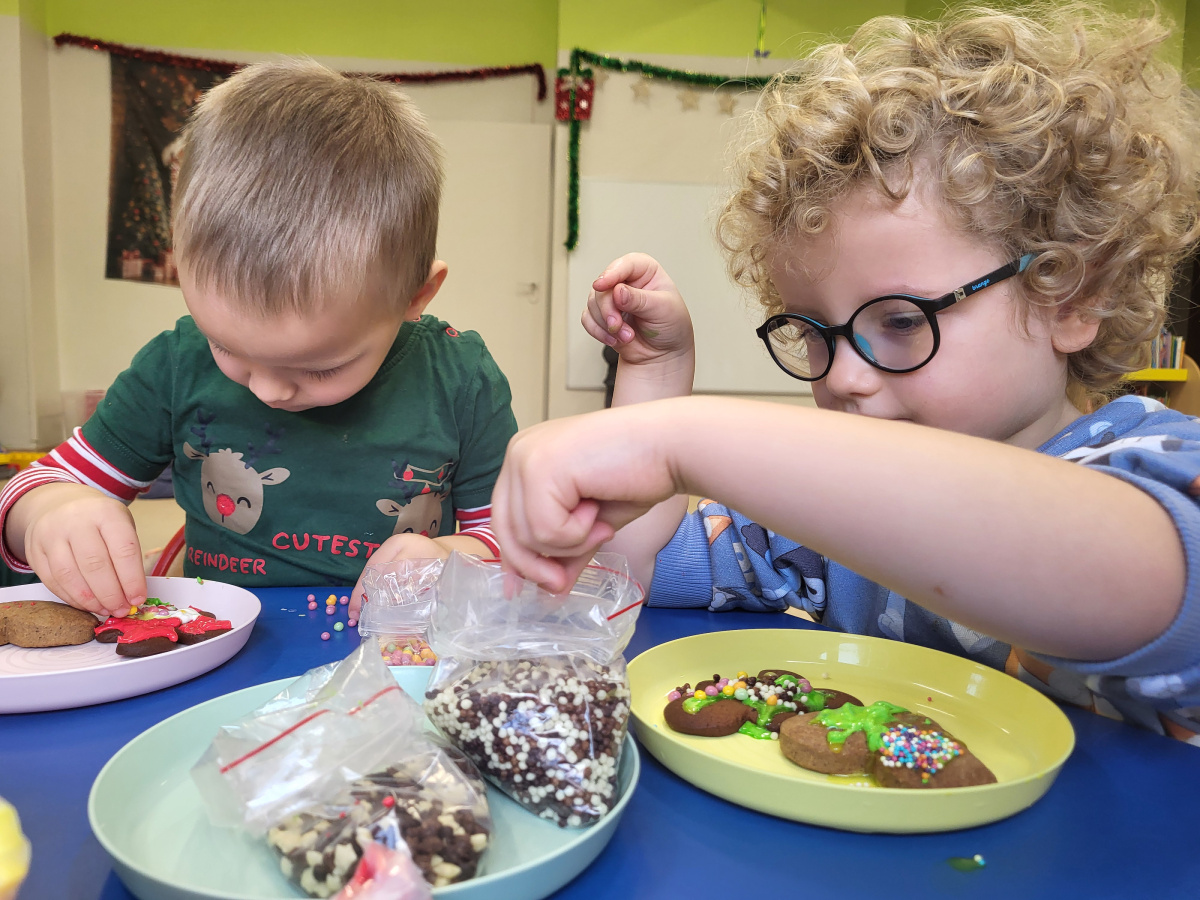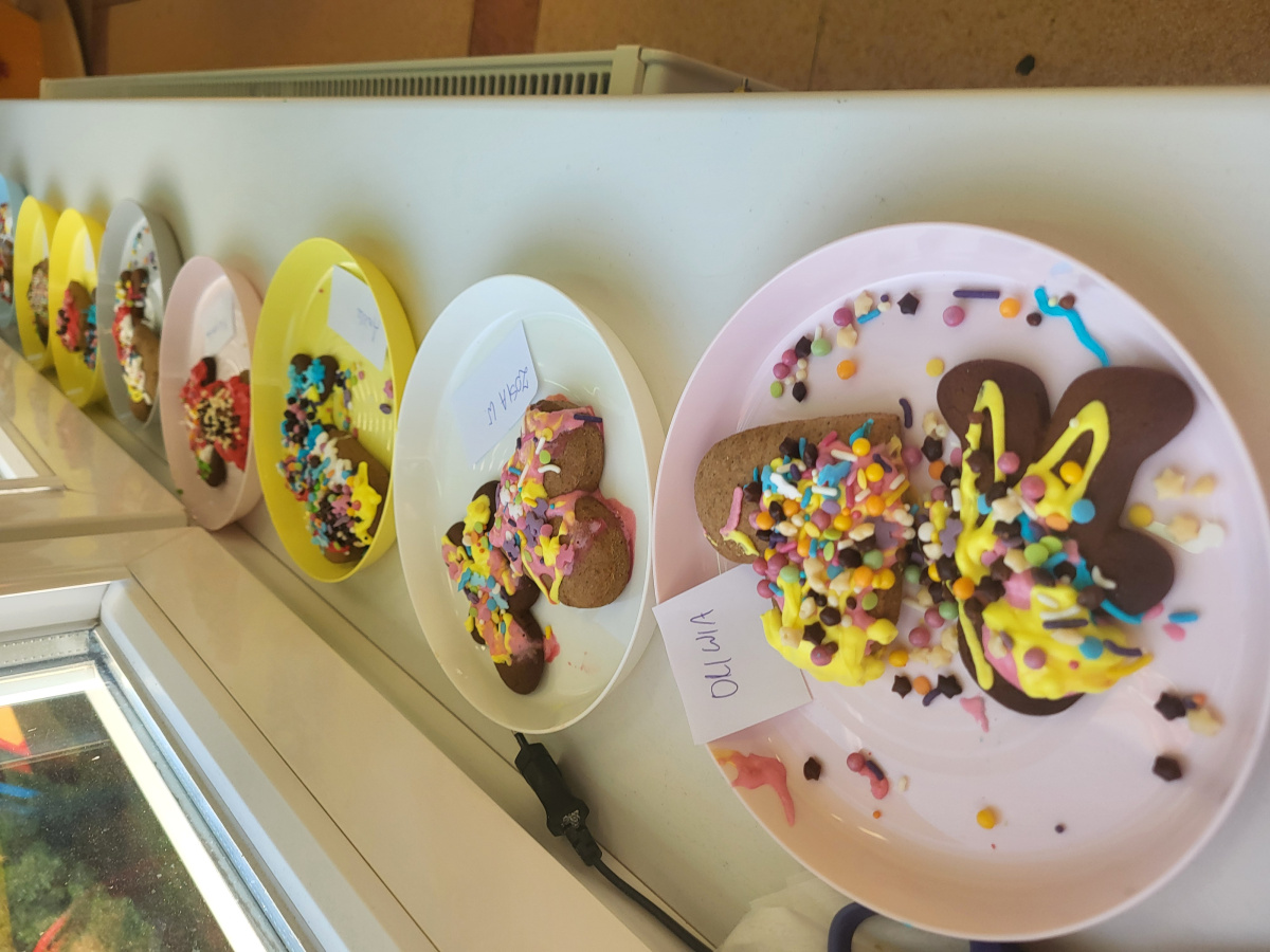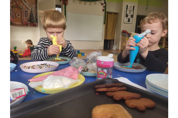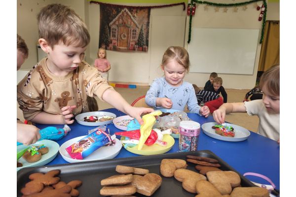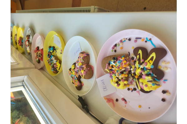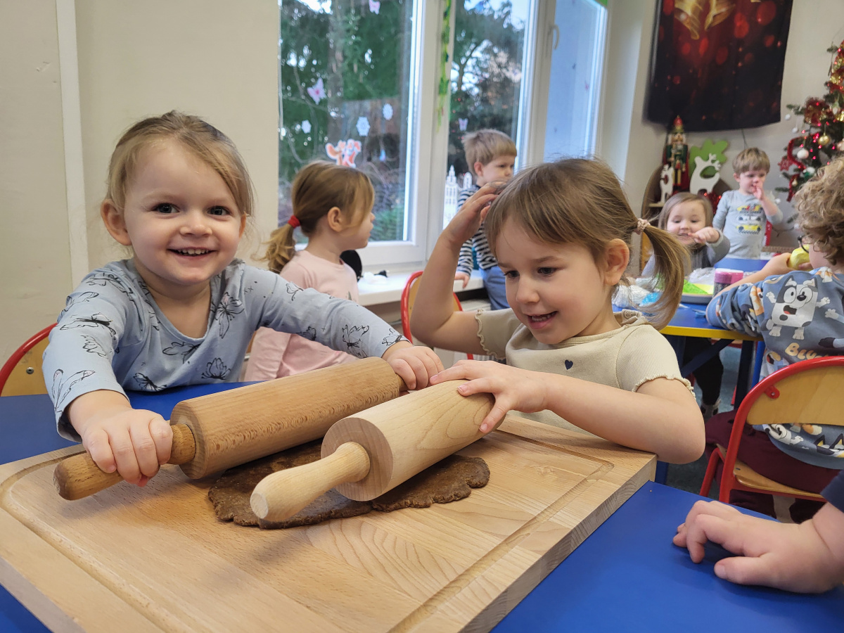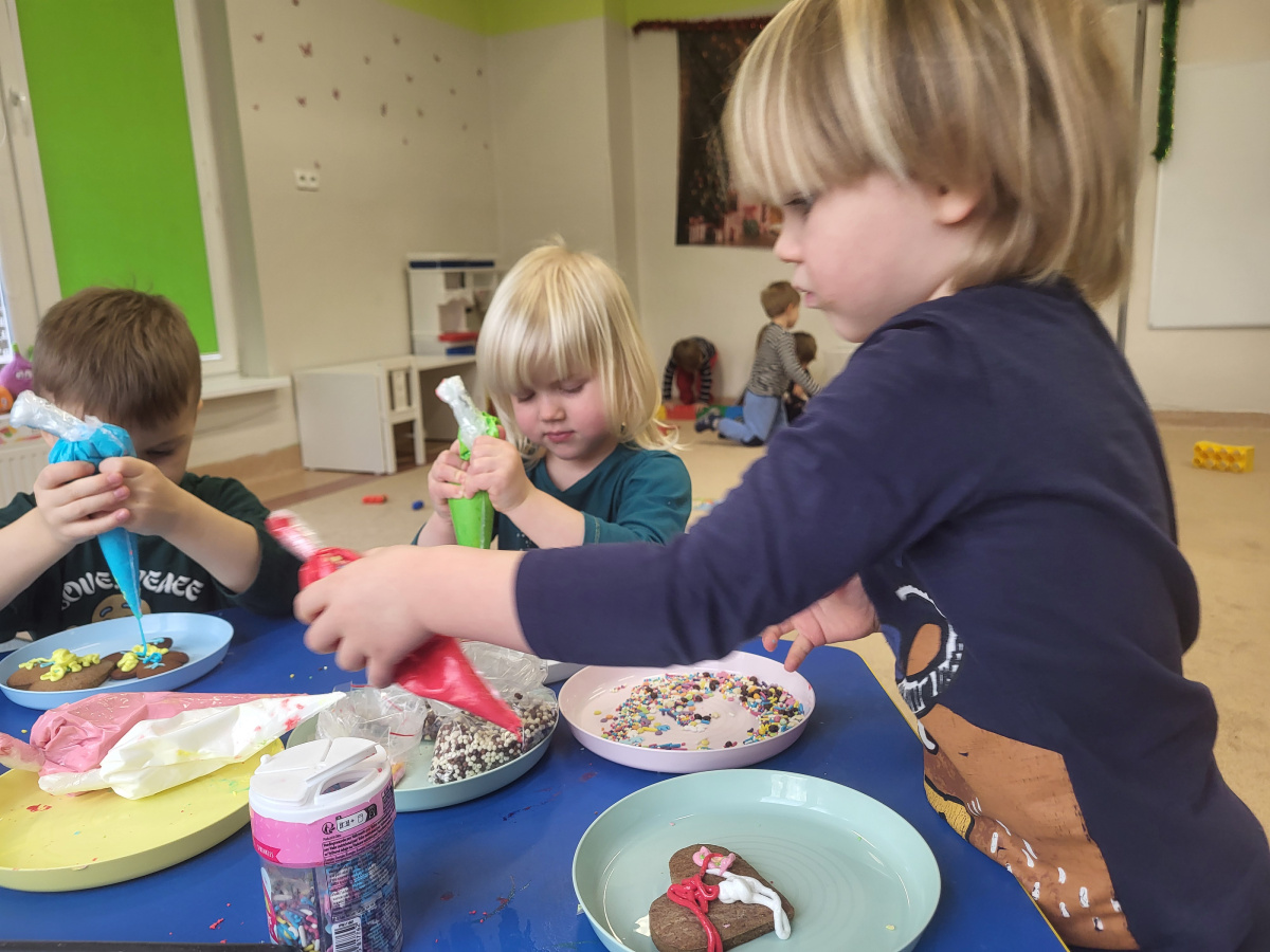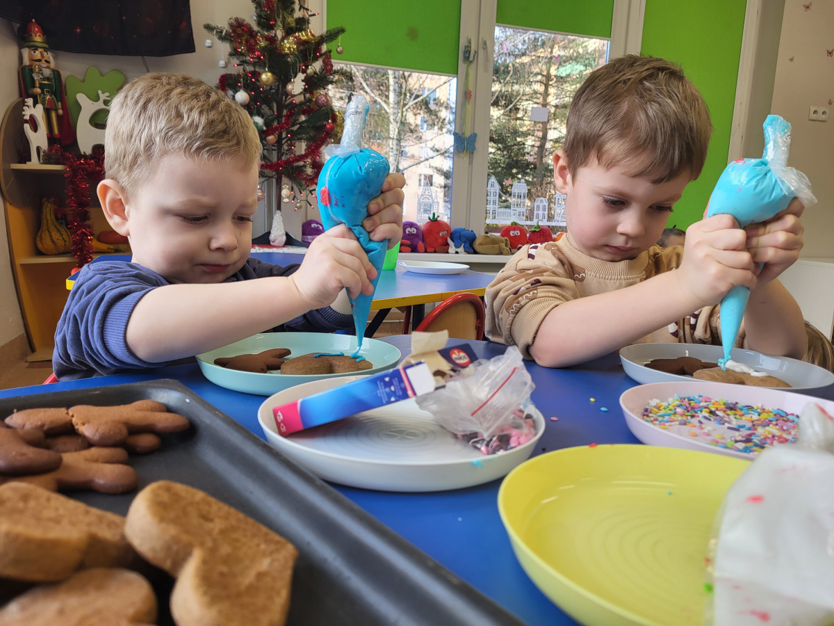 W grudniu dzieci z grupy „Motylki” wzięły udział w pachnących świętami zajęciach – pieczeniu pierniczków. Dzięki uprzejmości dziadka Anieli otrzymaliśmy ciasto piernikowe oraz gotowe, upieczone ciasteczka, które przedszkolaki mogły dekorować. Dzieci z radością wałkowały ciasto i wykrawały różne kształty pierniczków, świetnie się przy tym bawiąc. Przygotowane pierniczki dzieci zabrały do domu, a także były one pysznym deserem podczas przedszkolnej Wigilii. Serdecznie dziękujemy dziadkowi Anieli za ten słodki, świąteczny gest.