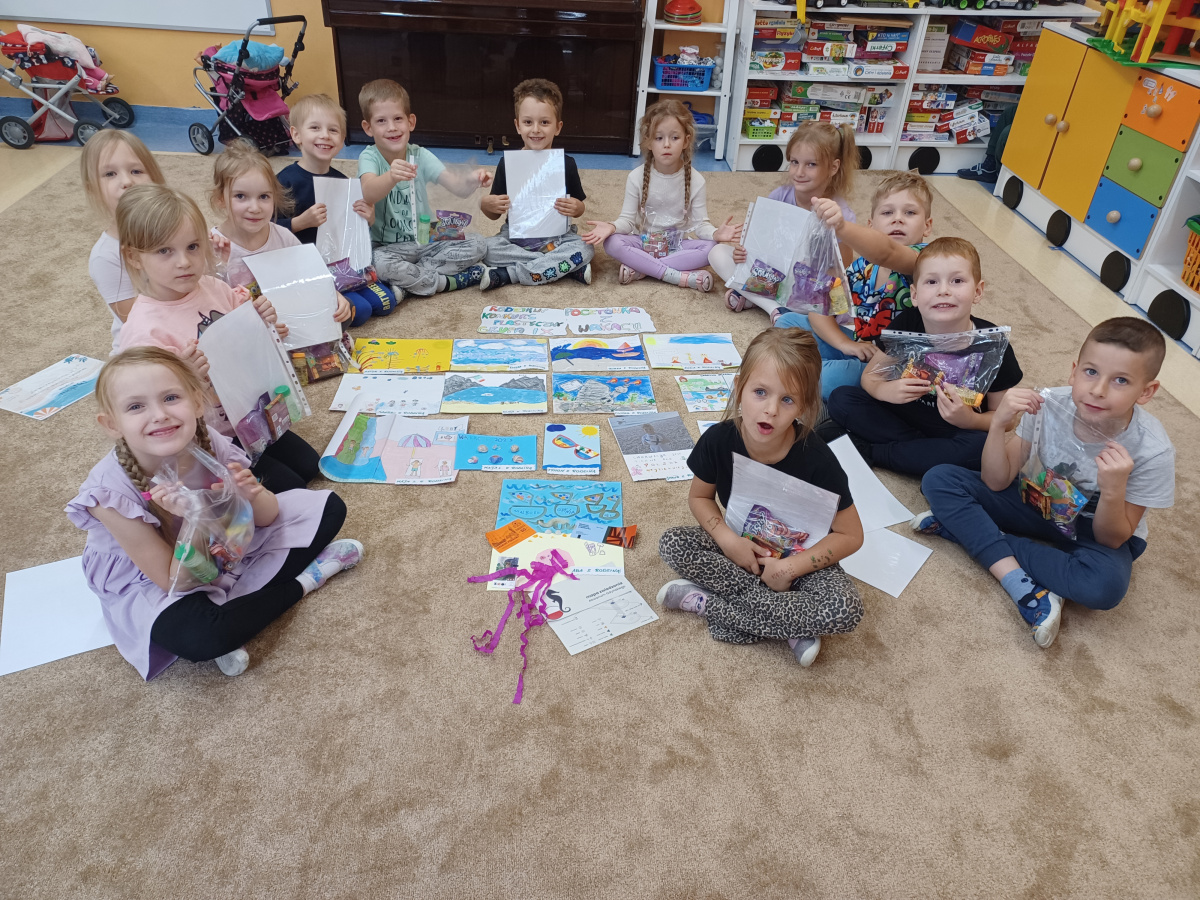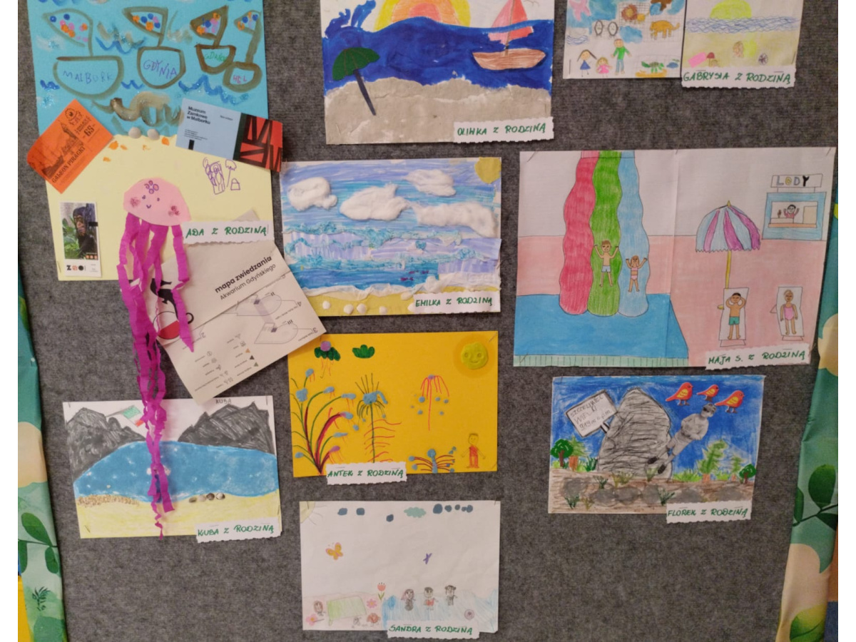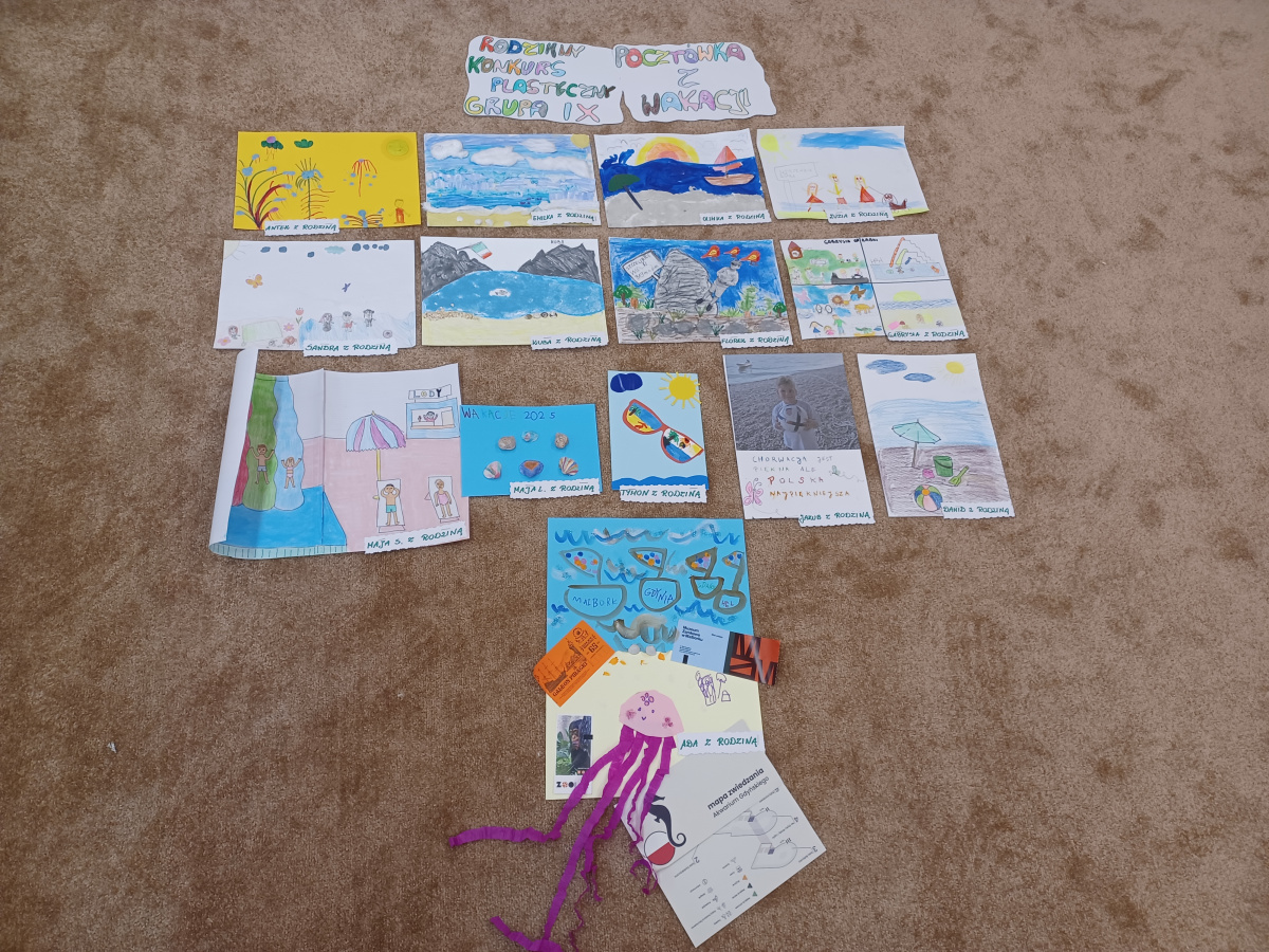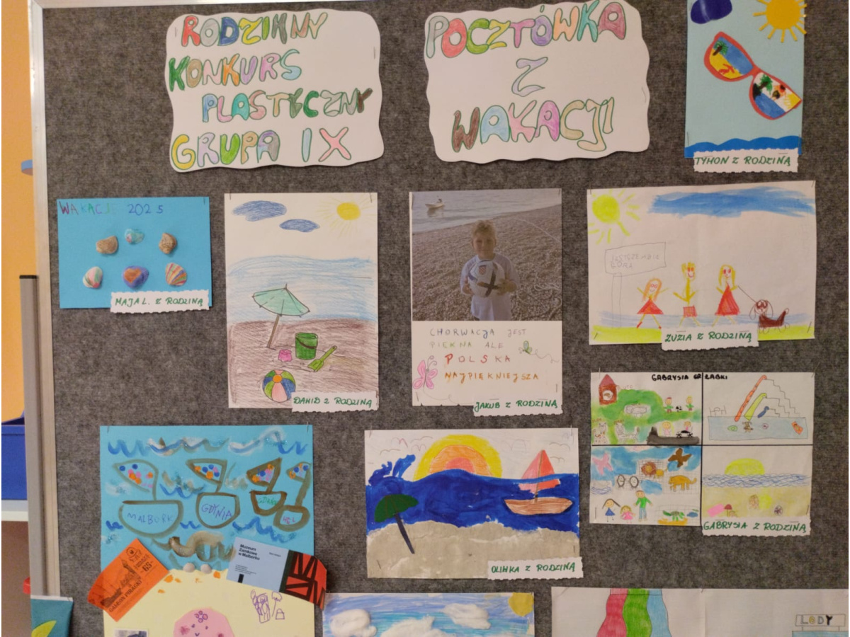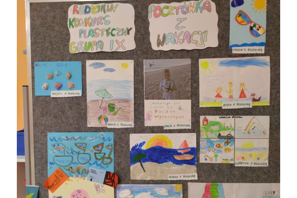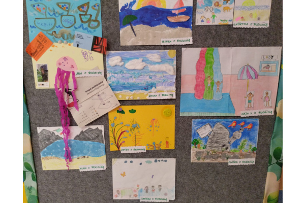 "Pocztówka z wakacji" to tytuł rodzinnego konkursu plastycznego organizowanego dla dzieci i rodziców z grupy "Żabek". Jak zawsze dzieci spisały się na medal i przyniosły do przedszkola piękne prace wykonane samodzielnie lub przy pomocy swoich najbliższych. Na uczestników czekały dyplomy i upominki. Gdzie przedszkolaki były na wakacjach? Odpowiedzi można poszukać oglądając prace konkursowe wyeksponowane w holu głównym przedszkola.
