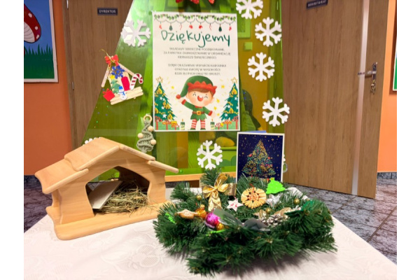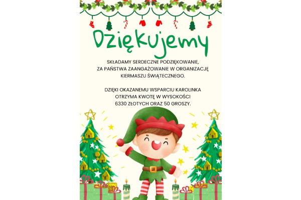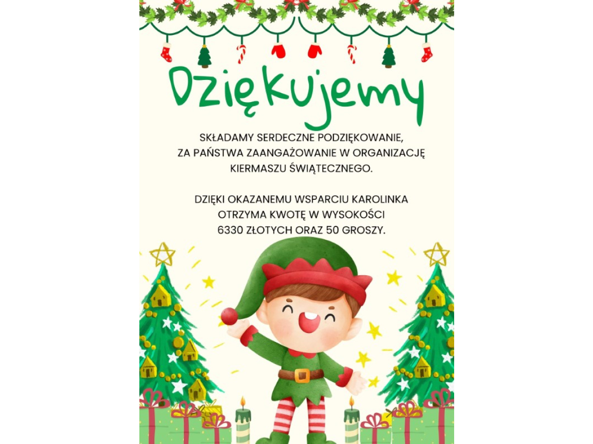 Pierwszy tydzień grudnia upłynął w naszym Przedszkolu pod szyldem "Kiermaszu Świątecznego dla Karolinki". Dzięki współpracy dzieci, rodziców, nauczycieli i pracowników przedszkola wszyscy odwiedzający przedszkole mogli kupić ręcznie wykonane ozdoby świąteczne w szczytnym celu.