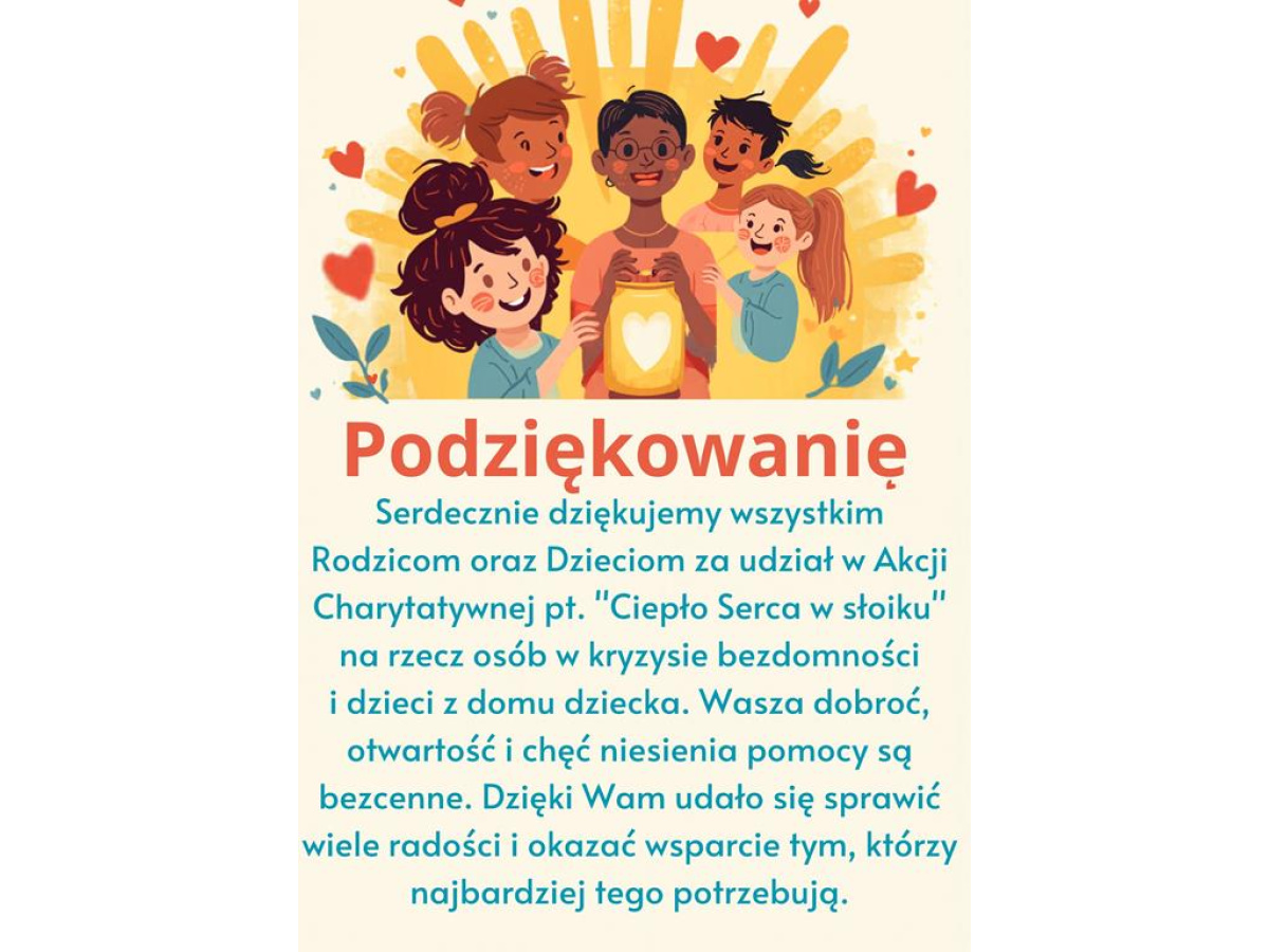 Serdecznie dziękujemy wszystkim Rodzicom oraz Dzieciom za zaangażowanie i udział w akcji charytatywnej "Ciepło Serca w słoiku" na rzecz osób w kryzysie bezdomności i dzieci z domu dziecka. Wasza dobroć, otwartość i chęć niesienia pomocy są bezcenne. Dzięki Wam udało się sprawić wiele radości i okazać wsparcie tym, którzy najbardziej tego potrzebują.