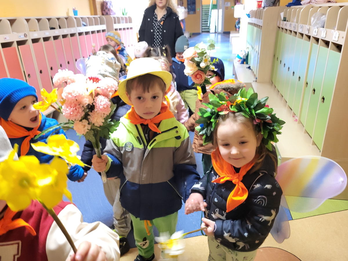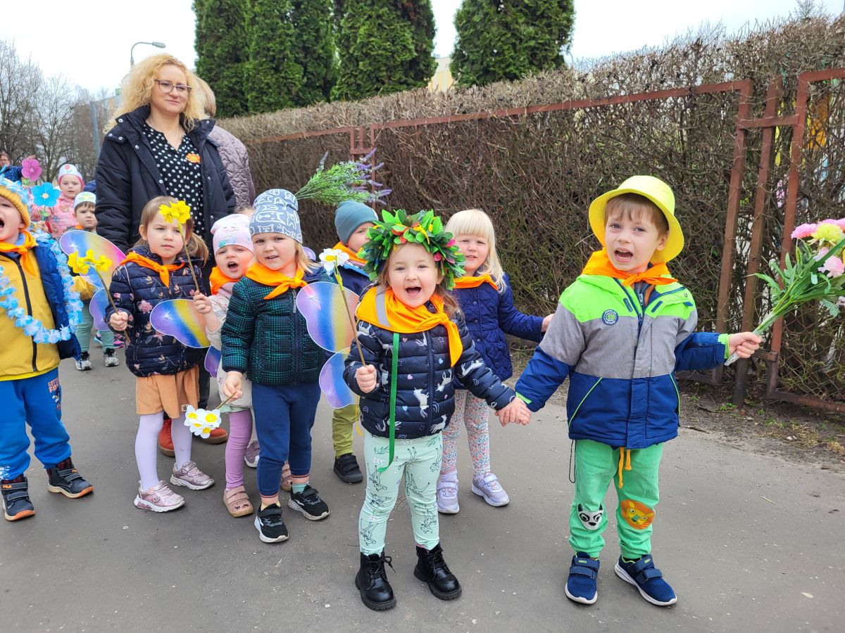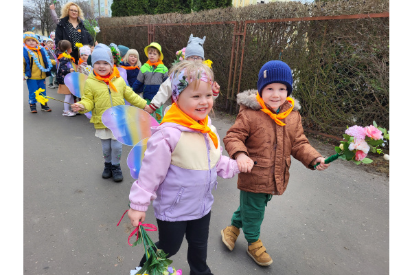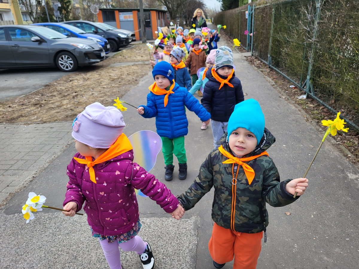 Dzieci z grupy „Motylki” radośnie obchodziły Pierwszy Dzień Wiosny. Z tej okazji wybrały się na spacer poza teren przedszkola, trzymając w rączkach kolorowe kwiaty i wiosenne ozdoby przygotowane przez rodziców, witając nadchodzącą porę roku. Każde dziecko otrzymało także od pani Gosi wiosenny akcent w postaci gałązki żonkila, a wspólne śpiewanie piosenek wprowadziło wszystkich w radosny nastrój. Dodatkowo przedszkolaki obejrzały występ starszej grupy „Zajączki”, która zaprezentowała przedstawienie o tematyce wiosennej.
