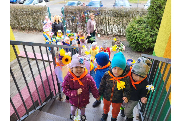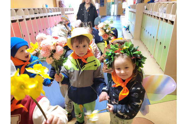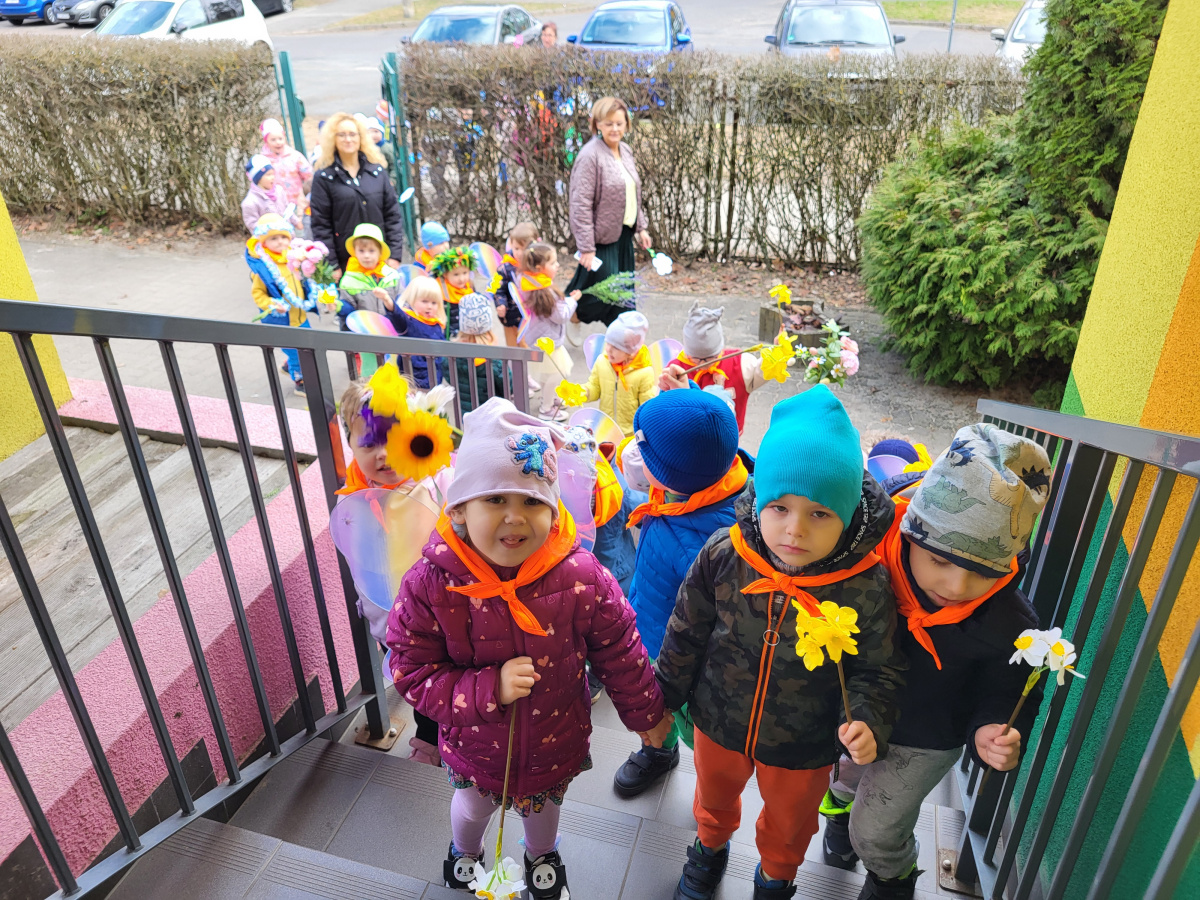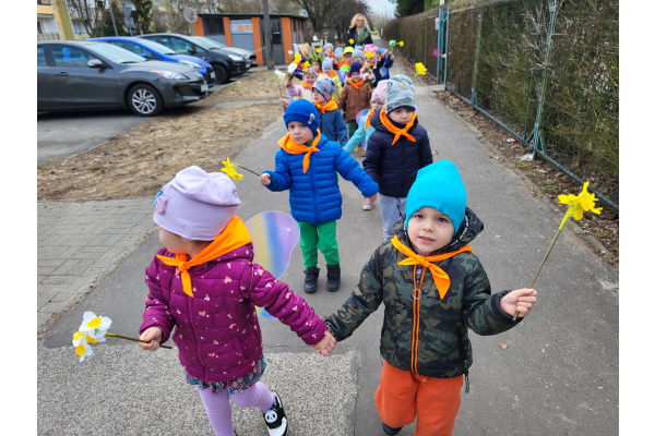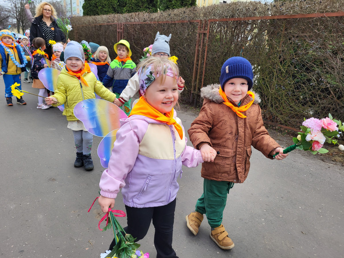 Dzieci z grupy „Motylki” radośnie obchodziły Pierwszy Dzień Wiosny. Z tej okazji wybrały się na spacer poza teren przedszkola, trzymając w rączkach kolorowe kwiaty i wiosenne ozdoby przygotowane przez rodziców, witając nadchodzącą porę roku. Każde dziecko otrzymało także od pani Gosi wiosenny akcent w postaci gałązki żonkila, a wspólne śpiewanie piosenek wprowadziło wszystkich w radosny nastrój. Dodatkowo przedszkolaki obejrzały występ starszej grupy „Zajączki”, która zaprezentowała przedstawienie o tematyce wiosennej.
