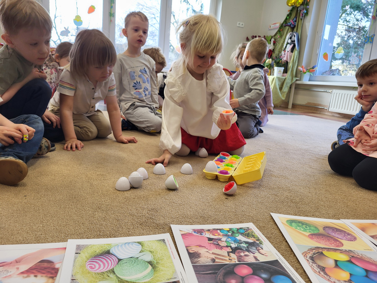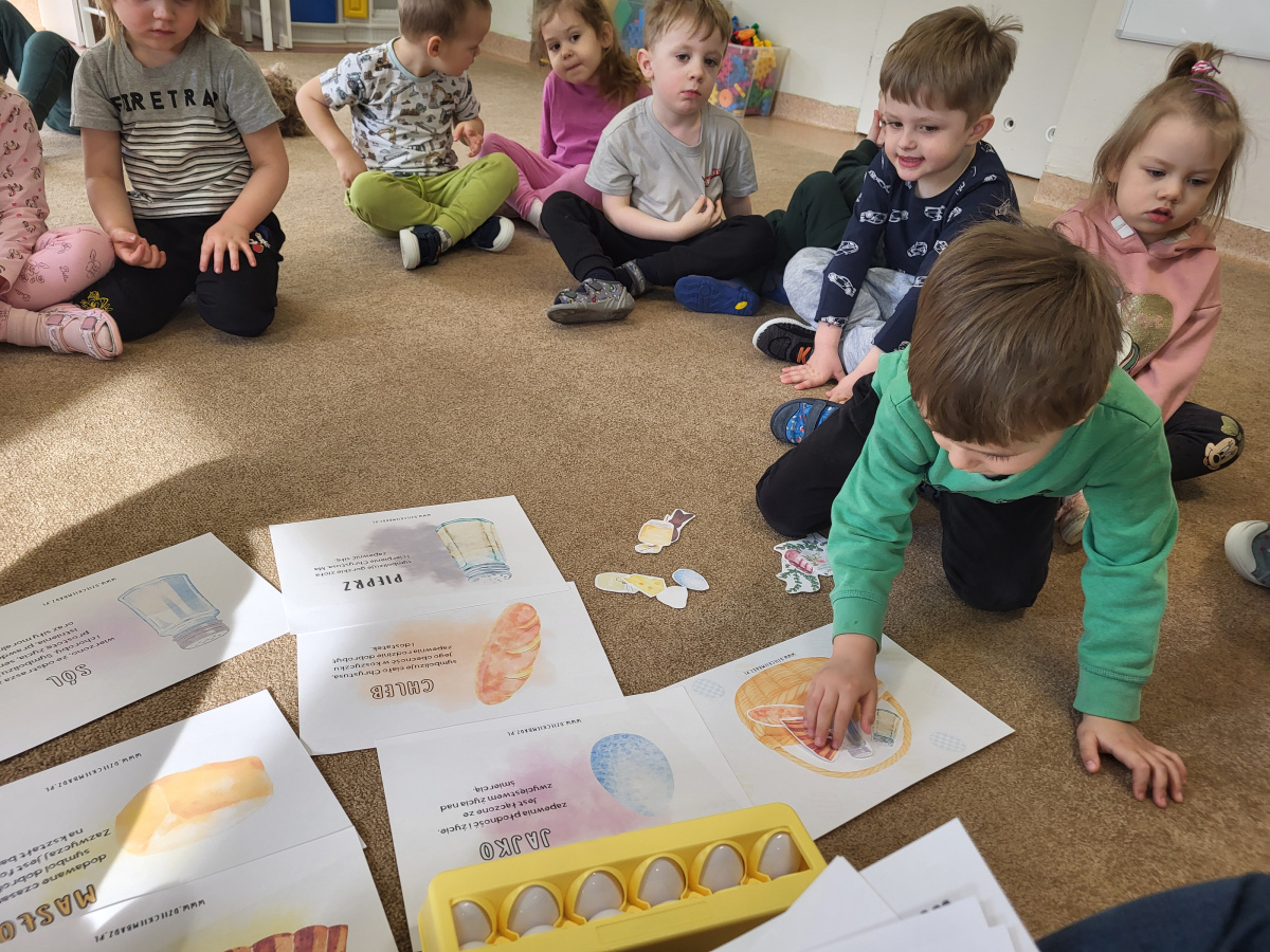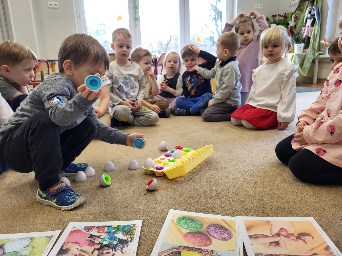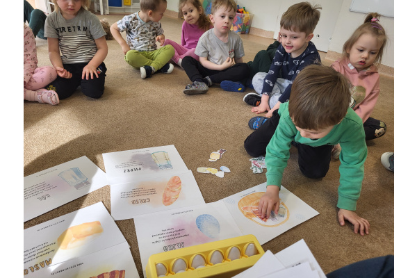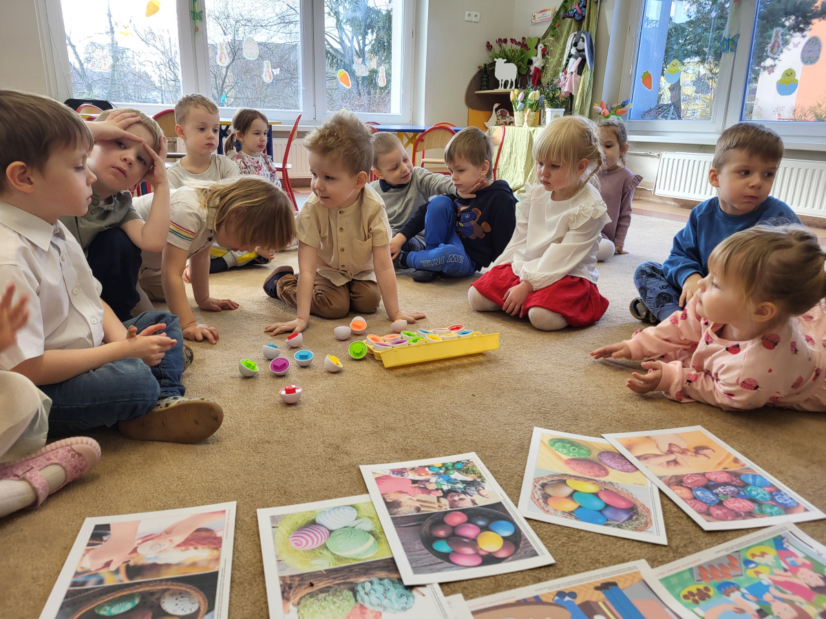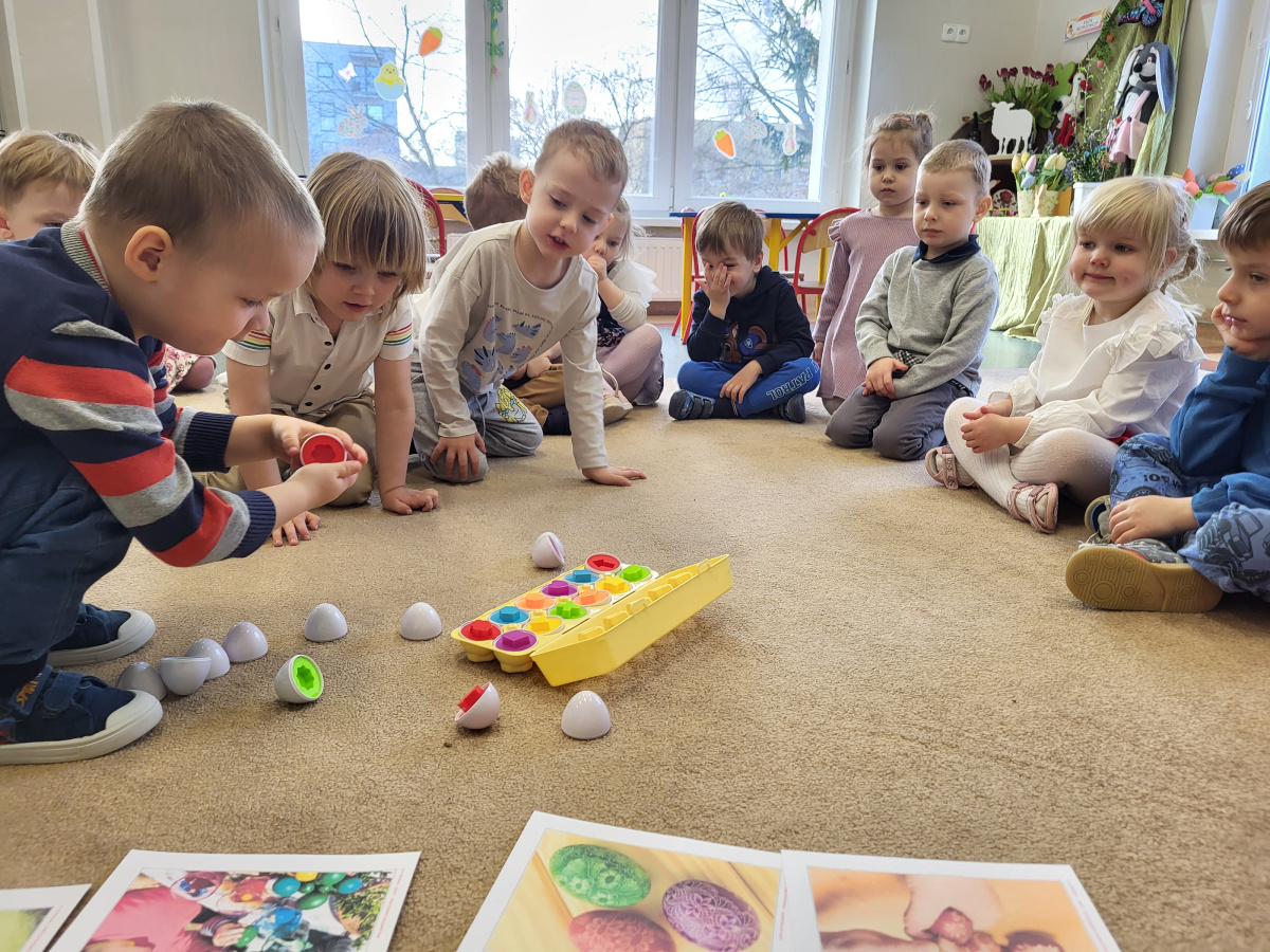Dzieci z grupy „Motylki” poznawały tradycje wielkanocne. Przedszkolaki dowiedziały się, co wkładamy do świątecznego koszyczka oraz jakie zwyczaje i potrawy towarzyszą Wielkanocy. Podczas zajęć dzieci odkrywały także kolory i kształty, korzystając z edukacyjnych, kolorowych jajek. Był to czas pełen ciekawych odkryć, który wprowadził wszystkich w świąteczny nastrój.