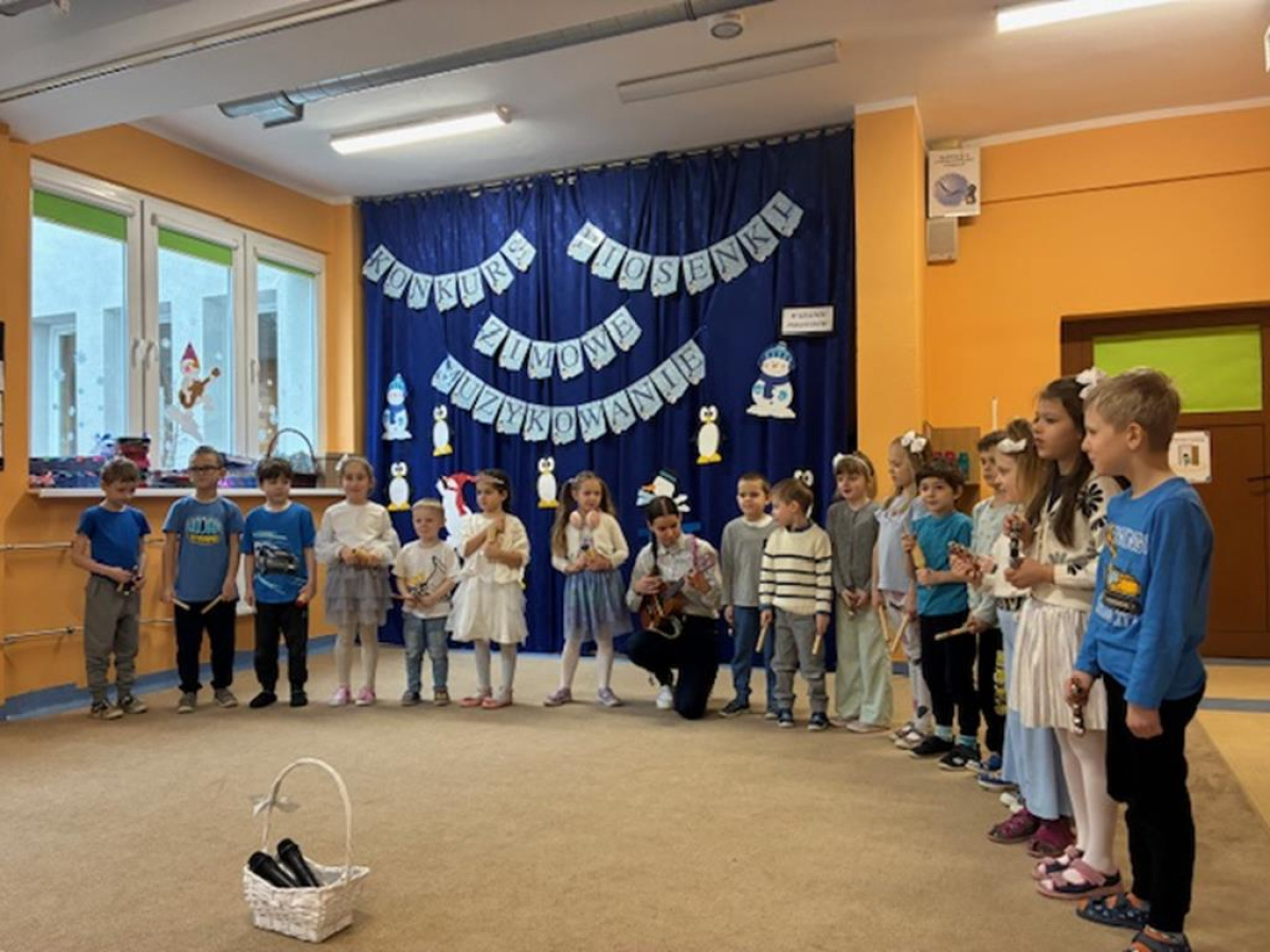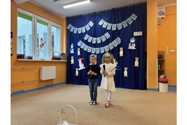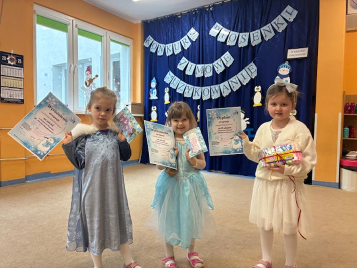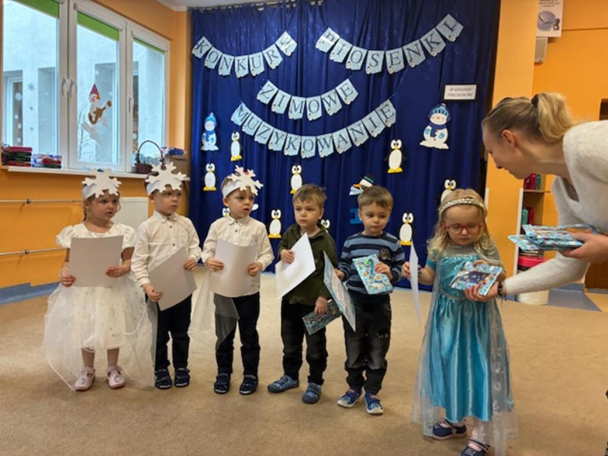 W czwartek 19. lutego w naszym przedszkolu odbył się Konkurs Piosenki "Zimowe Muzykowanie". W konkursie wzięli udział przedstawiciele każdej z grup. Wszystkie dzieci były pięknie przygotowane, wspaniale śpiewały, a w przedszkolu zapanował iście zimowy klimat. Jury długo obradowało nad przyznaniem nagród, ponieważ miało niełatwy orzech do zgryzienia. Imprezę umiliły nam dodatkowo występy dzieci z grupy "Liski" oraz "Kreciki". Ostatecznie wyłoniono I,II i III miejsce w kategoriach wiekowych 3-4latków oraz 5-6latków. Pozostałe dzieci biorące udział w konkursie otrzymały wyróżnienia. Wszystkim przedszkolakom biorącym udział w "Zimowym muzykowaniu" gratulujemy wspaniałych występów oraz niemałej odwagi podczas popisów przed tak dużą publicznością!