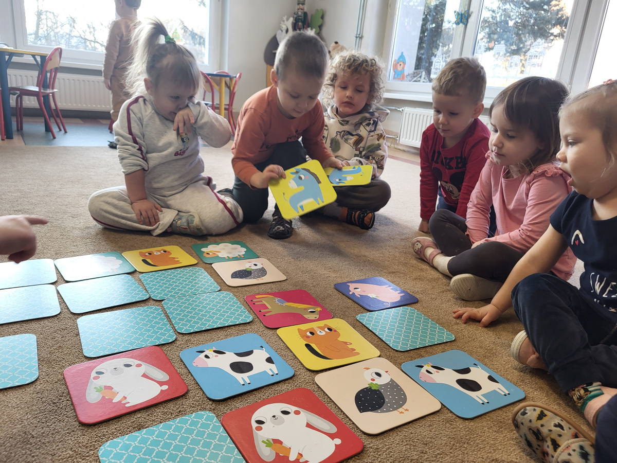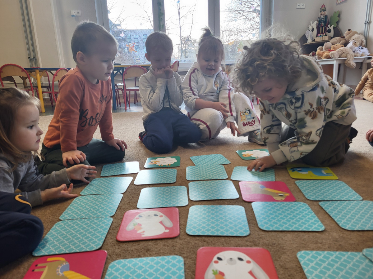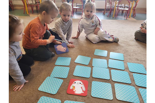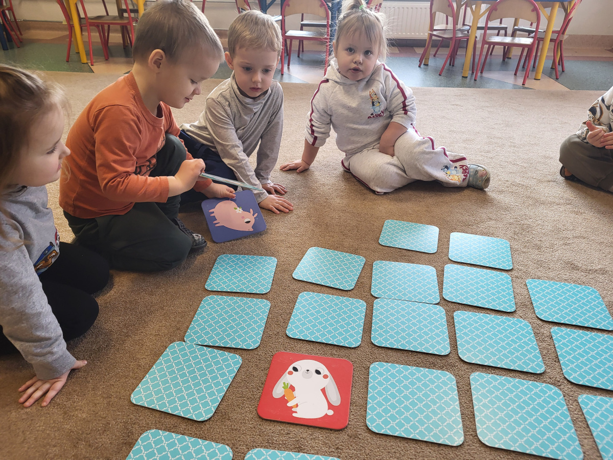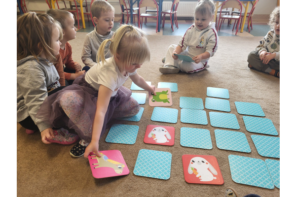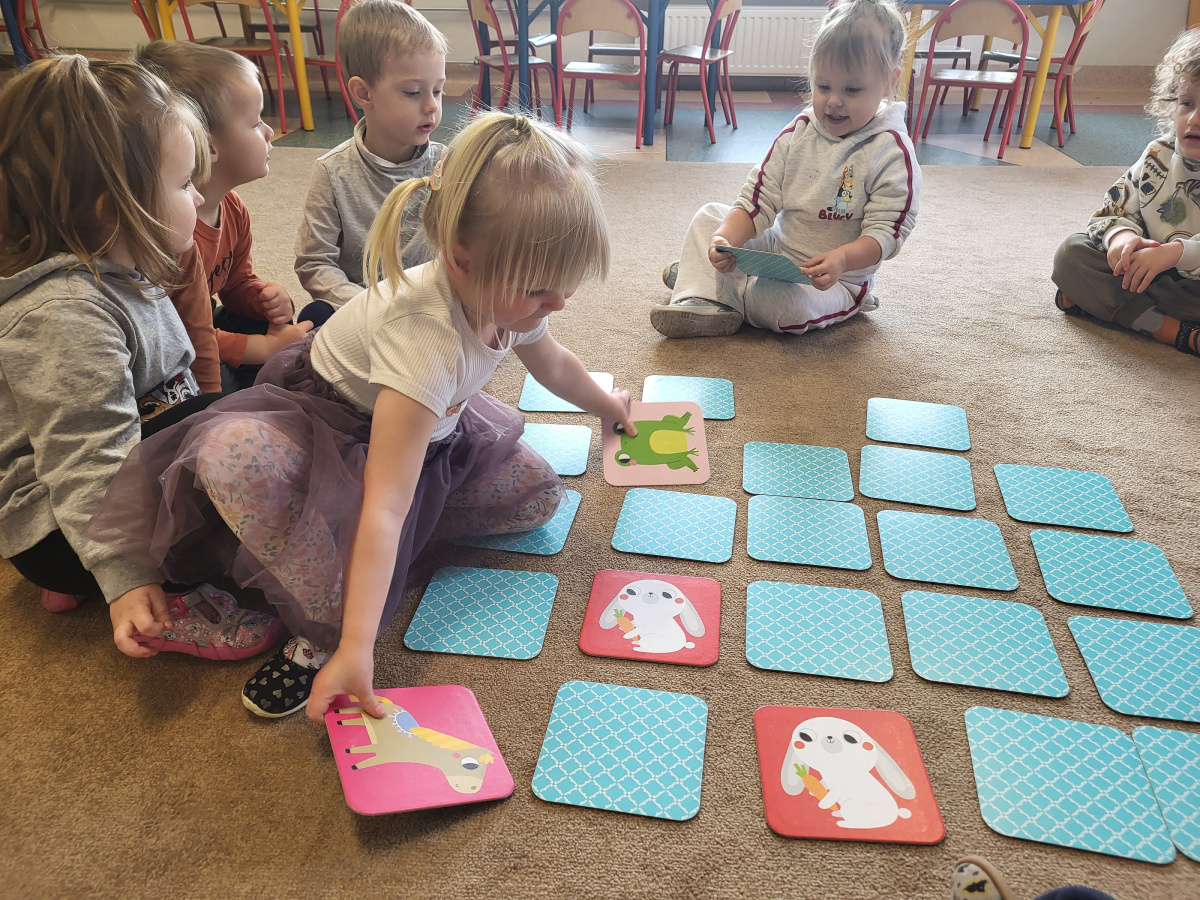 Dzieci z grupy „Motylki” uczyły się grać w grę „Memory”, podczas której wyszukiwały różne zwierzątka. Zabawa sprawiła im wiele radości, a dzieci bardzo dobrze radziły sobie z wykonywaniem zadania. Zajęcia rozwijały spostrzegawczość i koncentrację.