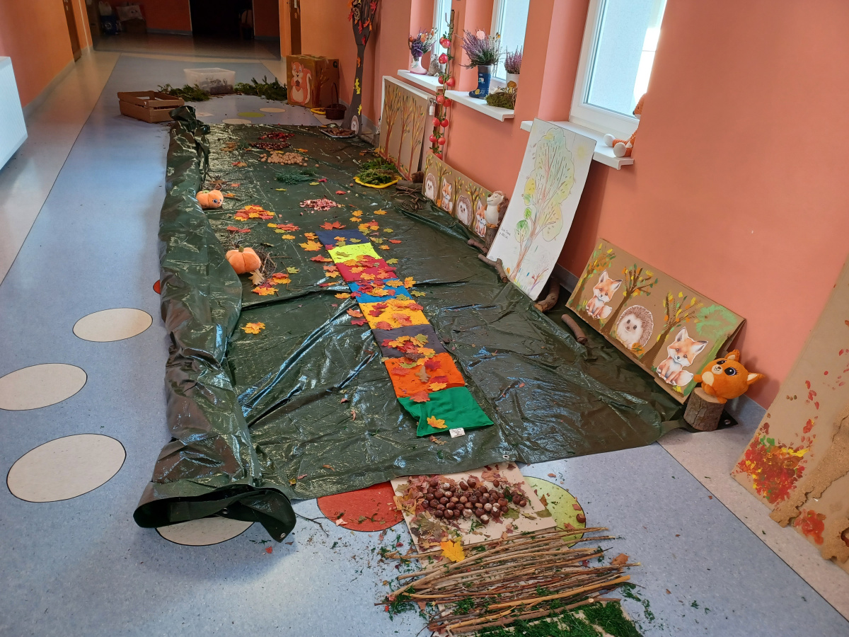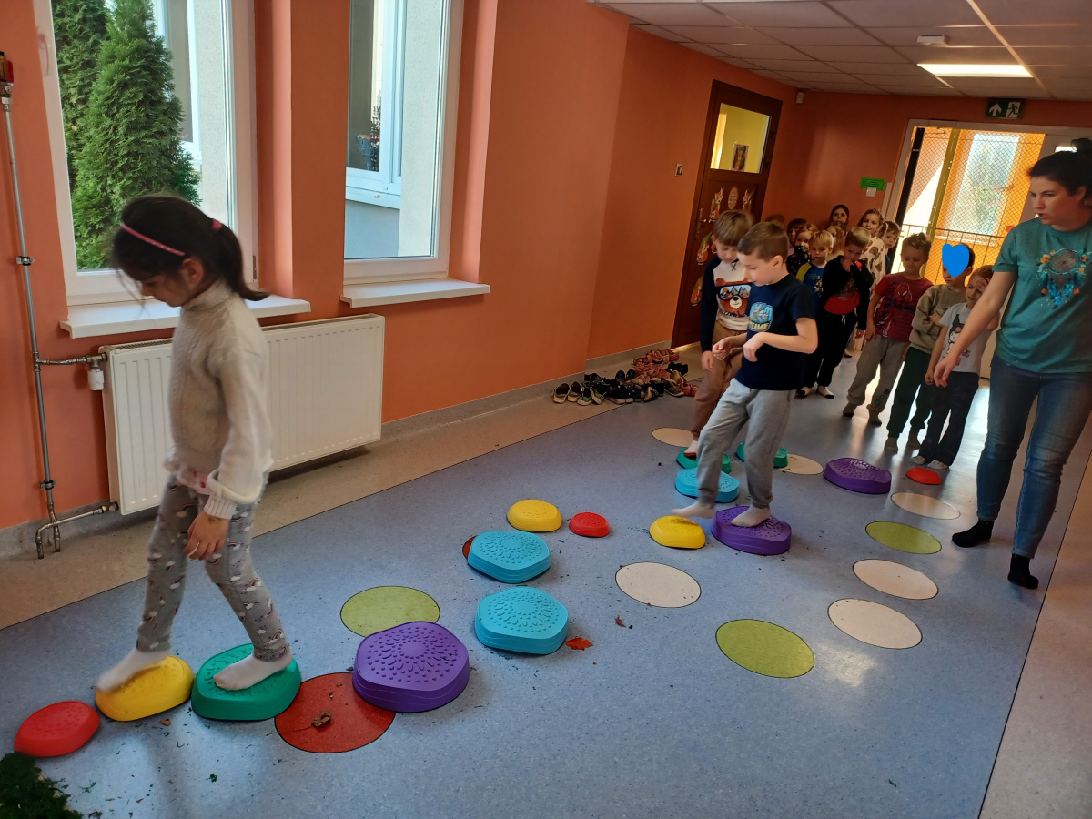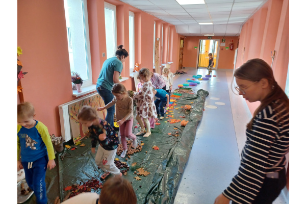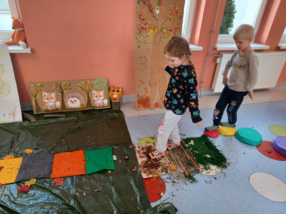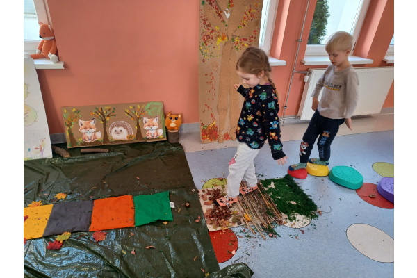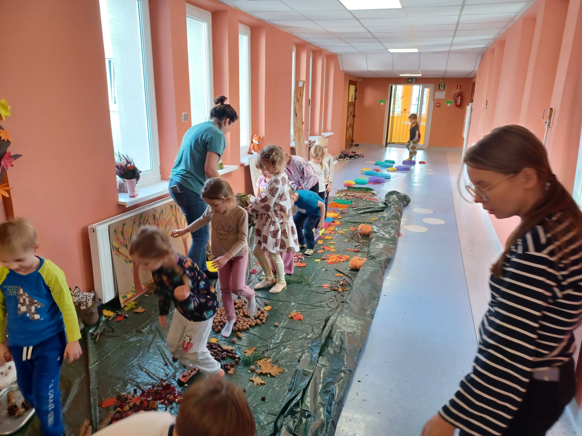 W przedszkolu zorganizowano Jesienną Ścieżkę Sensoryczną, która była wykonana z darów jesieni. Była to doskonała okazja do stymulacji zmysłówz rozwoju koordynacji wzrokowo-ruchowej, równowagi, a także wspieranie intergracji sensorycznej. Dzieci bawiły się doskonale, miały przy ty wiele radości.