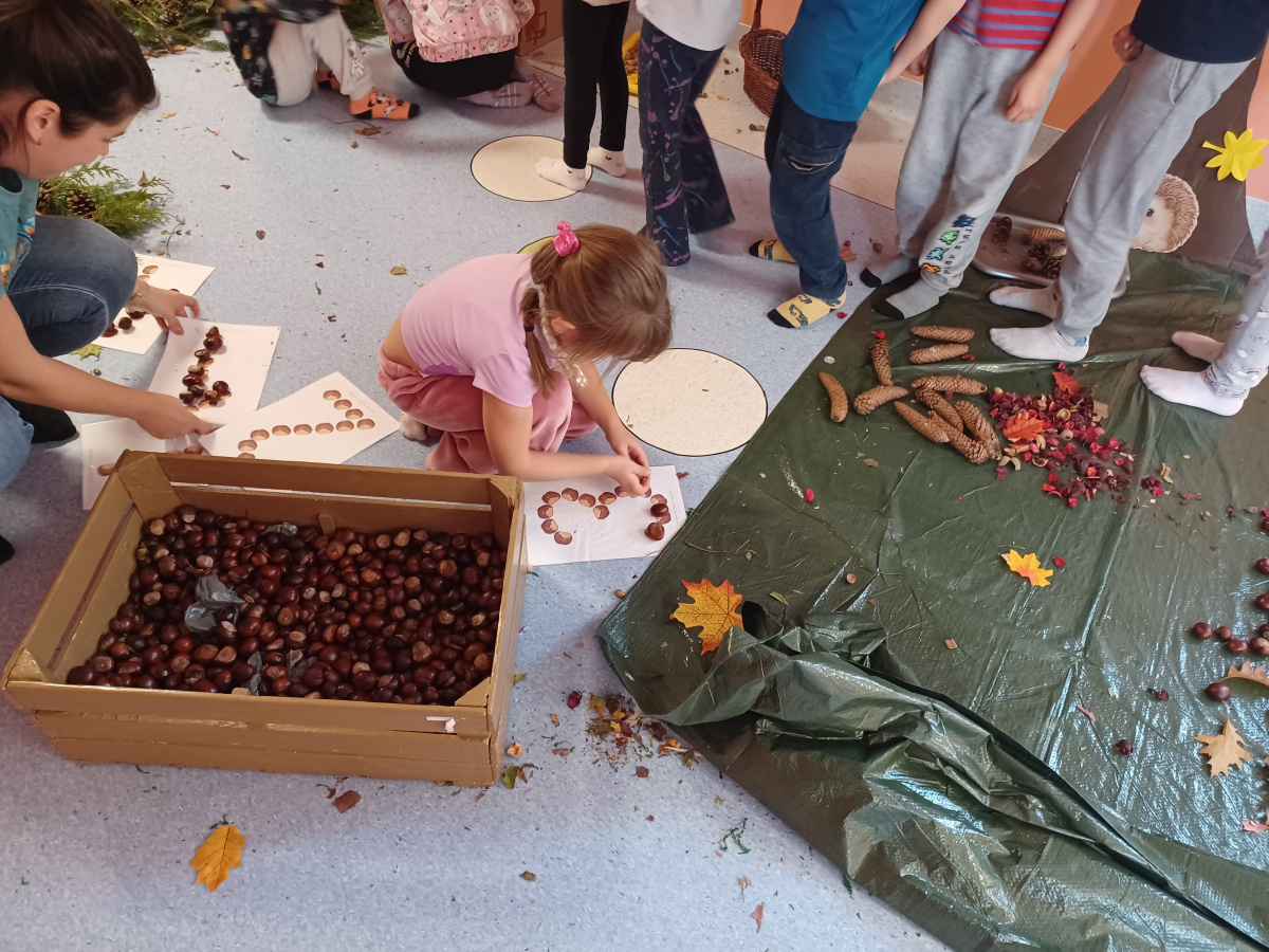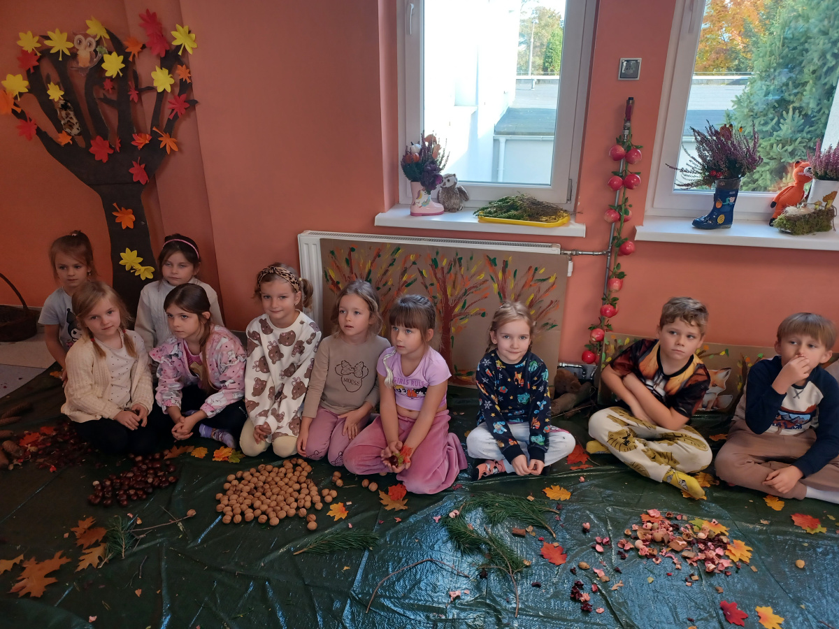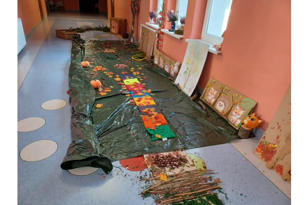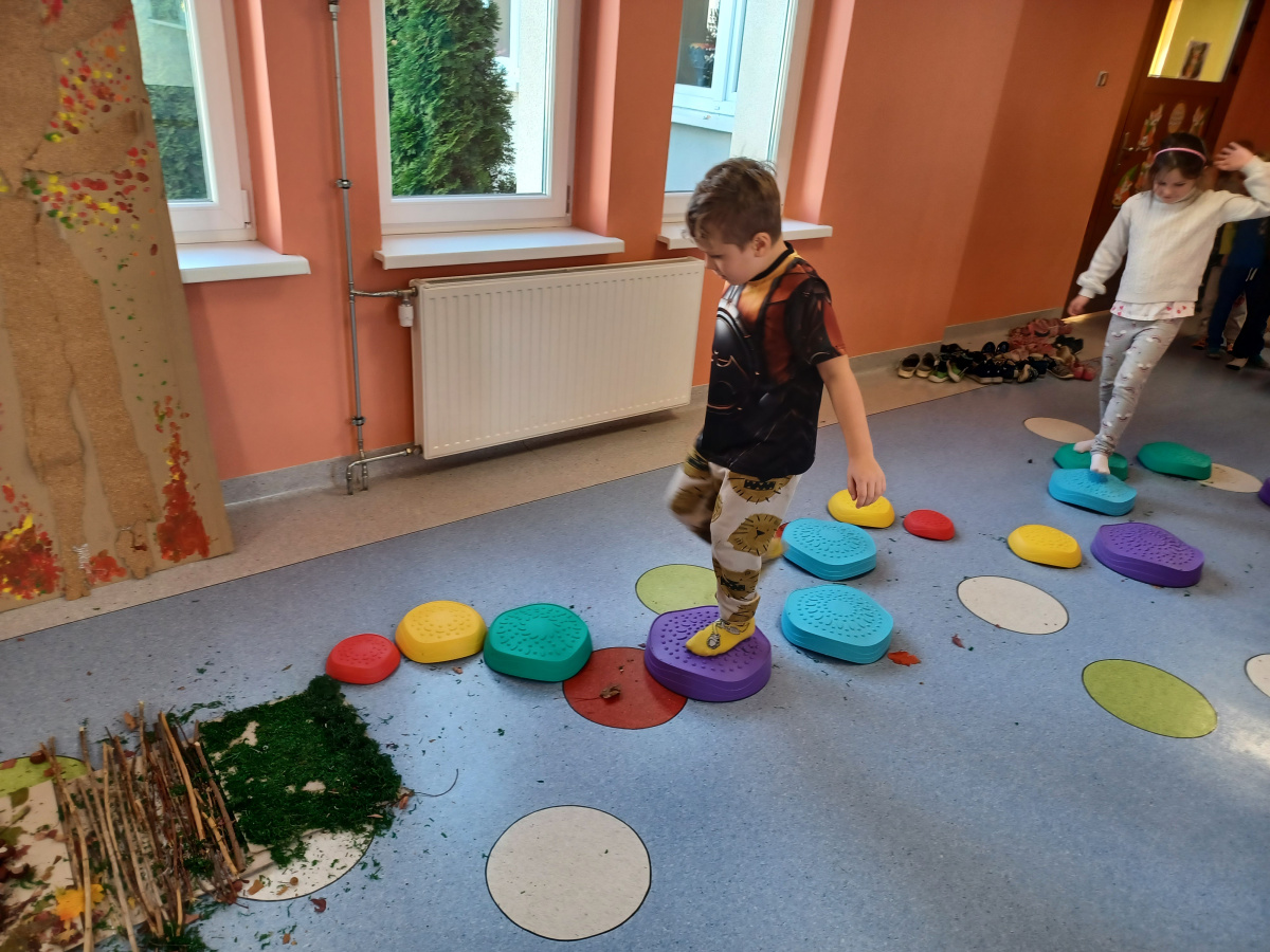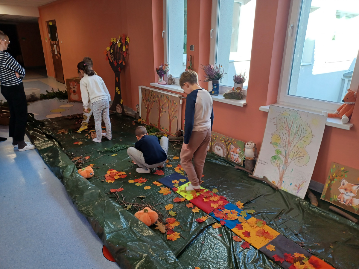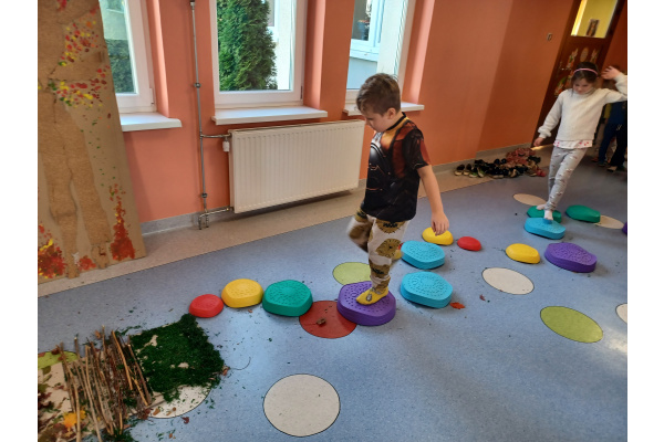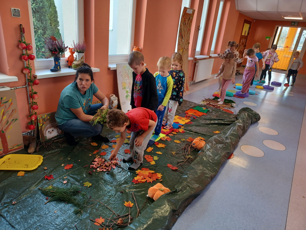 W przedszkolu zorganizowano Jesienną Ścieżkę Sensoryczną, która była wykonana z darów jesieni. Była to doskonała okazja do stymulacji zmysłówz rozwoju koordynacji wzrokowo-ruchowej, równowagi, a także wspieranie intergracji sensorycznej. Dzieci bawiły się doskonale, miały przy ty wiele radości.