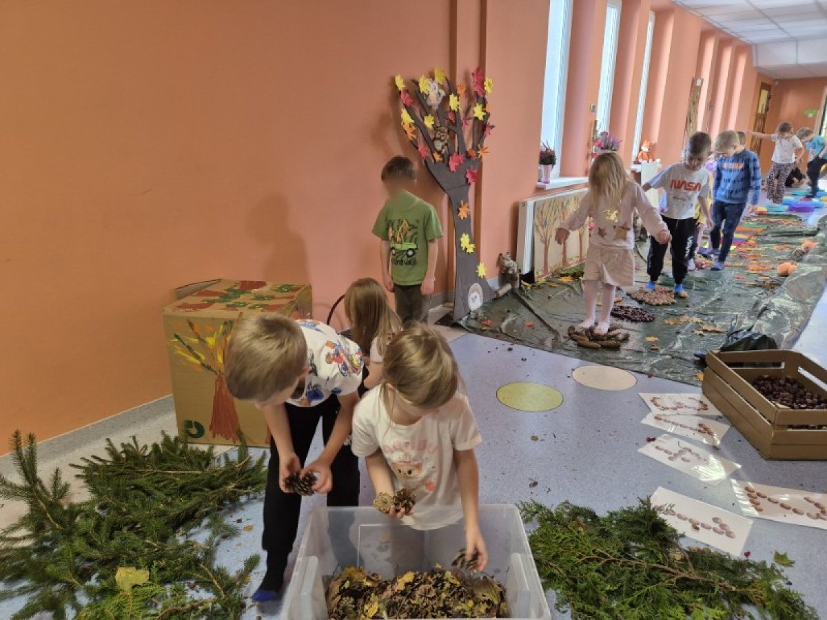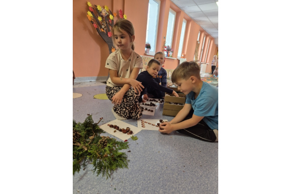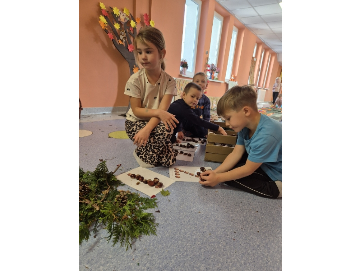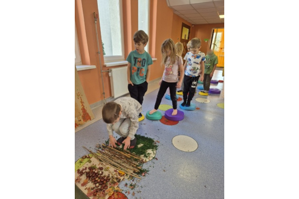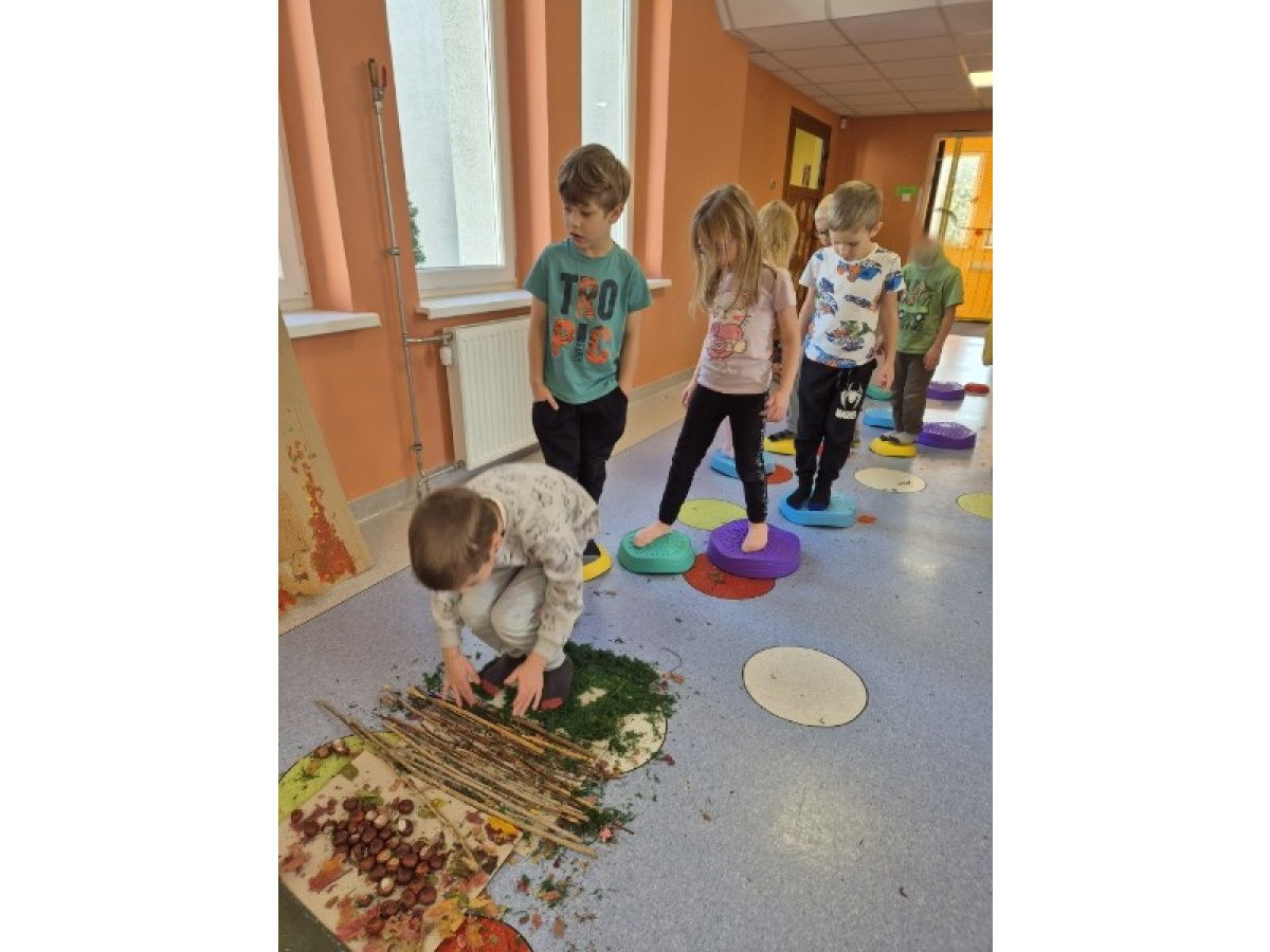 Świetliki codziennie przyglądają się zmianom zachodzącym w przyrodzie. Jesień to pora roku, która maluje świat wspaniałymi kolorami, jak również wiele może nam ofiarować. Od kilku dni zbieraliśmy wszelkie dary jesieni. Kasztany, orzechy, szyszki, liście... Wszystko to okazało się drogocennymi skarbami, dzięki którym w pochmurny dzień mogliśmy stworzyć w przedszkolu własną jesienną ścieżkę sensoryczną.